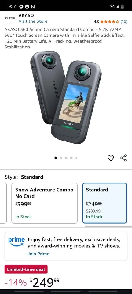AKASO 360 Action Camera Standard Combo - 5.7K 72MP 360° Touch Screen Camera with Invisible Selfie Stick Effect, 120 Min Battery Life, AI Tracking, Weatherproof, Stabilization