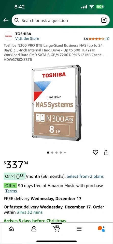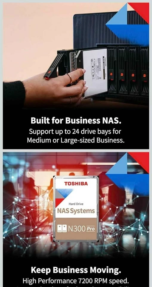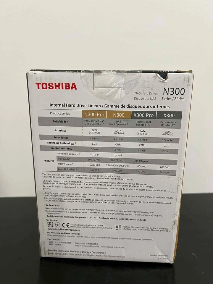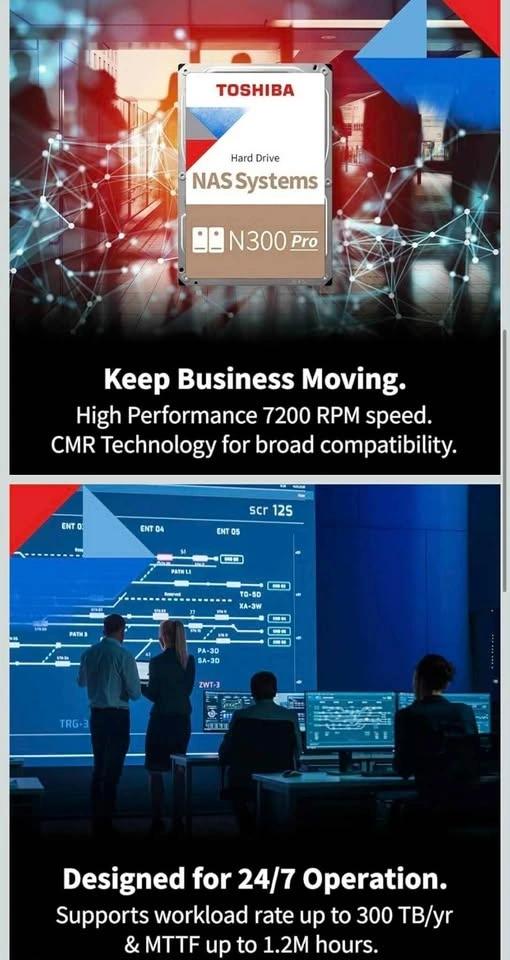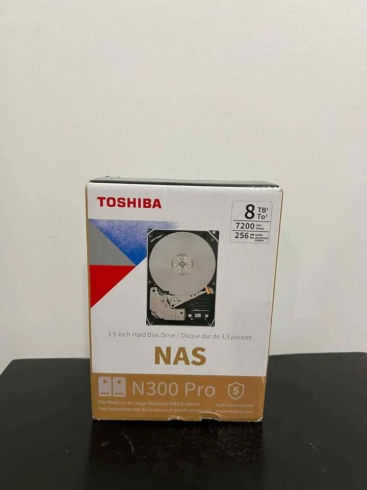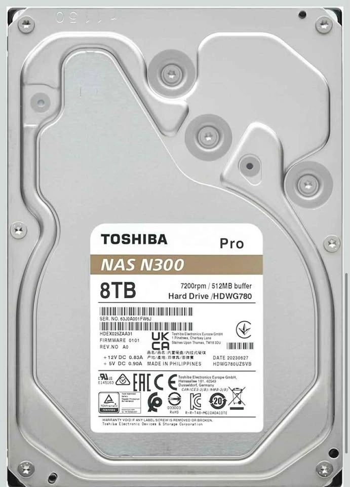 Toshiba N300 PRO 8TB Large-Sized Business NAS (up to 24 Bays) 3.5-Inch Internal Hard Drive - Up to 300 TB/Year Workload Rate CMR SATA 6 GB/s 7200 RPM 512 MB Cache - HDWG780XZSTB