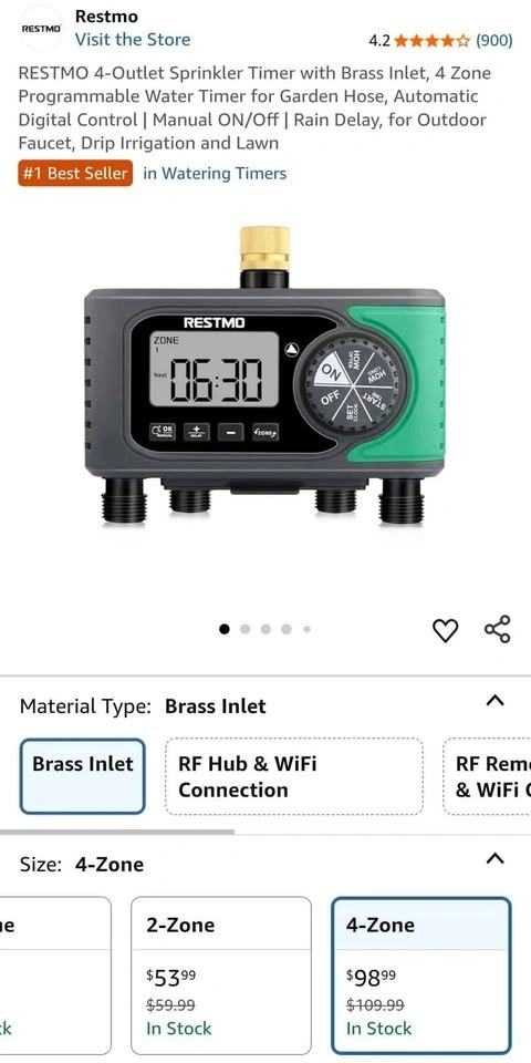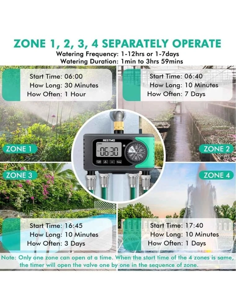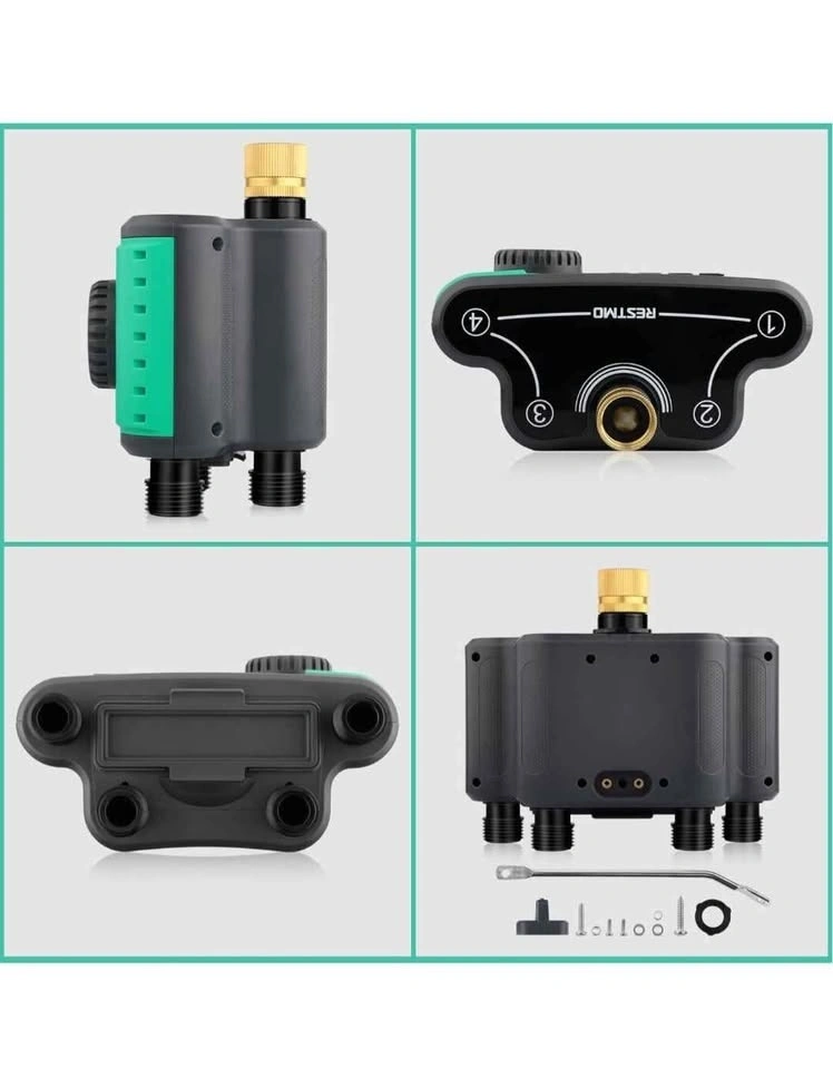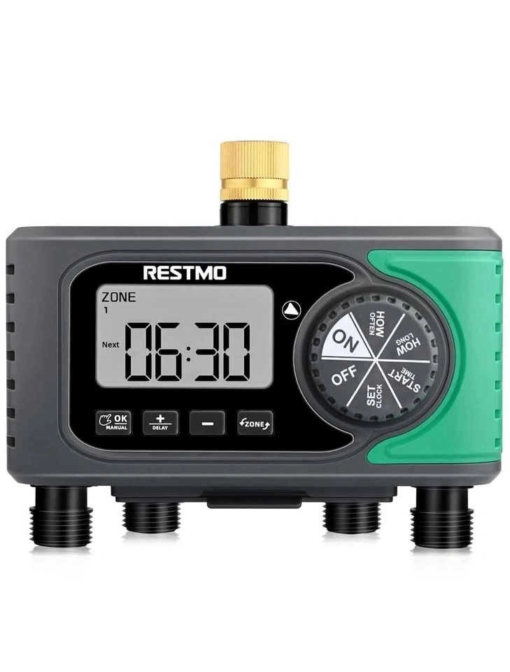 RESTMO 4-Outlet Sprinkler Timer with Brass Inlet, 4 Zone Programmable Water Timer for Garden Hose, Automatic Digital Control | Manual ON/Off | Rain Delay, for Outdoor Faucet, Drip Irrigation and Lawn