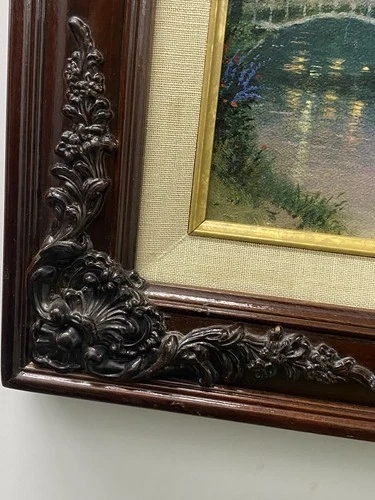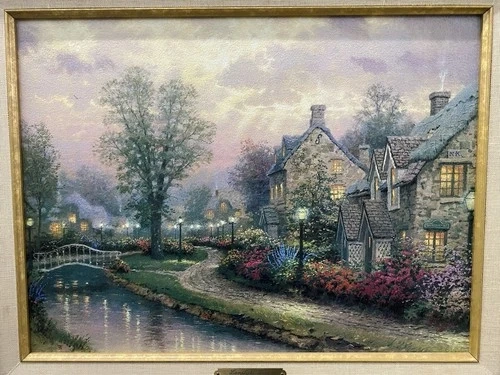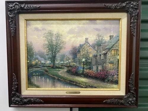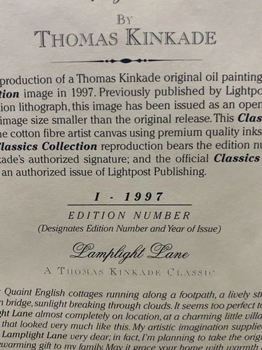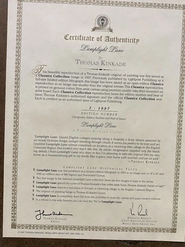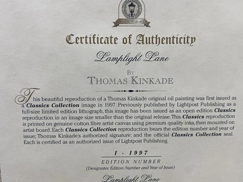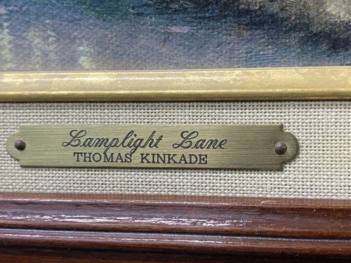 The Lamplight Lane Classic Collection image from 1997 is a framed modern reproduction by artist Thomas Kinkade. This open edition Classics reproduction showcases the picturesque scene of Lamplight Lane, capturing the essence of a quaint and charming street illuminated by lamplights. Made in the United States, this modified item is a timeless piece that brings a touch of nostalgia and beauty to any space.