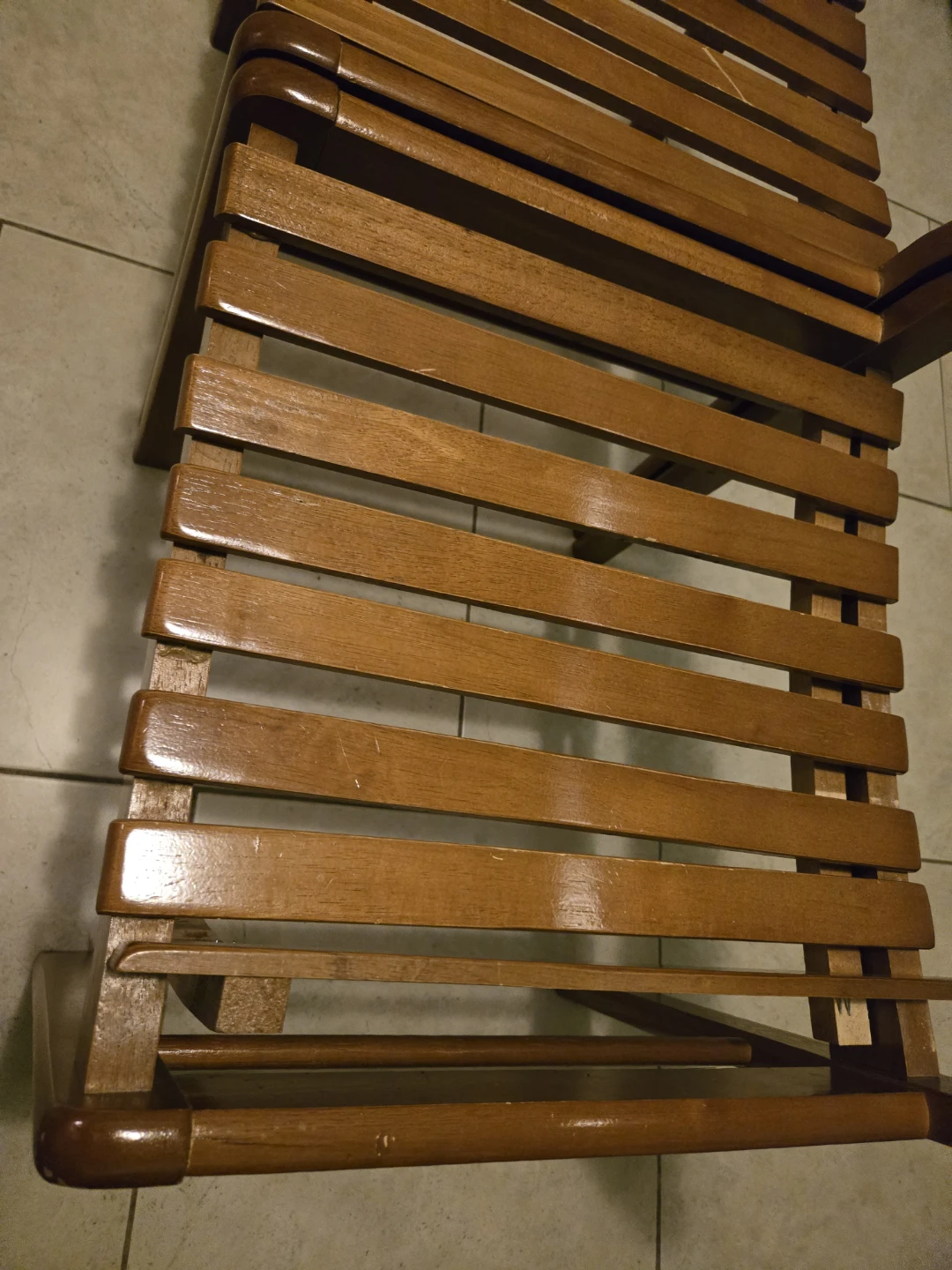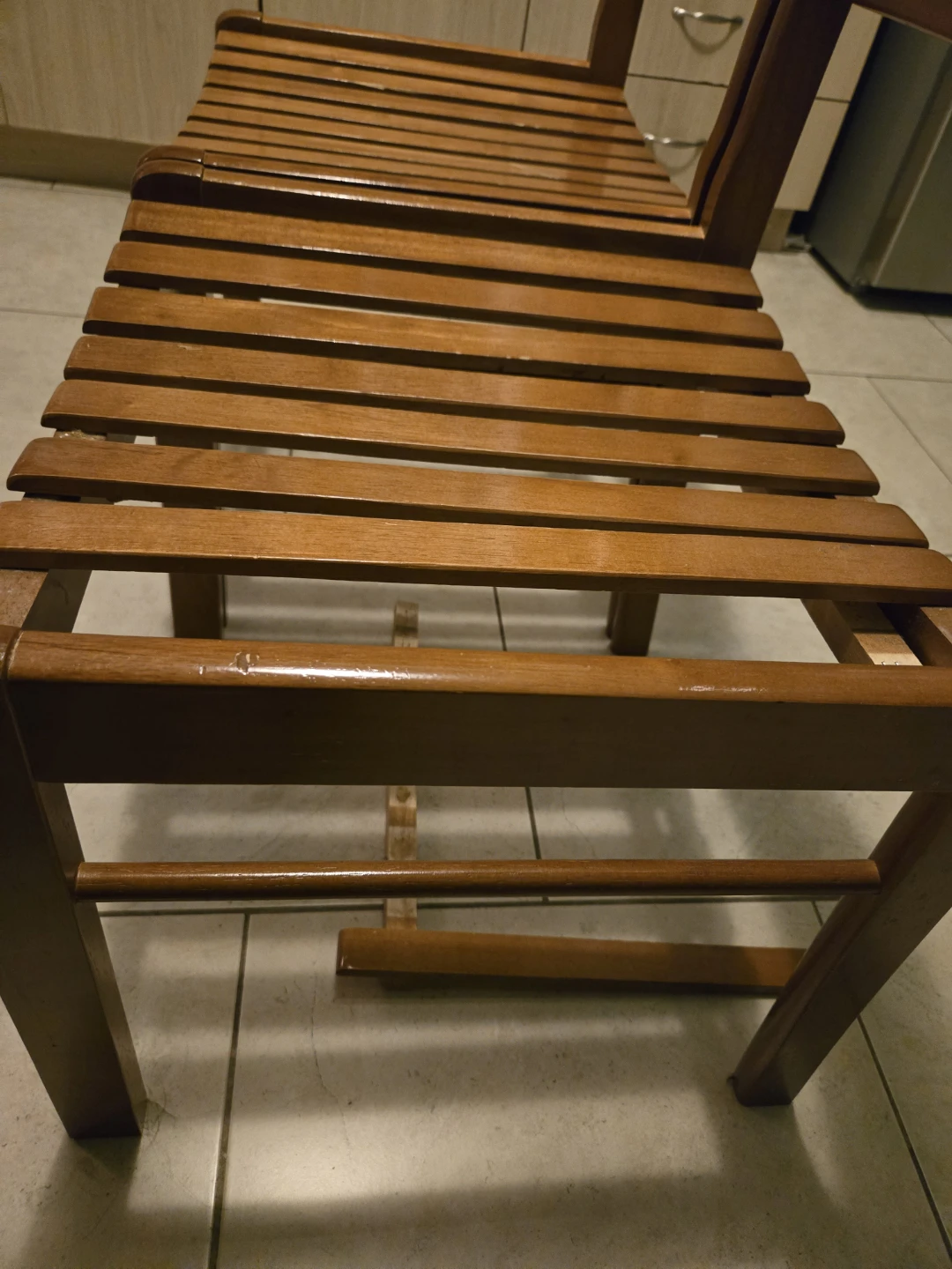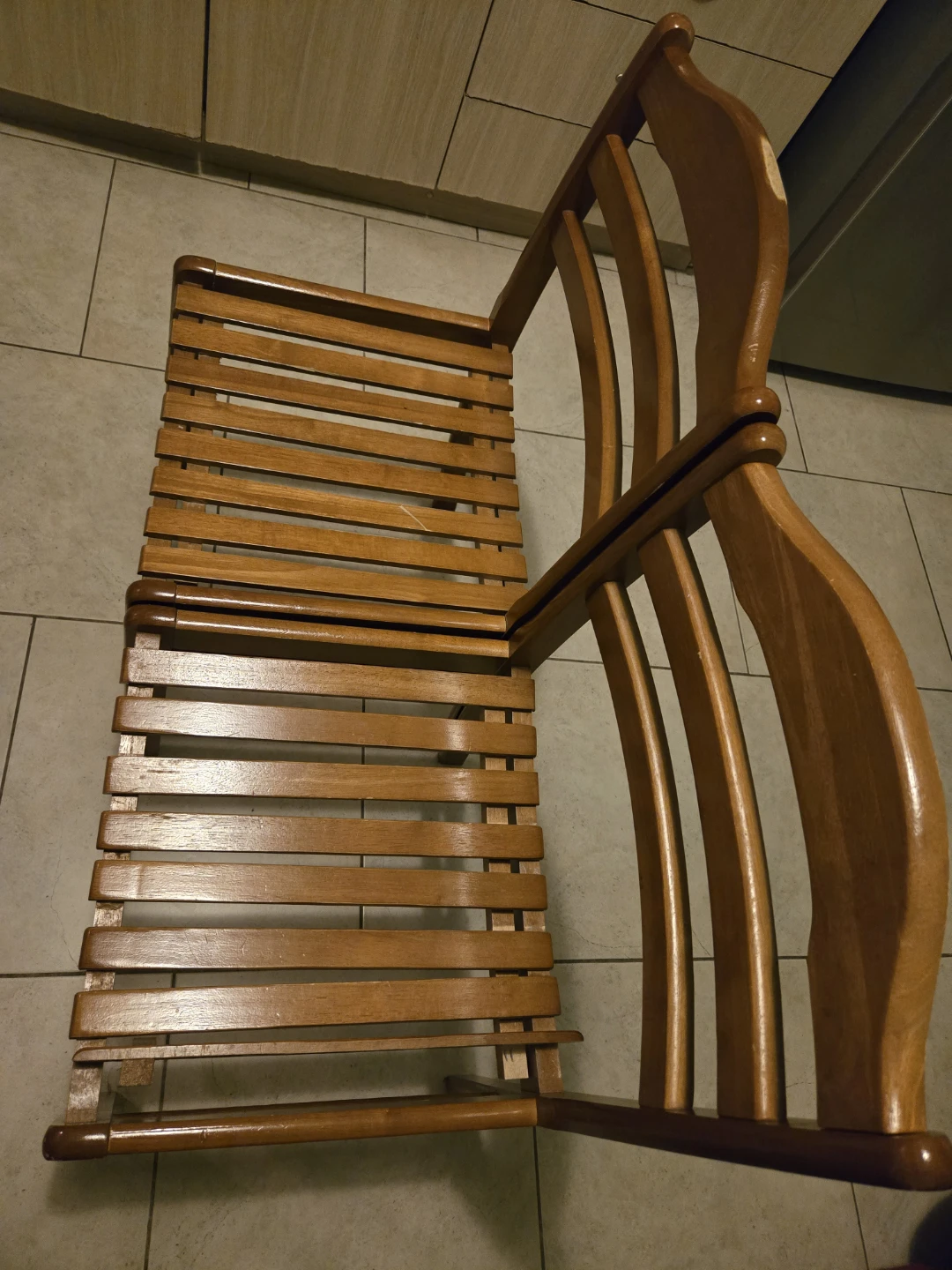 Selling a pair of vintage wooden slat chairs. They have a unique design and would be a great addition to any home. One chair is in good used condition, the other needs some wood glue and/or a handy person to replace the piece that braces the slats for stability (see pics). 1 for $30, both for $40. Preference to those who can take both (or who want the fixed upper one only at $15)