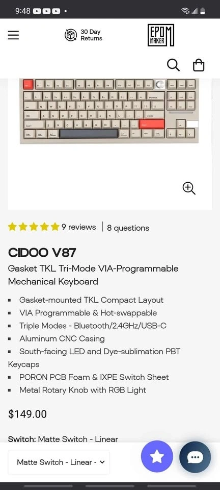 V87 VIA Programmable Mechanical Keyboard, Gasket TKL Tri-Mode Bluetooth/2.4Ghz/USB-C Wireless Wired Gaming Keyboard with South-Facing LED, Rotary Knob, Poron Foam for E-Sport Mac Win