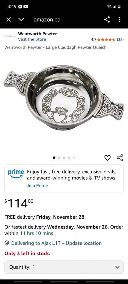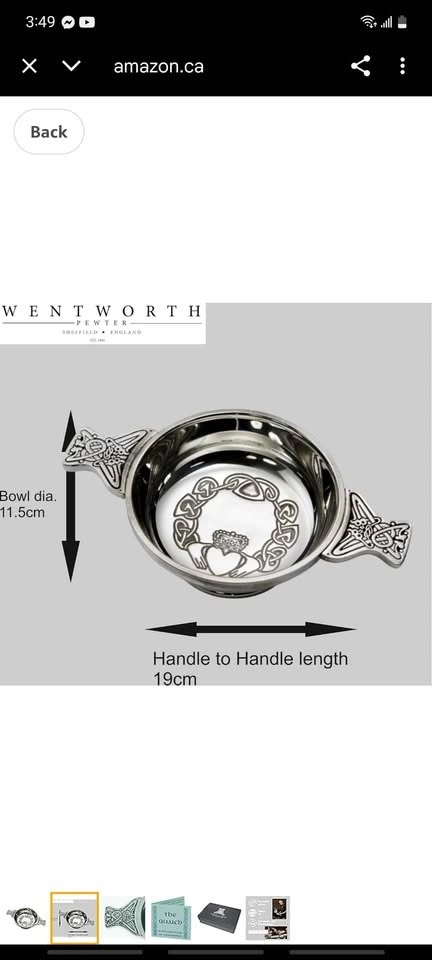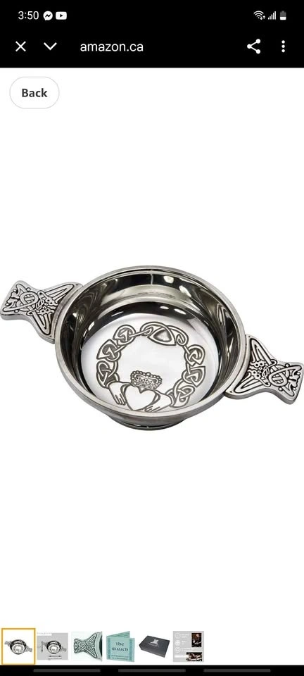 Buy & SellWentworth Pewter - Large Claddagh Pewter QuaichWentworth Pewter - Large Claddagh Pewter Quaich$90Feel free to message if you have any questions!WHERE TO MEETCheck LocationView MapSELLERjomanaWestney & Kingston100 reviews0 chats·0 favorites·2 viewsSEND CHAT TO SELLERHi jomana! I’m interested in your listing.Hi jomana! I’m interested in your listing.Get the Karrot app to chatSign In to chat