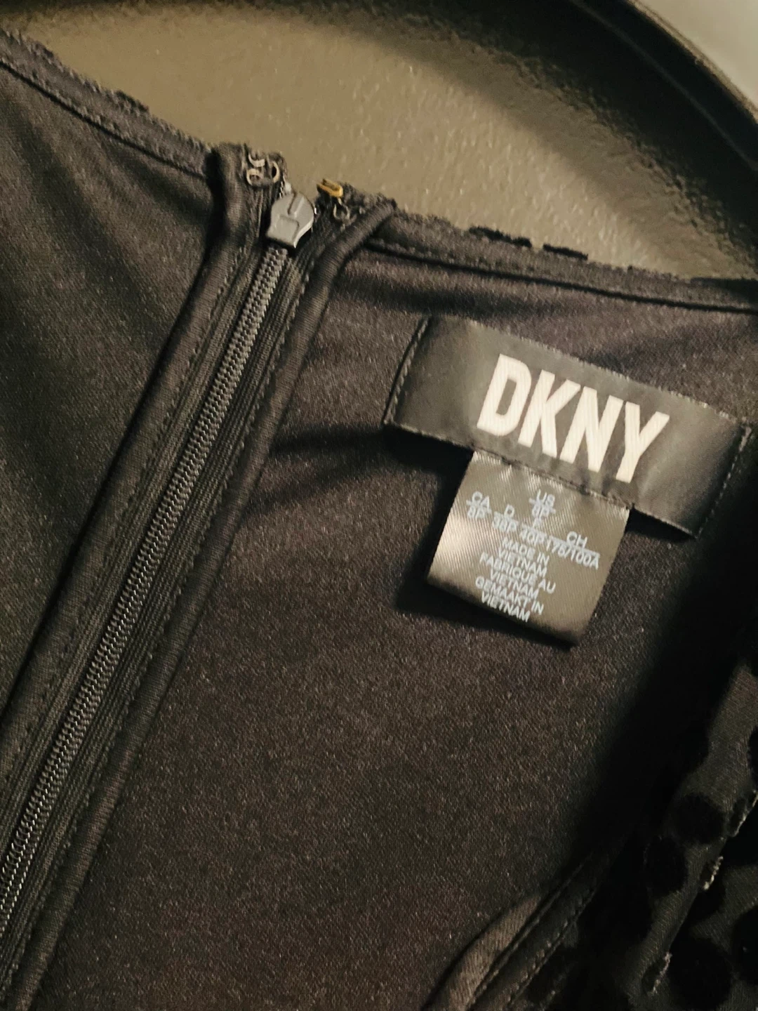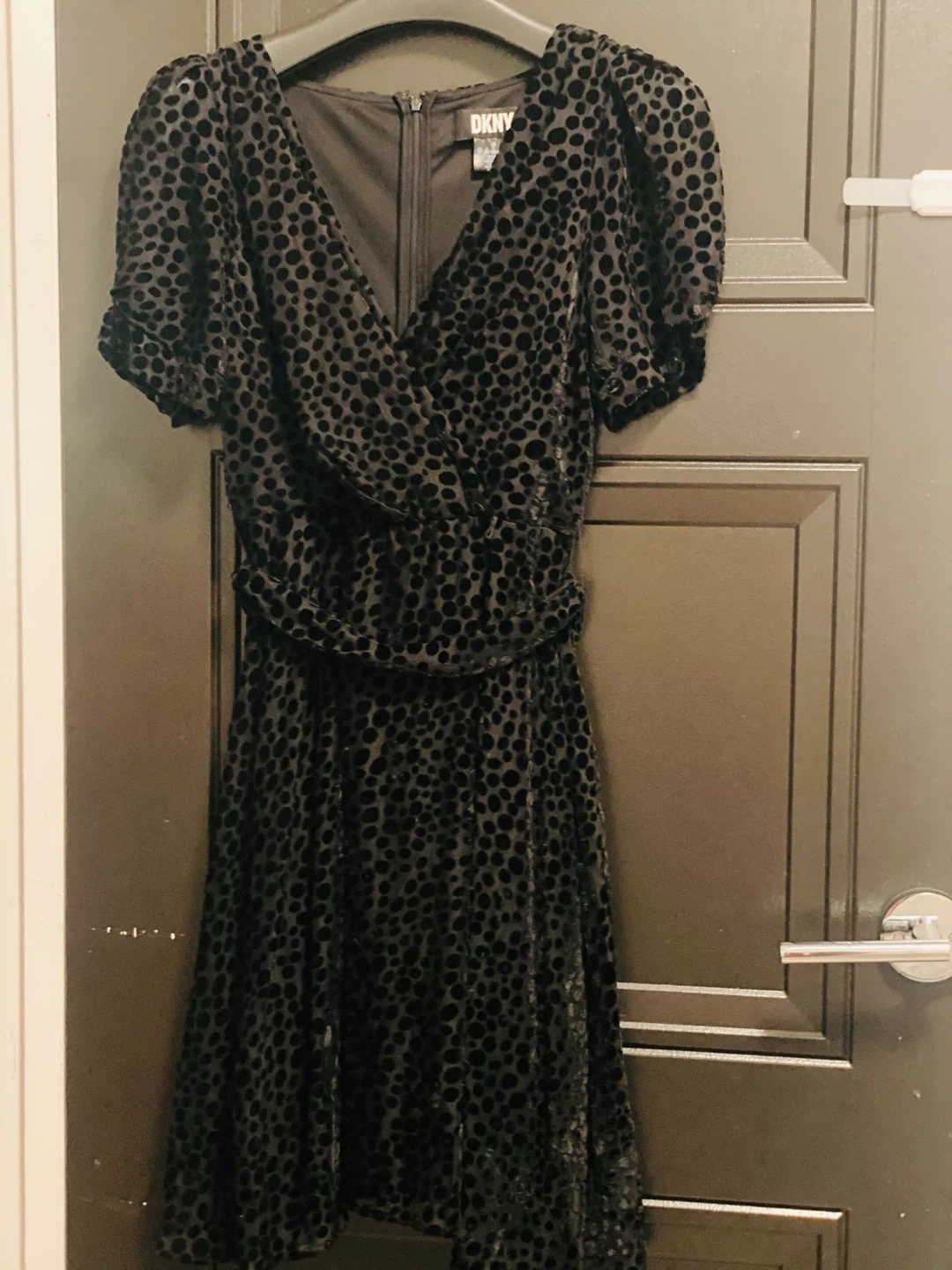 Add a touch of elegance to your wardrobe with this DKNY black velvet polka dot dress. This dress with a flattering silhouette and unique design, is perfect for a night out or a special occasion.