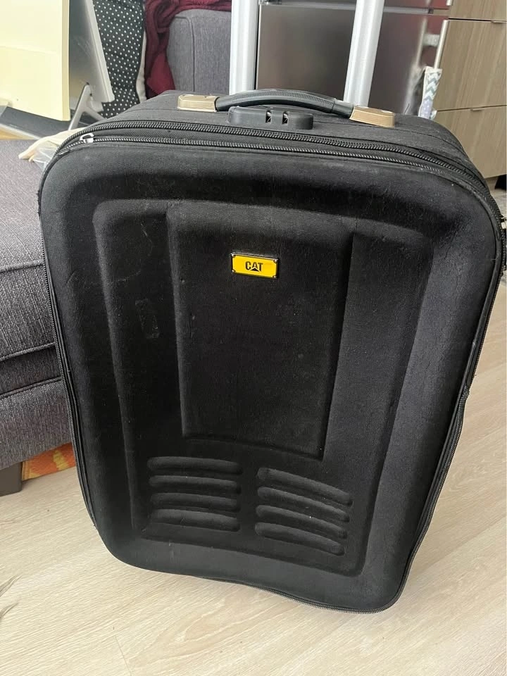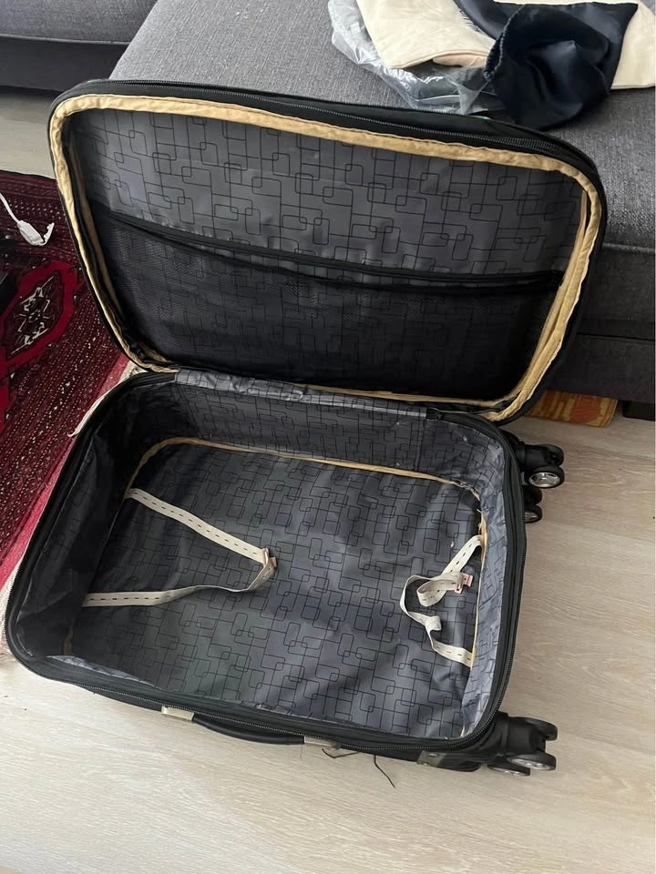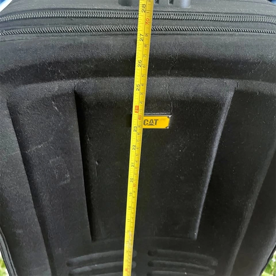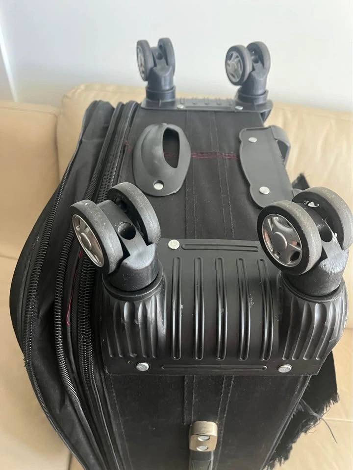 Great condition black suitcase with wheels. Measures 28 inches tall. Has multiple compartments and a sturdy handle. Interior is clean with some storage pockets.