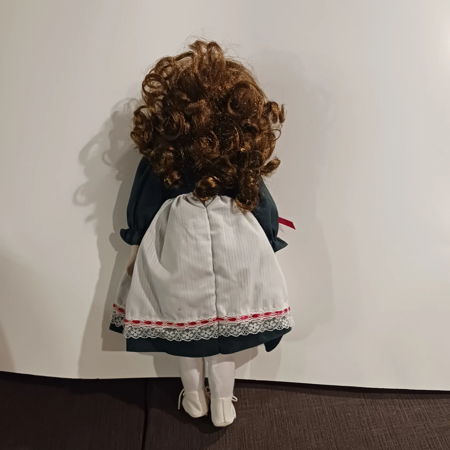 3. 16"H Soft facial expression, green dress with a white petticoat apron and red ribbon , NO stand $15.00