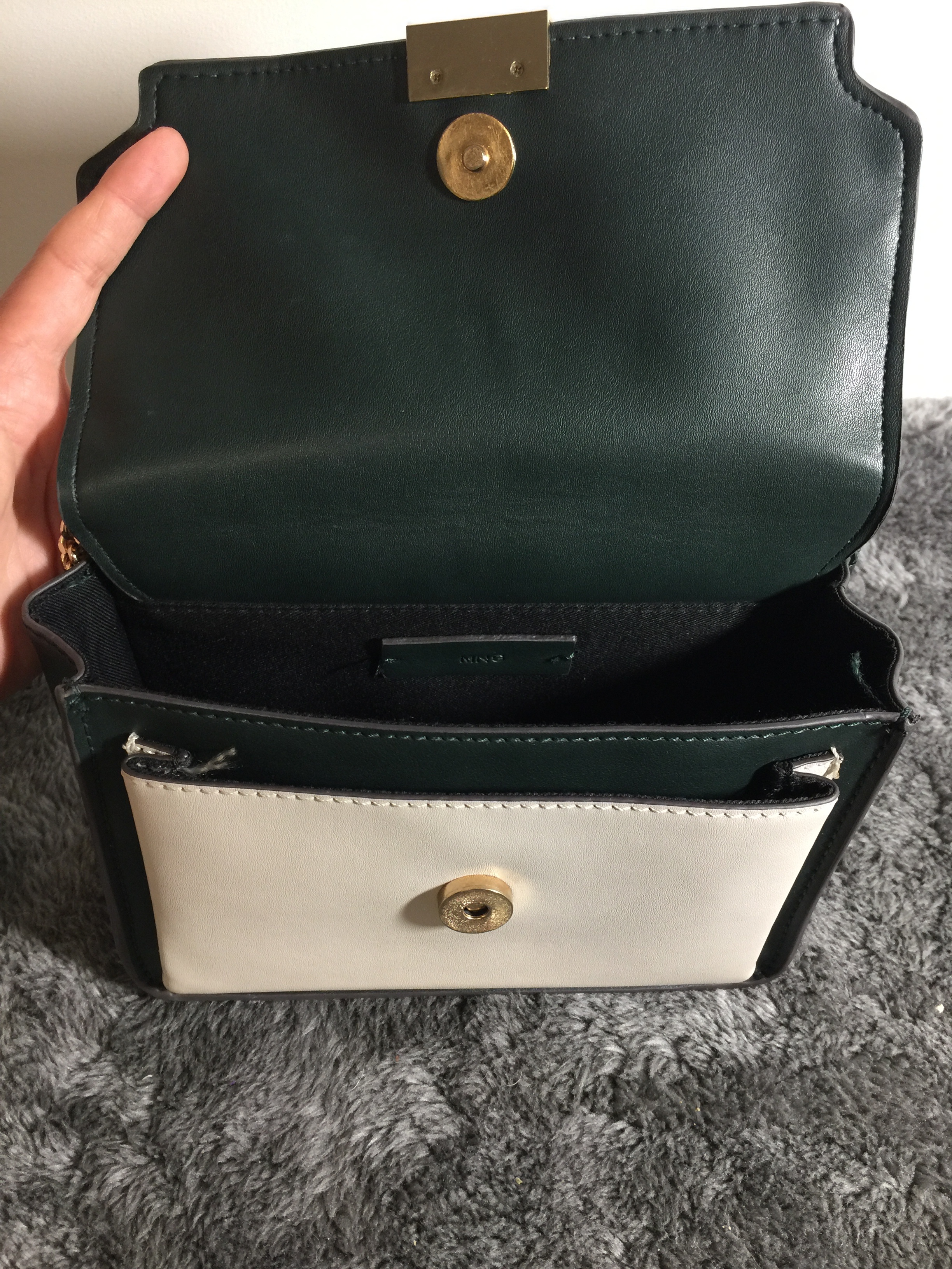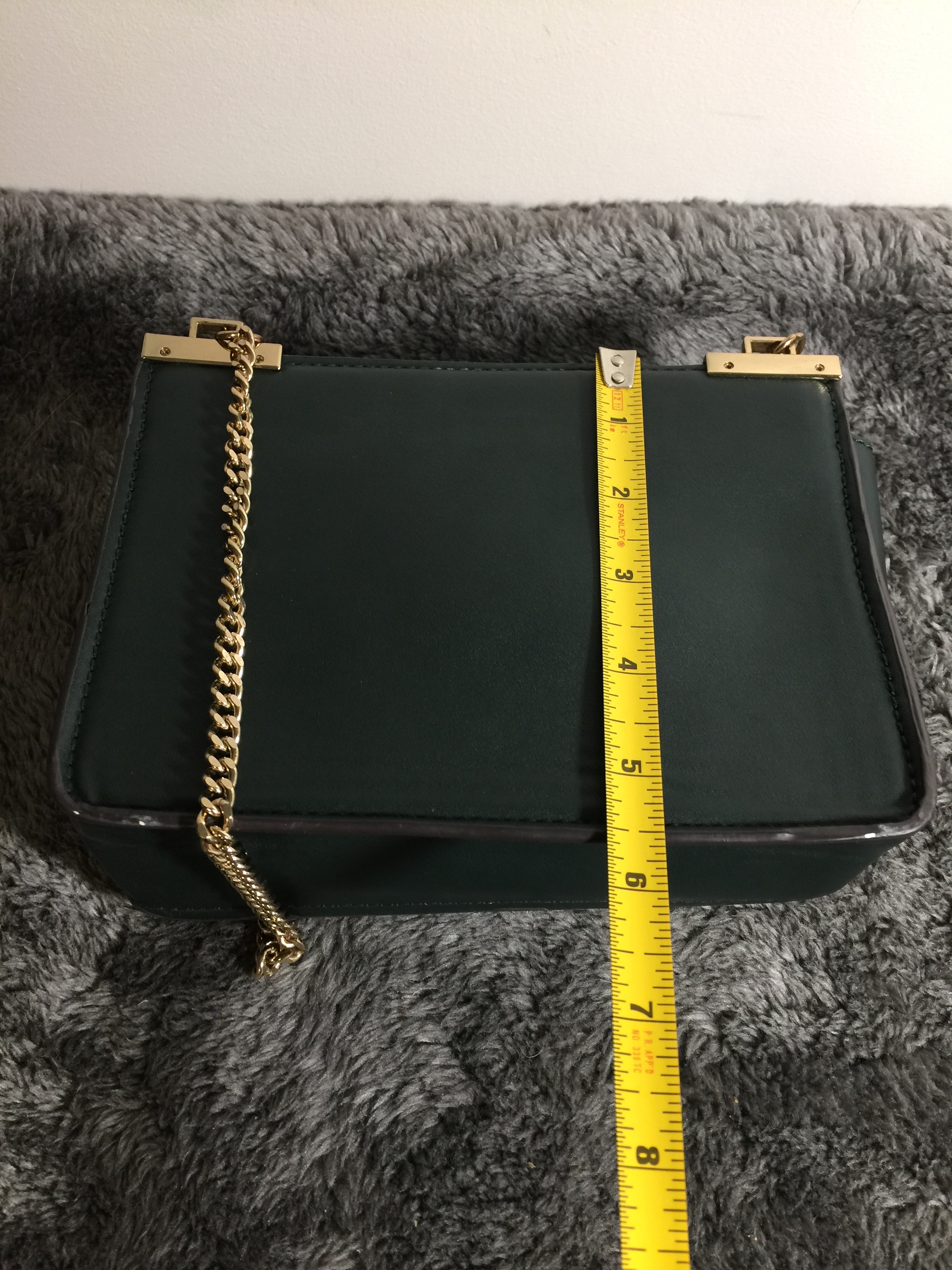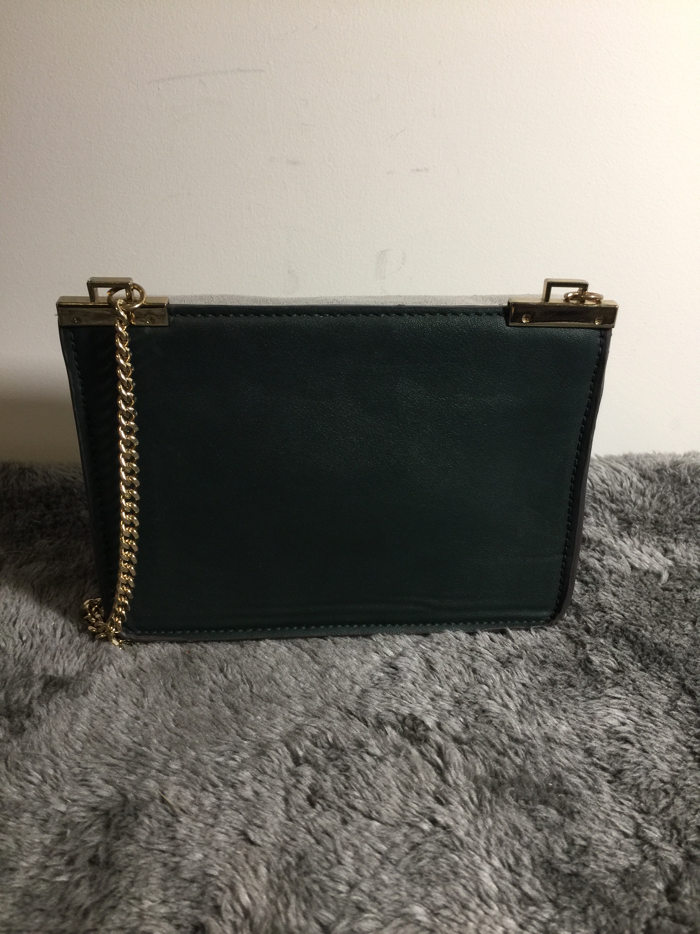 Selling a cute Mango chain bag in a stylish green and cream colour block design! The bag features a gold-tone chain strap and hardware. The approximate dimensions are 6 inches in height and 8 inches in width. Perfect for adding a touch of elegance to any outfit!