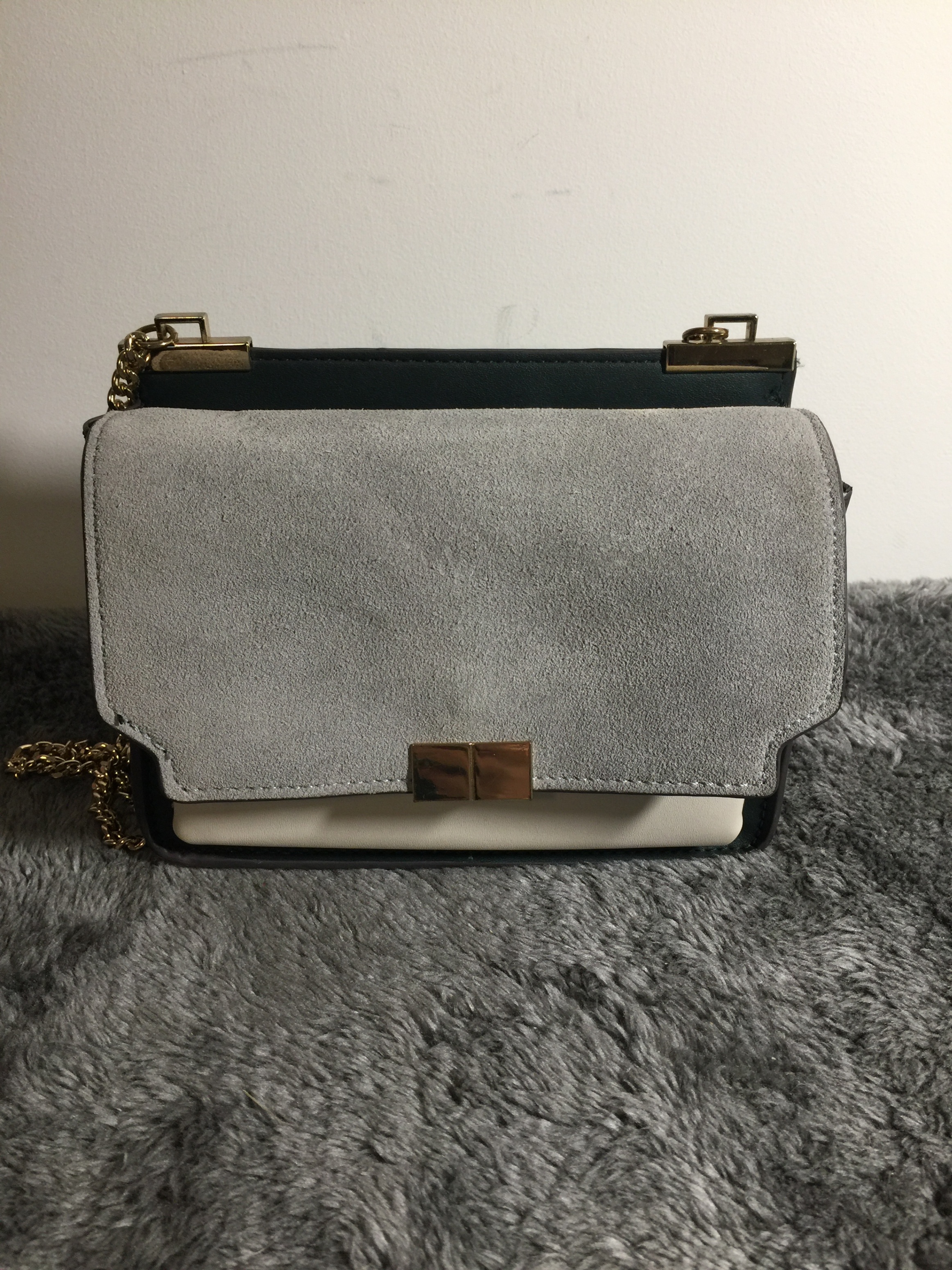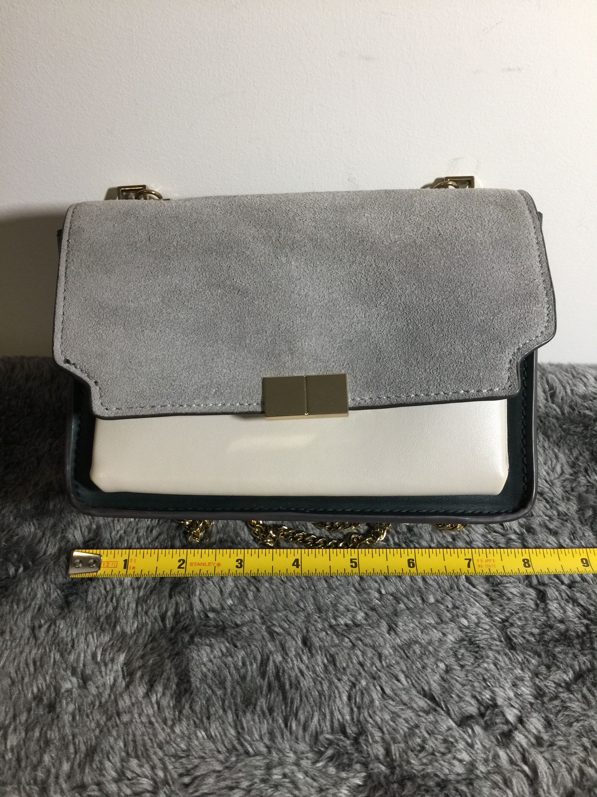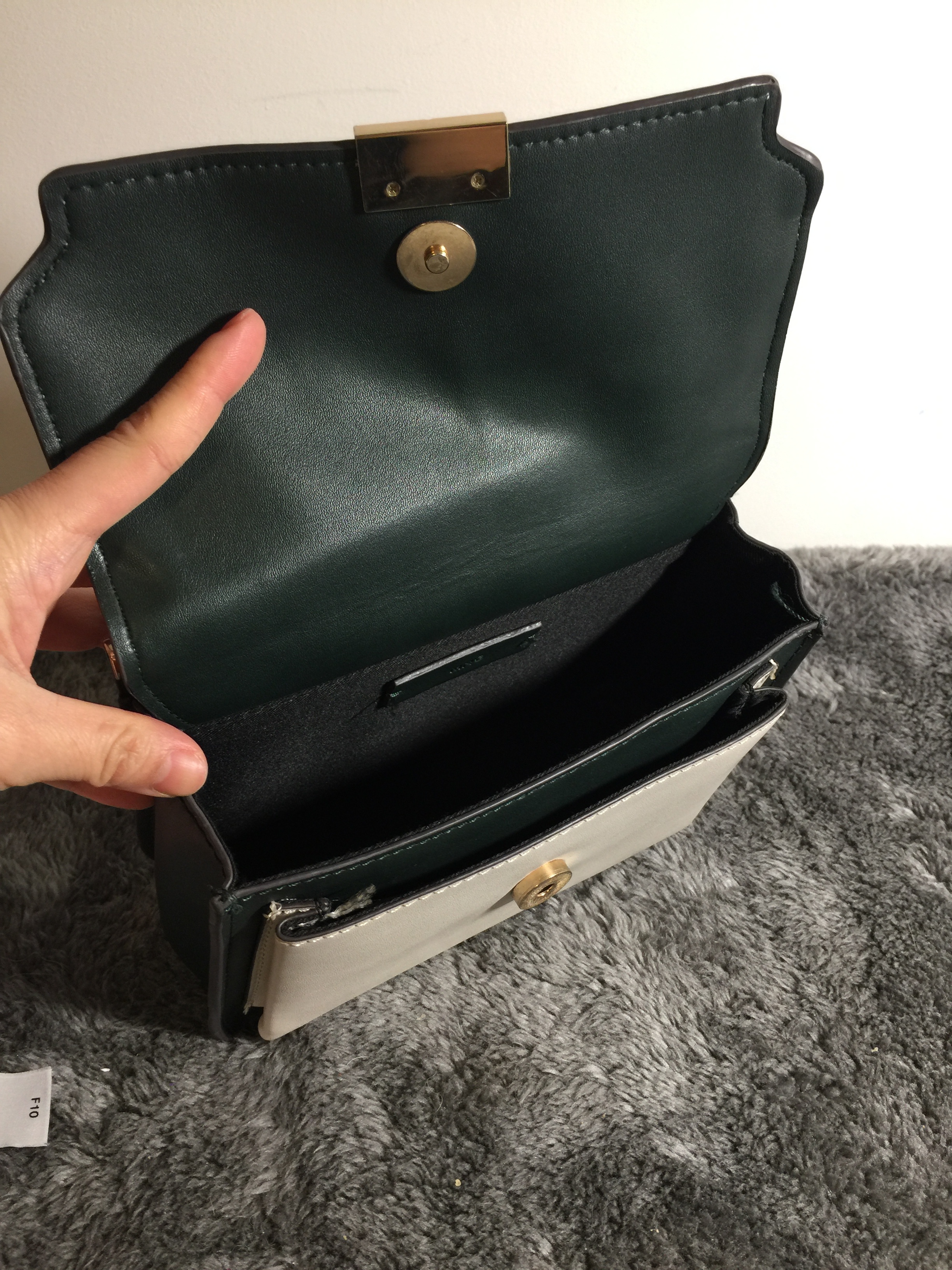 Selling a cute Mango chain bag in a stylish green and cream colour block design! The bag features a gold-tone chain strap and hardware. The approximate dimensions are 6 inches in height and 8 inches in width. Perfect for adding a touch of elegance to any outfit!