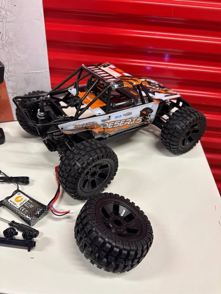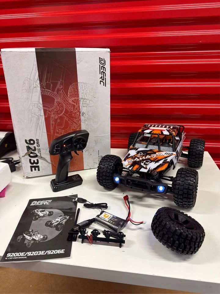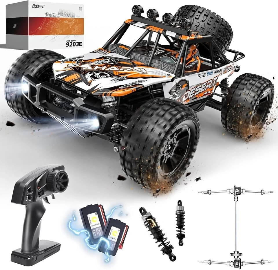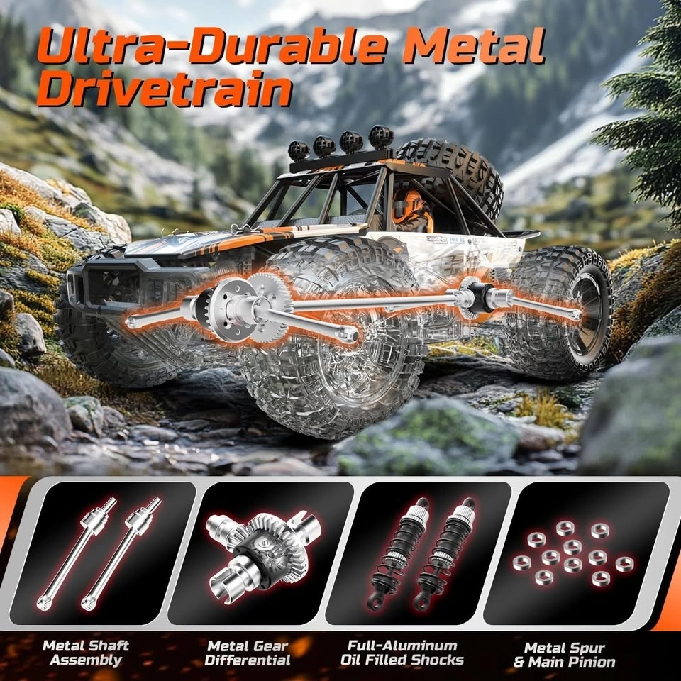 48KM/H High-Speed 1:10 RC Truck - Unleash the power of our large-scale RC car, featuring a 540 brushed motor that accelerates from 0 to 48KMH in seconds. The 30A ESC and 2.2KG torque ensure smooth handling and peak performance, delivering thrilling speed and ultimate control for every race. Unmatched Durability - This RC car features a sturdy metal drivetrain with upgraded components like dog bones, a metal differential, and gears, ensuring exceptional durability and longevity. Its ultra-durable composite chassis can handle the toughest terrains, resist impacts, and minimize damage, offering 50% more durability compared to traditional models. Supercharged Battery Life - This 1:10 RC truck is equipped with a 1500mAh high-energy density battery, offering a 5% energy density boost, reducing heat and resistance, and extending runtime by 10% for stable performance. The dual-battery setup pushes your fun to the limit, delivering an incredible 30 minutes of playtime! Full-Function Radio System - The 2.4GHz radio system offers a control range of up to 262 feet with no signal interference, allowing multiple players to race simultaneously.The upgraded full proportional remote offers precise speed and steering adjustments, delivering smooth acceleration, accurate turns, and stable handling across all terrains. Perfect for enthusiasts who crave ultimate control and performance! Action-Ready Monster Truck - This high-speed RC truck for adults features independent suspension design for both the front and rear, equipped with metal oil-filled shocks to maintain vehicle stability. Paired with non-slip rubber tires, the aggressive tread pattern helps you tackle any terrain with ease. The truck also includes an extra spare tire for quick replacement of damaged ones. Say goodbye to chassis roll and get ready for unlimited off-road adventures!