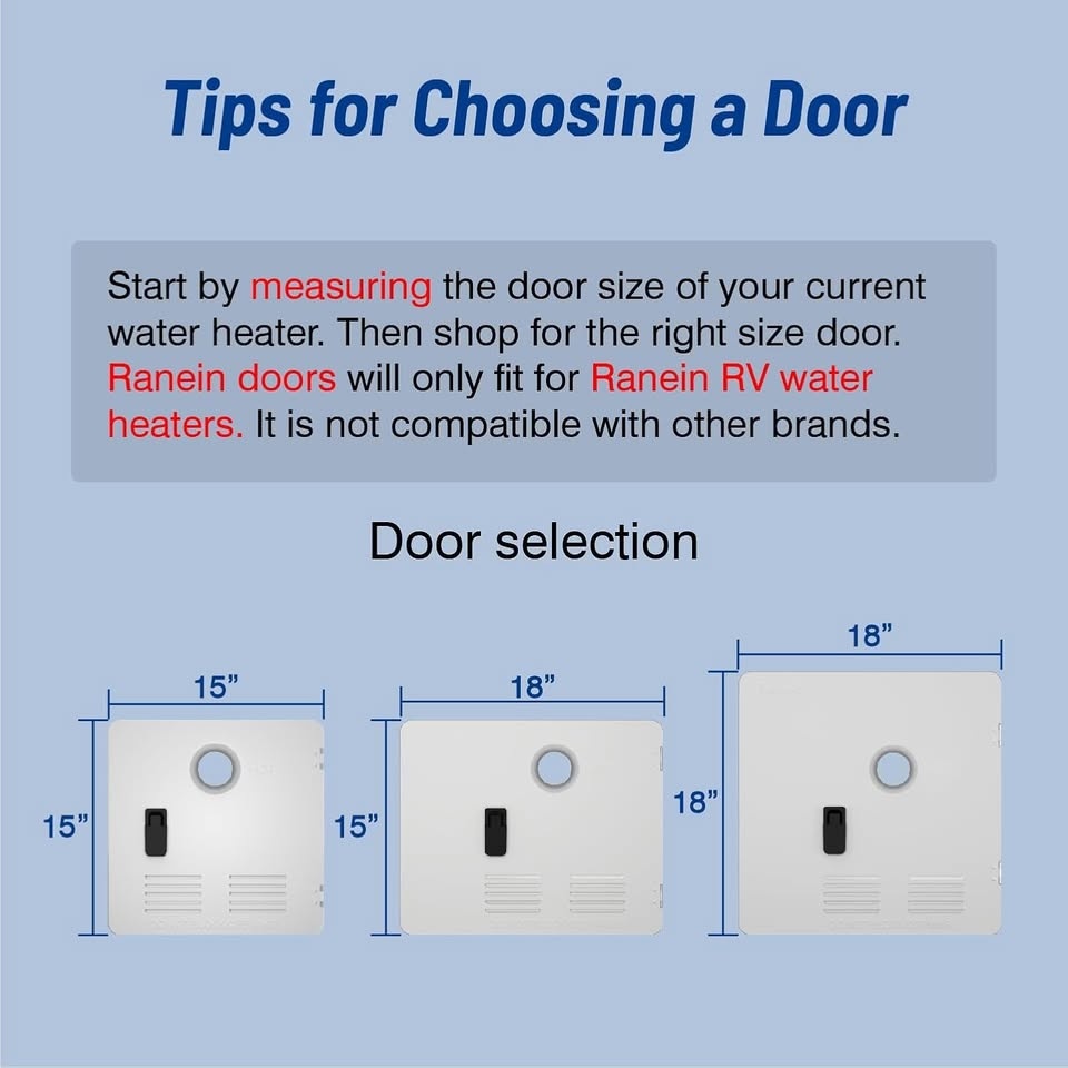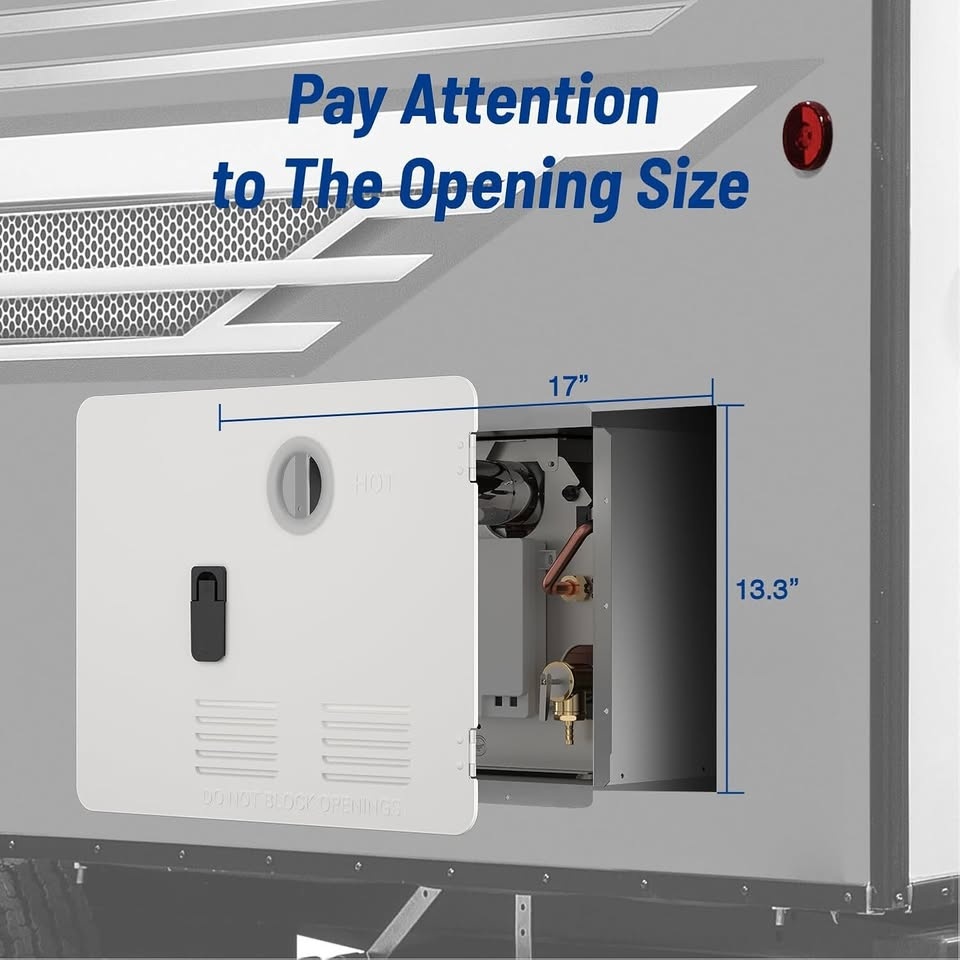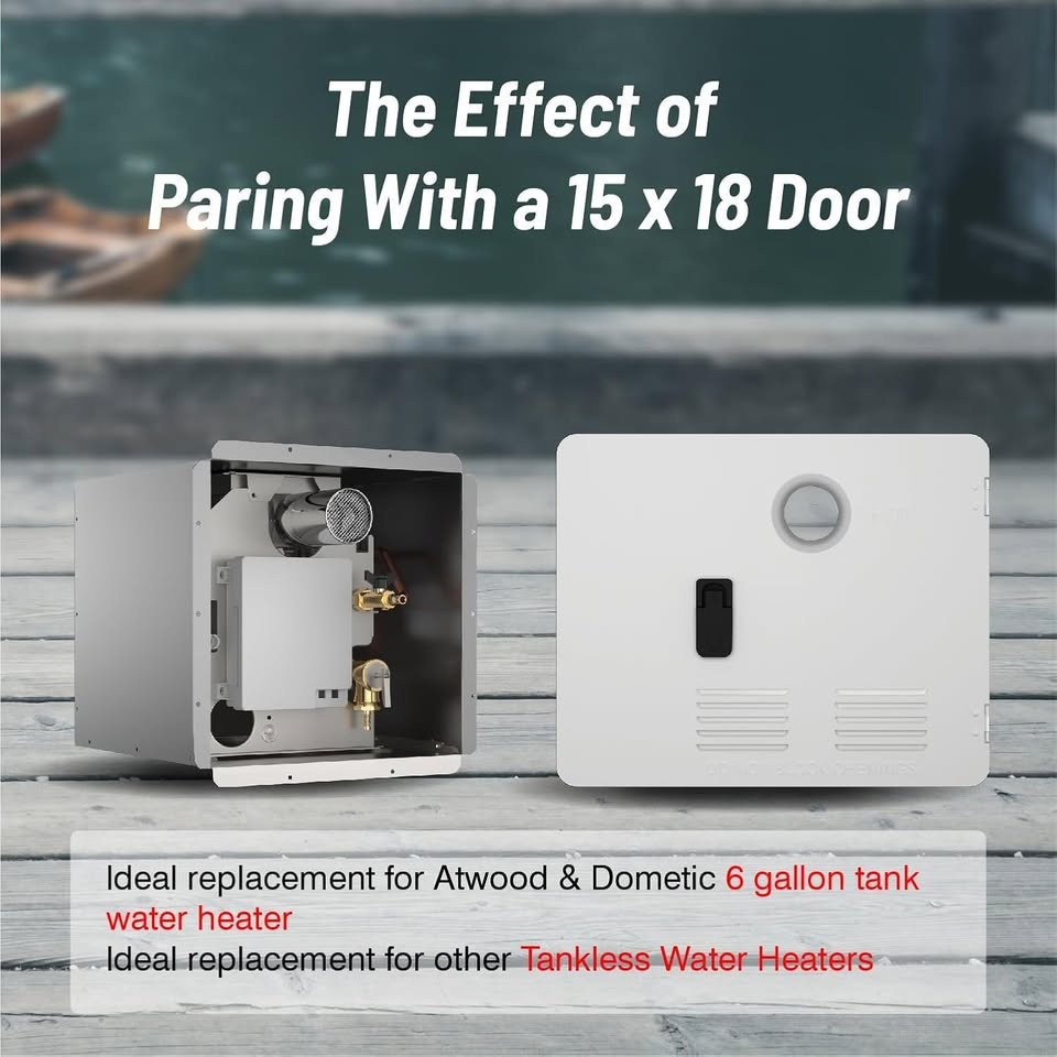 Basic: 15" x 18" white access door designed for Ranein RV water heaters, includes installation instructions for easy setup. Applicability If you are replacing your Atwood 6 gallon water heater with a Ranein RV water heater, please use this product for installation. Easy Installation The flush mount door fits snugly against the sidewall, providing a neater appearance and reducing the risk of leaks. Durable Made of galvanized steel, the door is both durable and sturdy. It is professionally designed to be waterproof and to prevent mosquitoes from entering your water heater. Anti-Bump The doors are equipped with sturdy hinges to withstand the bumps of the journey.