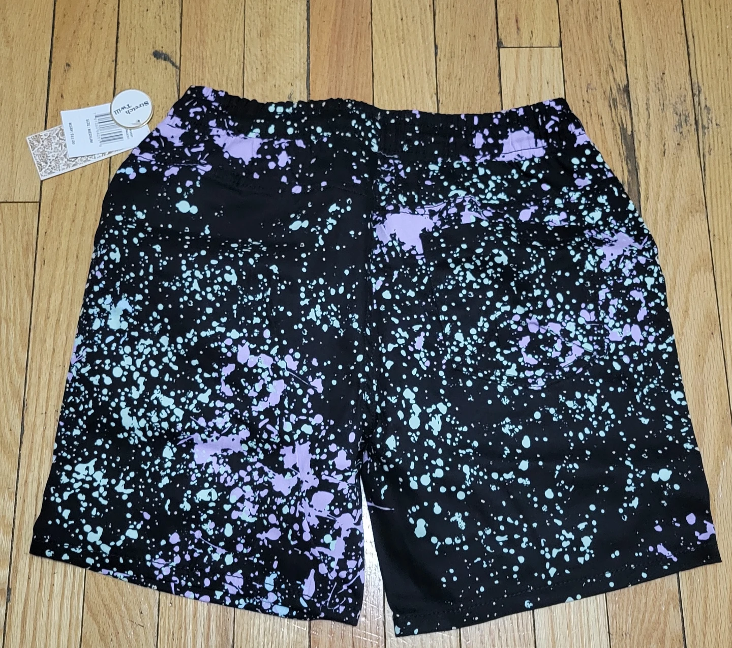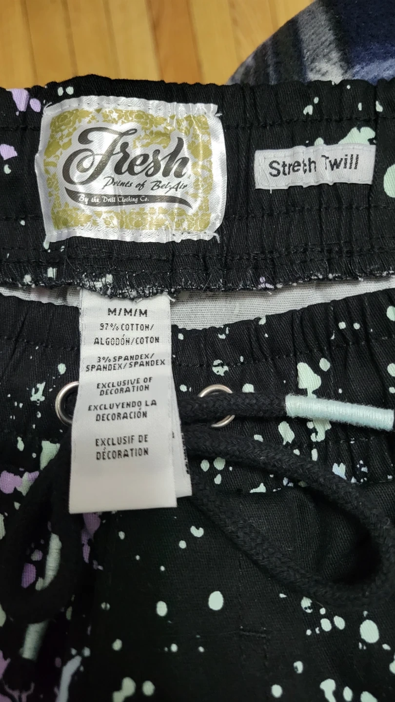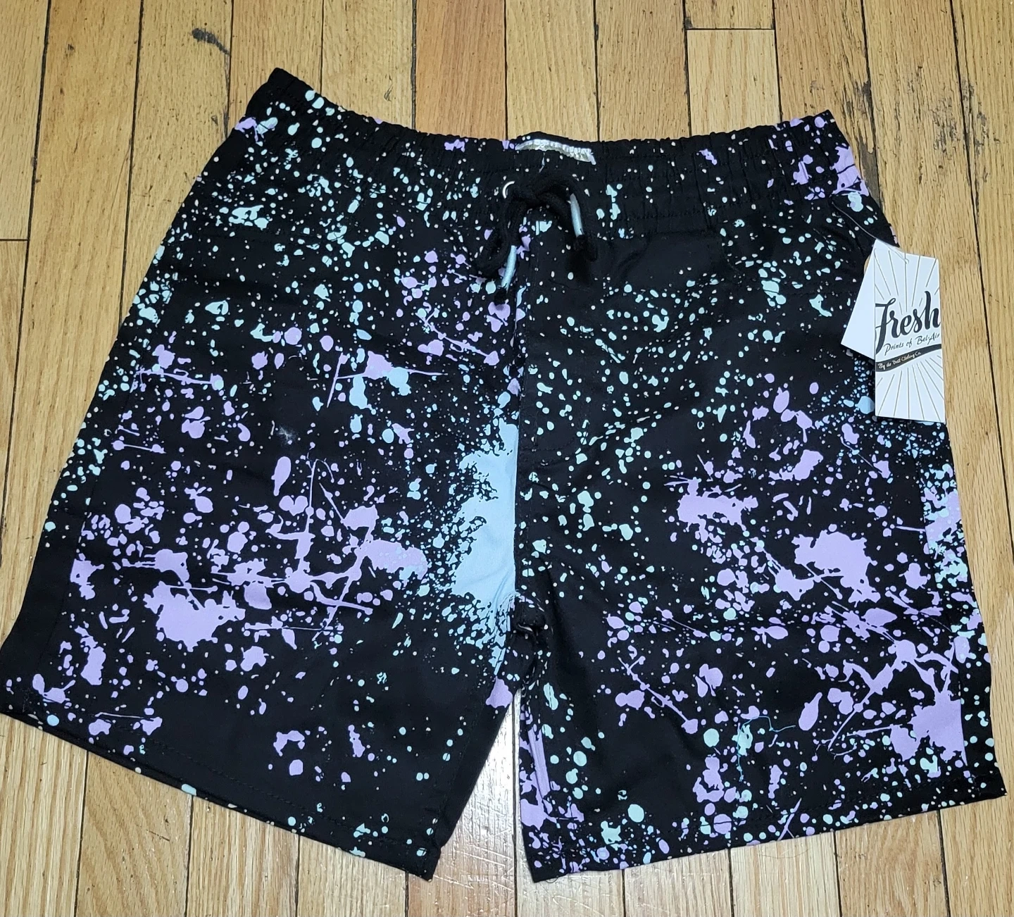 Fresh Prints of Bel-Air shorts in size medium. They are black with a splatter paint design in light blue and purple. The material is 97% cotton and 3% spandex