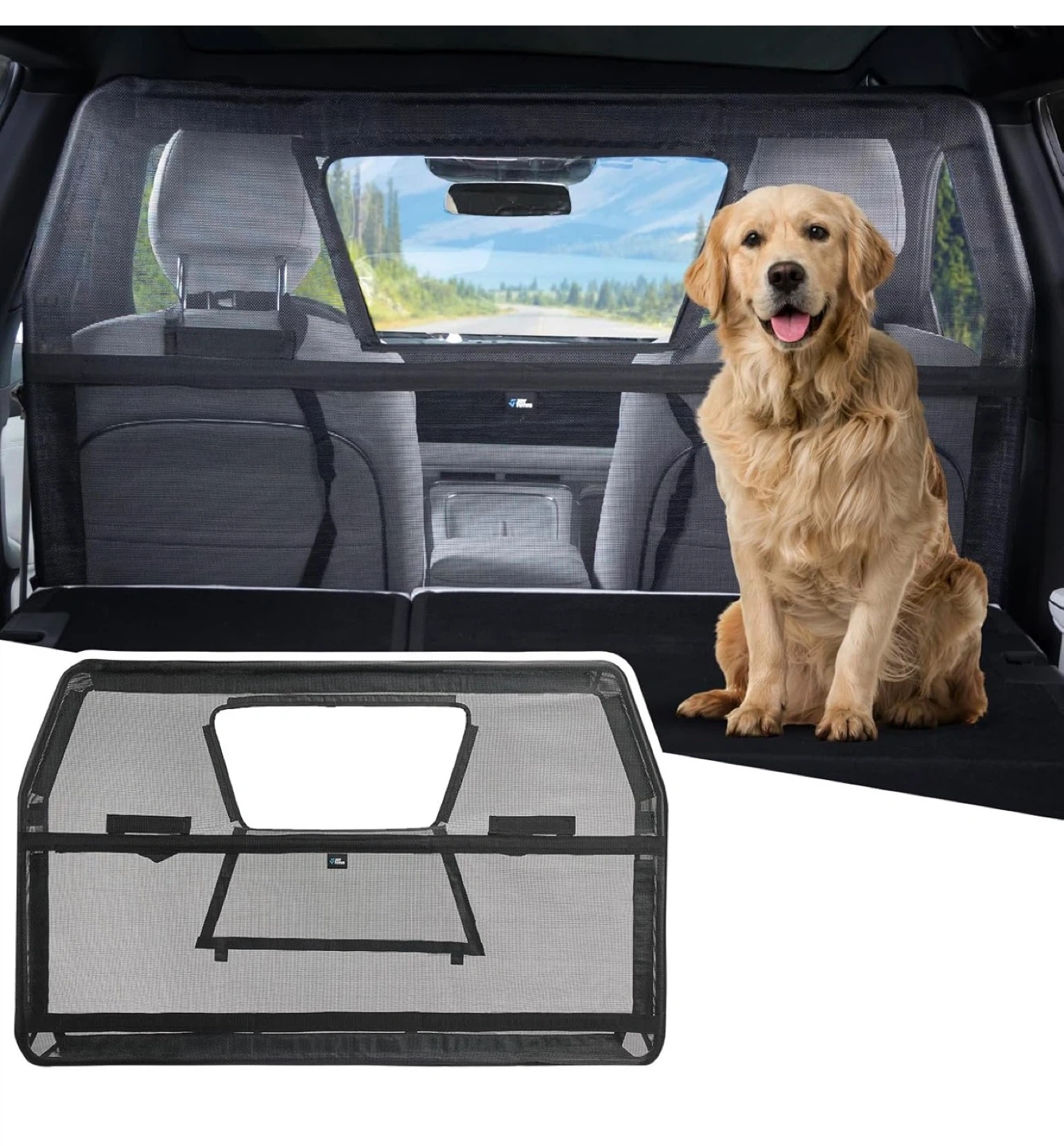 Keep your furry friend safe and secure in the car with this pet barrier! It's designed to fit in most small trucks, mid-sized SUVs, and mid-sized sedans. The barrier is 52 inches wide and 31 inches tall, providing ample coverage. It's made with ultra-dense, extra-thick mesh to withstand heavy pushes and has a rust-resistant coating. It also features top and bottom fasteners for a snug and secure fit!