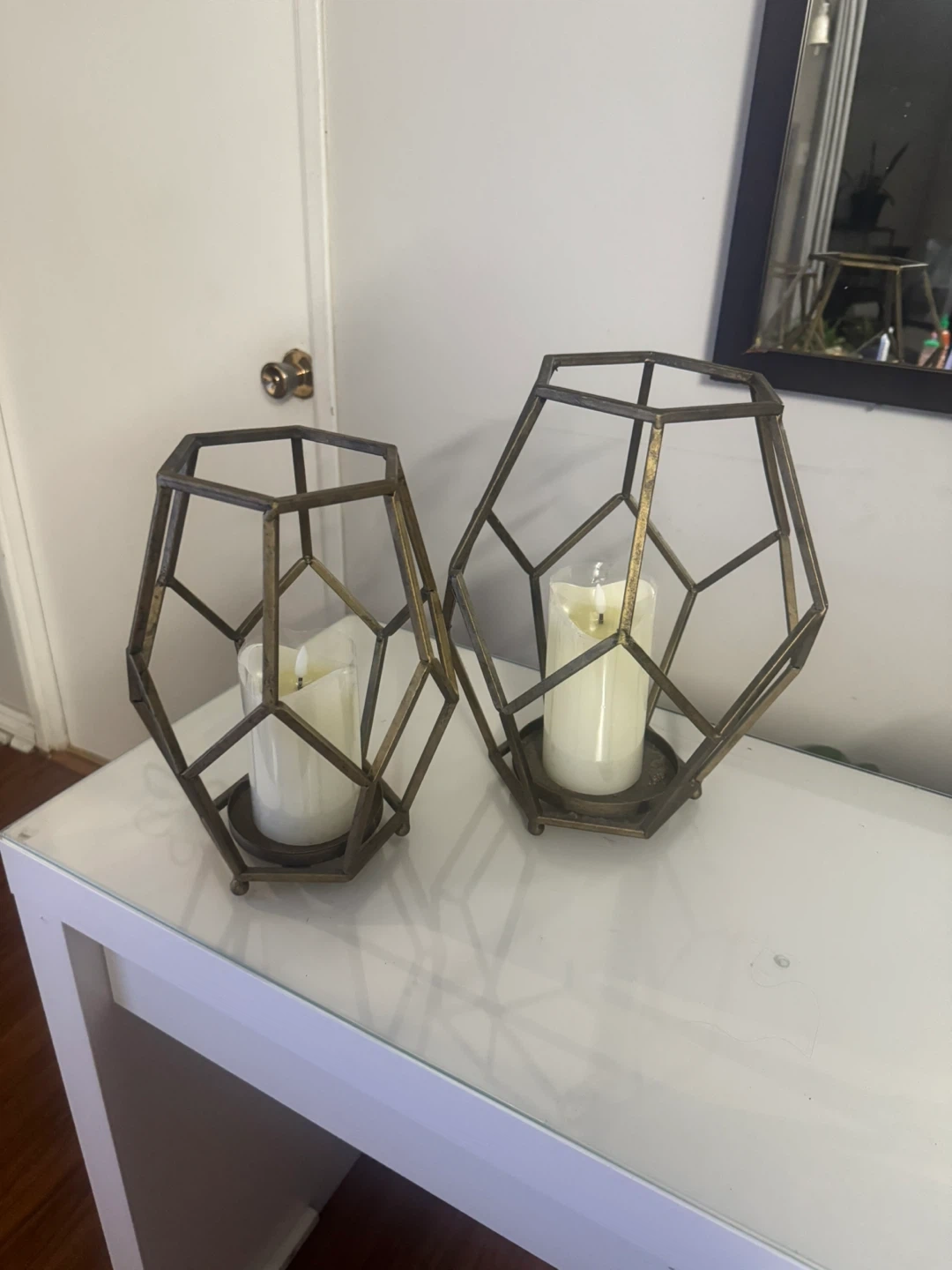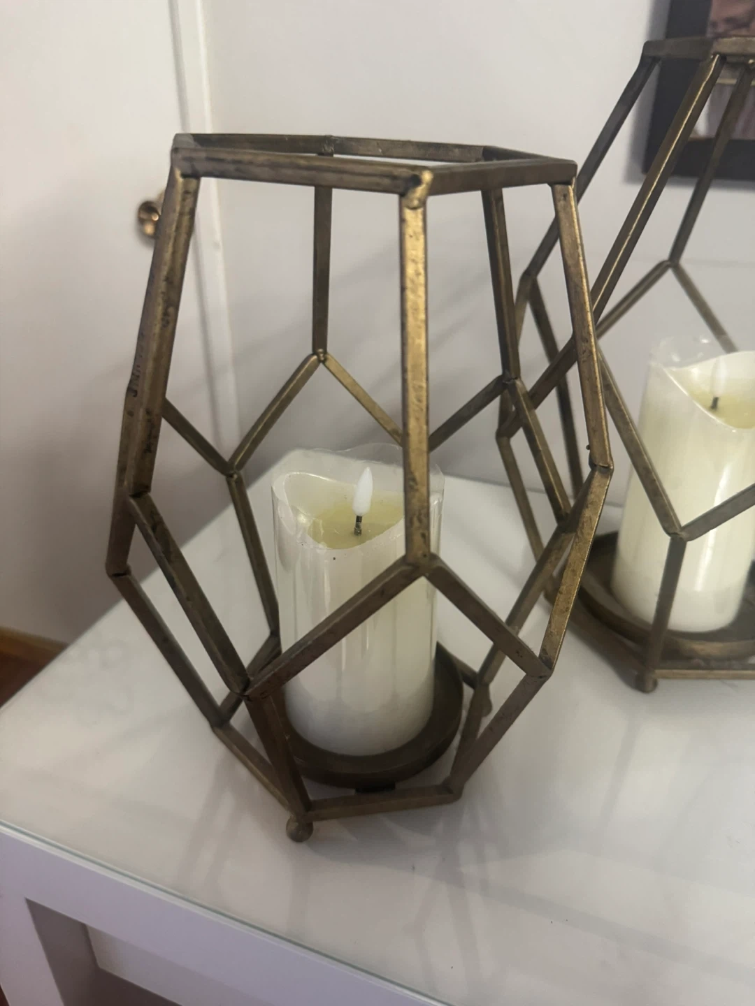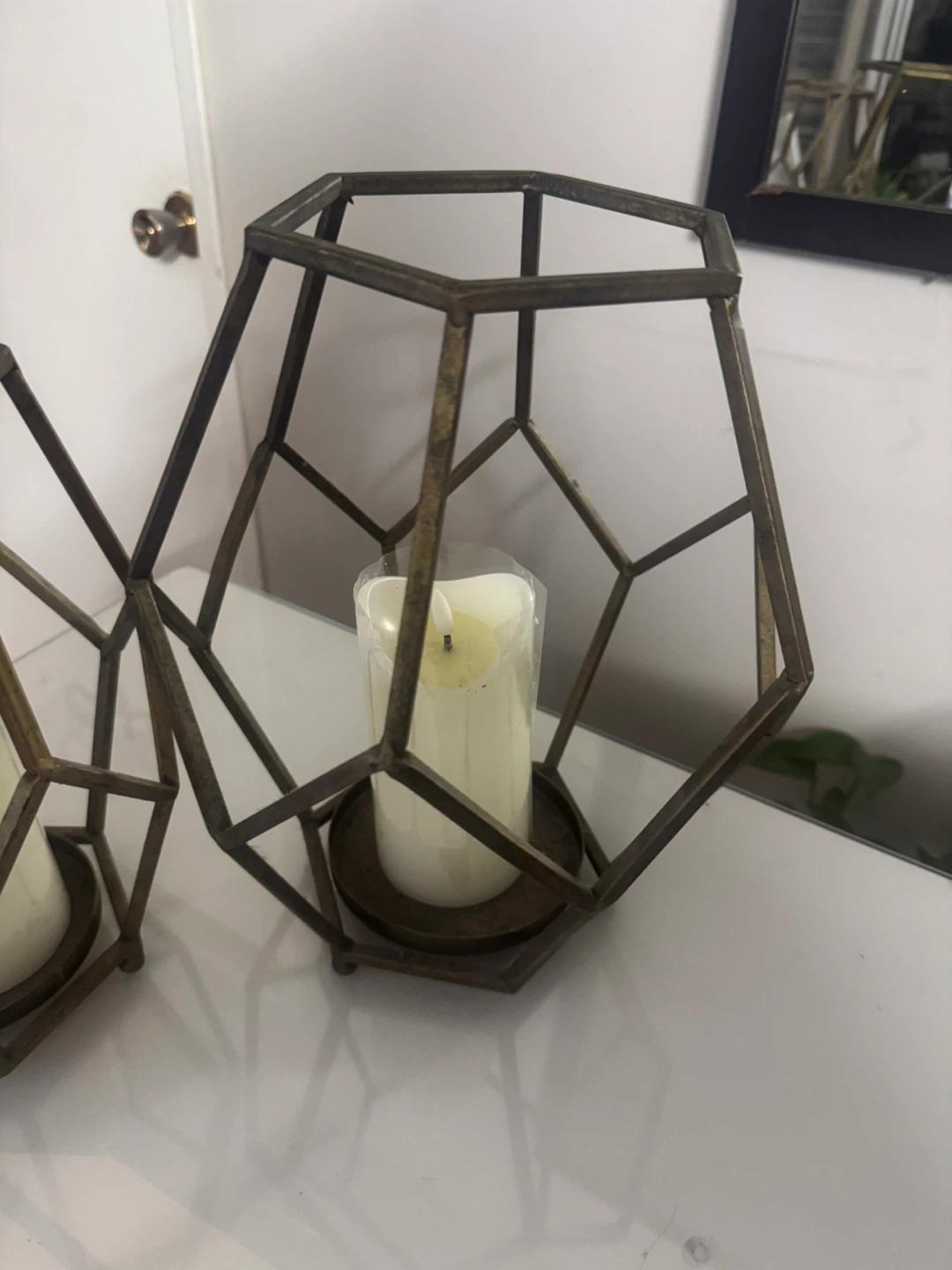 Selling a set of two metal geometric candle holders. They have an antique gold colour and are in good condition. Perfect for adding a touch of modern style to your home decor! With two flickering candles included.
