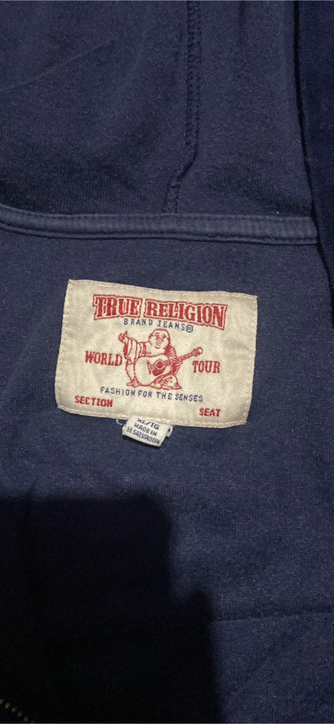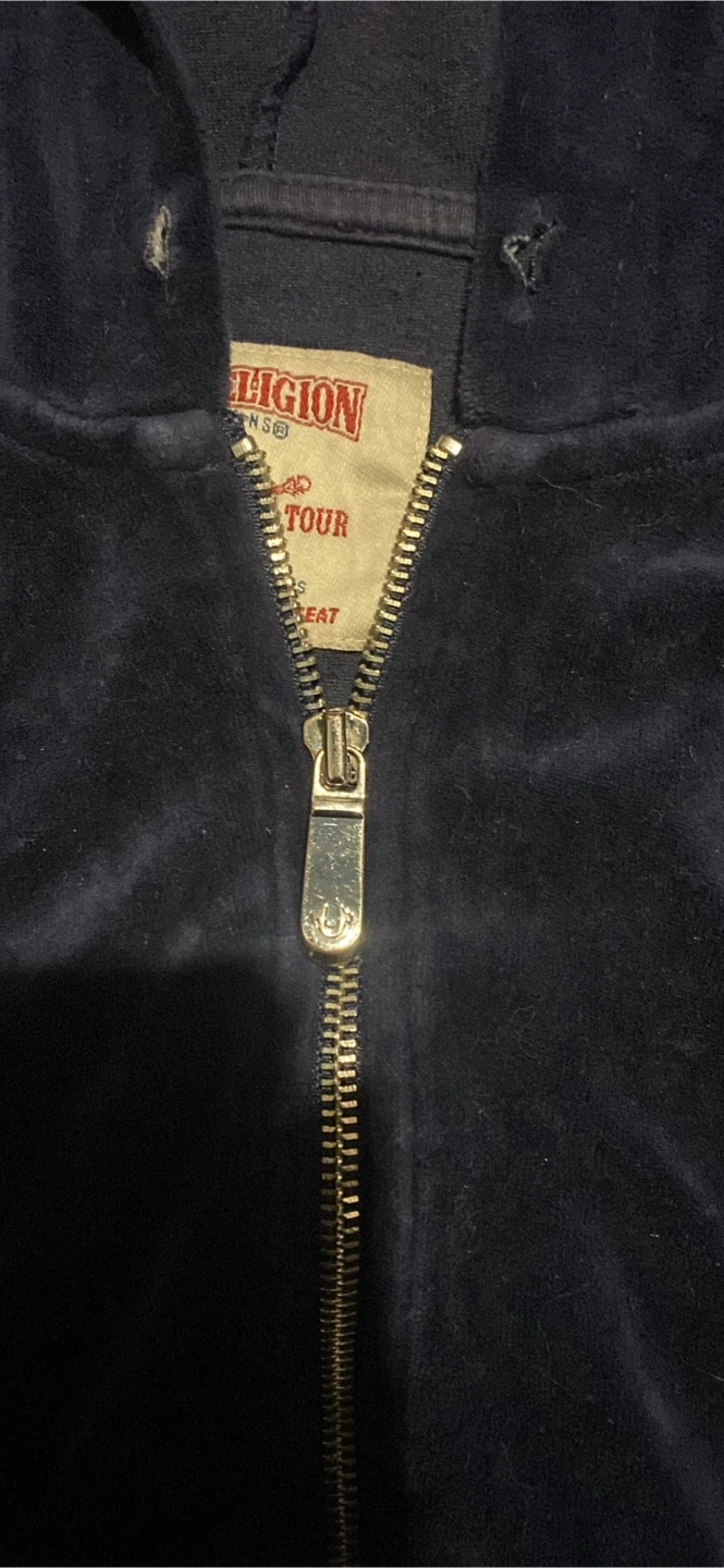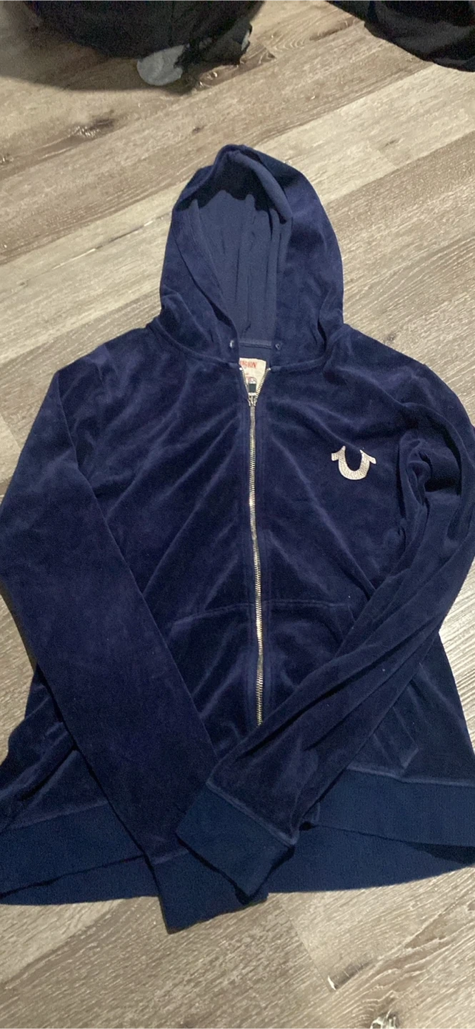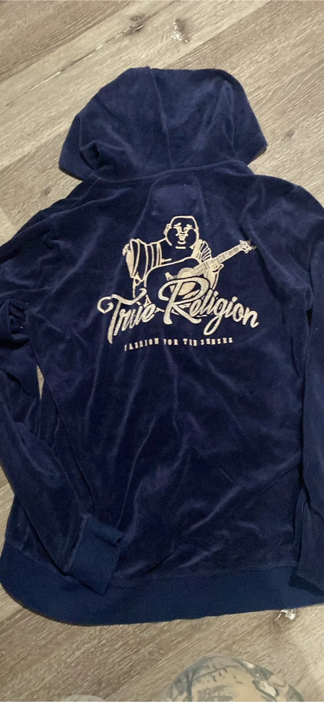 Selling a True Religion blue velour hoodie in size XL. It's in good condition and features the iconic True Religion logo on the back and front. Perfect for adding a touch of style to your wardrobe!