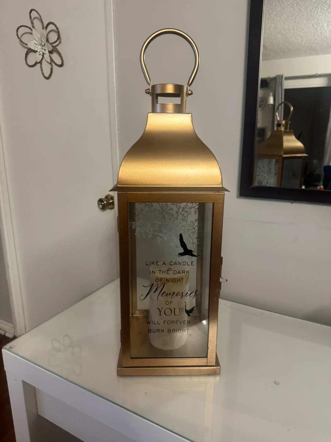 This is a beautiful heavy gold metal candle lantern that will add a touch of warmth to any room. It features glass panels with decorative designs, including a tree and a lovely saying. Perfect for creating a cozy atmosphere in your home!