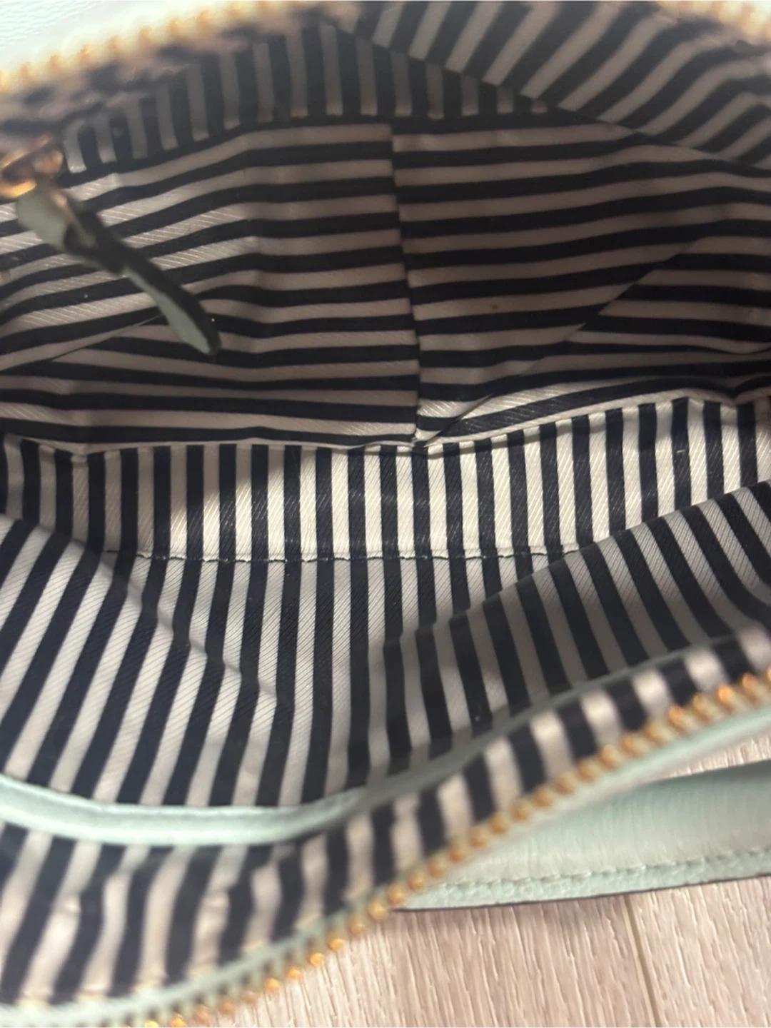 This is a cute Kate Spade New York handbag in a light blue colour. The interior lining is black and white striped.