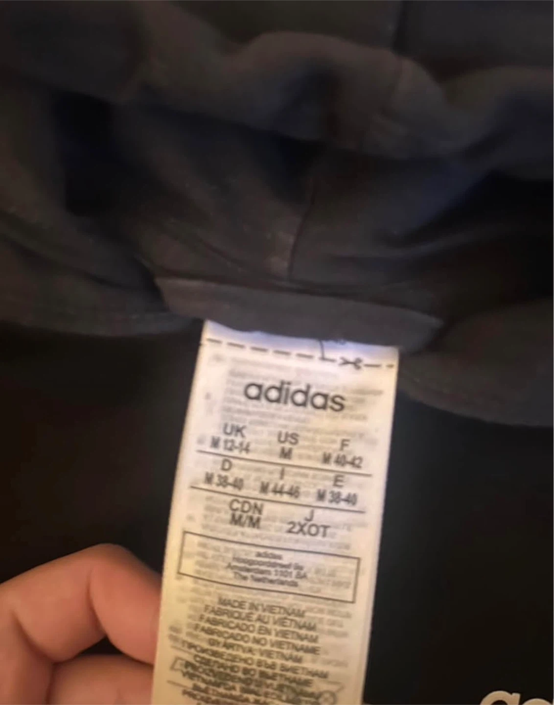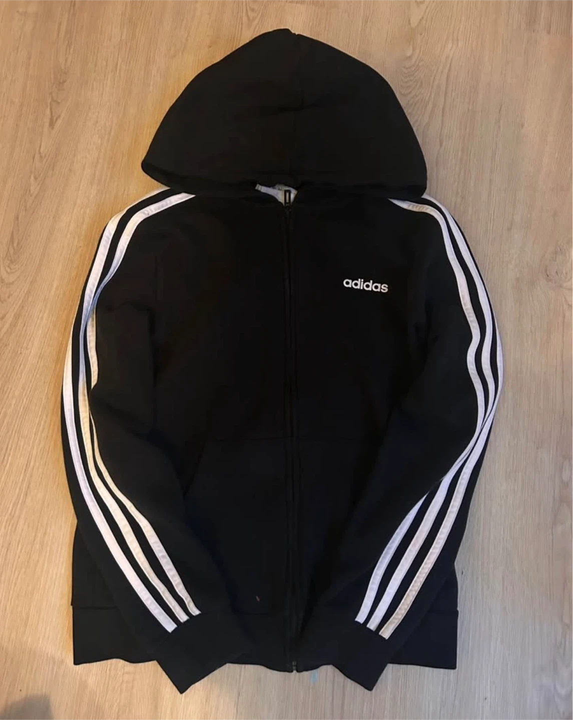 Selling a black Adidas hoodie in size M. It features the classic three stripes on the sleeves. It's in great condition and ready for a new owner!
