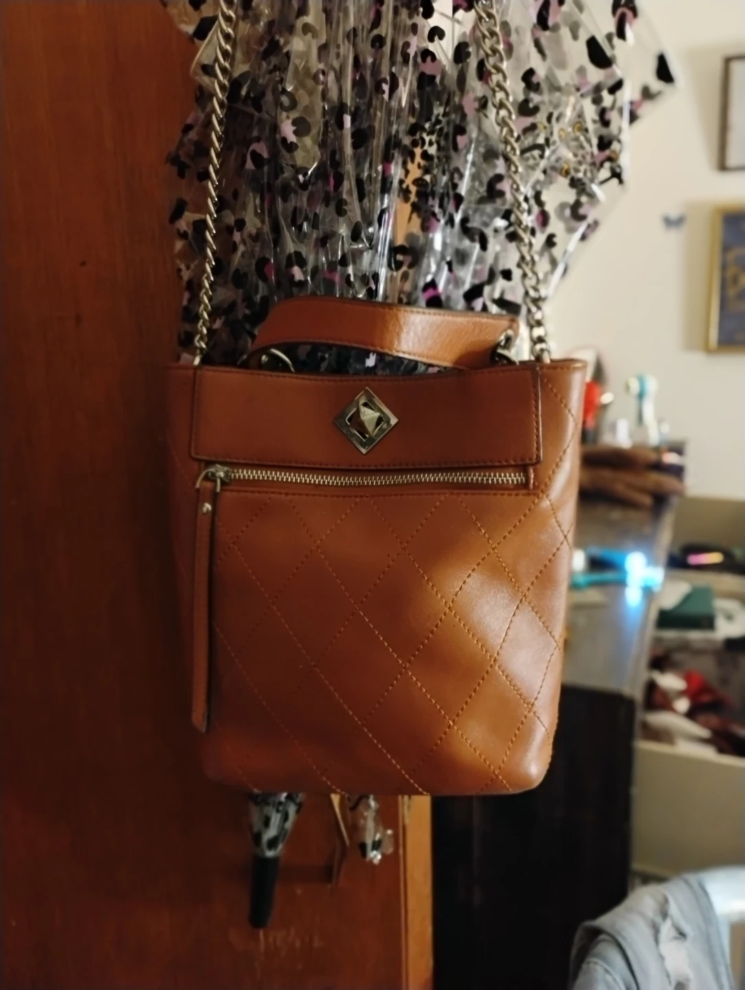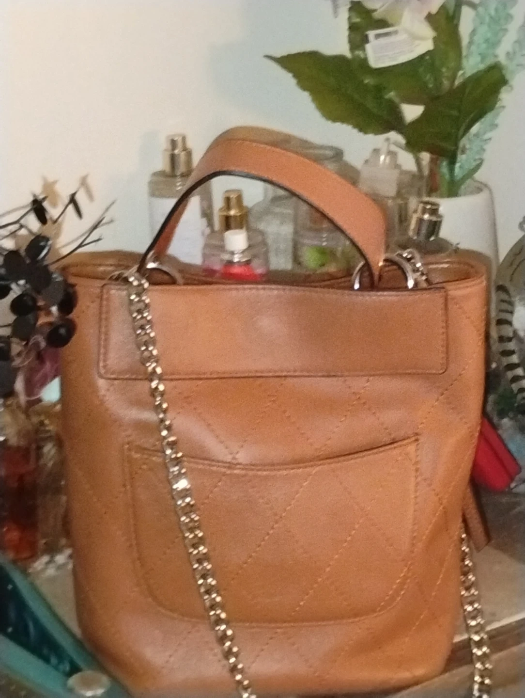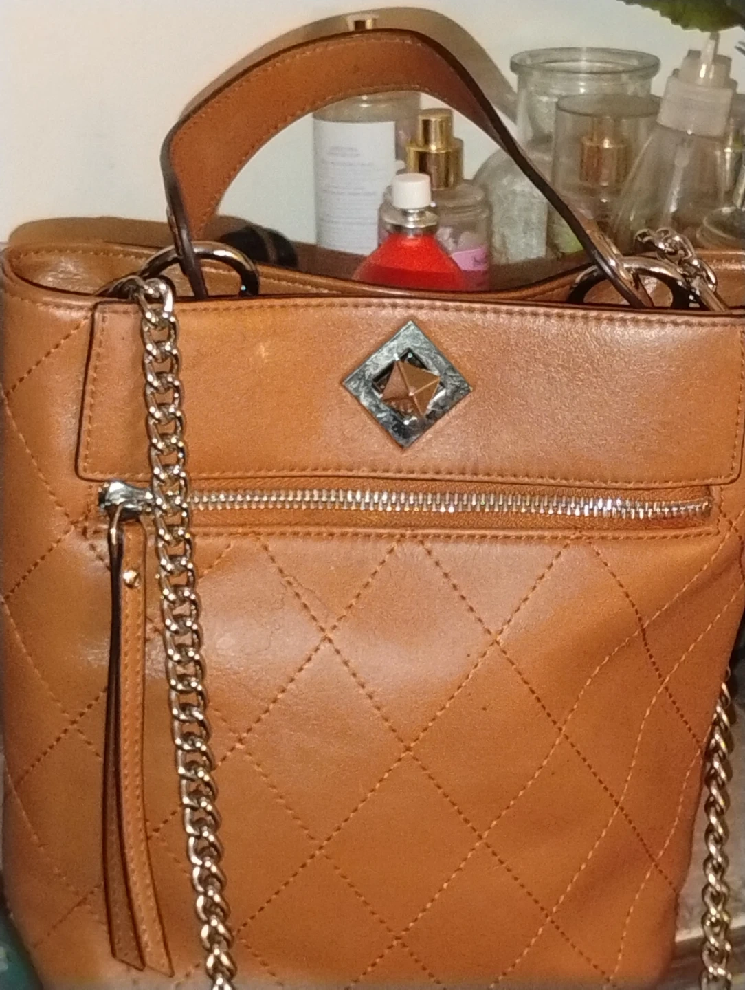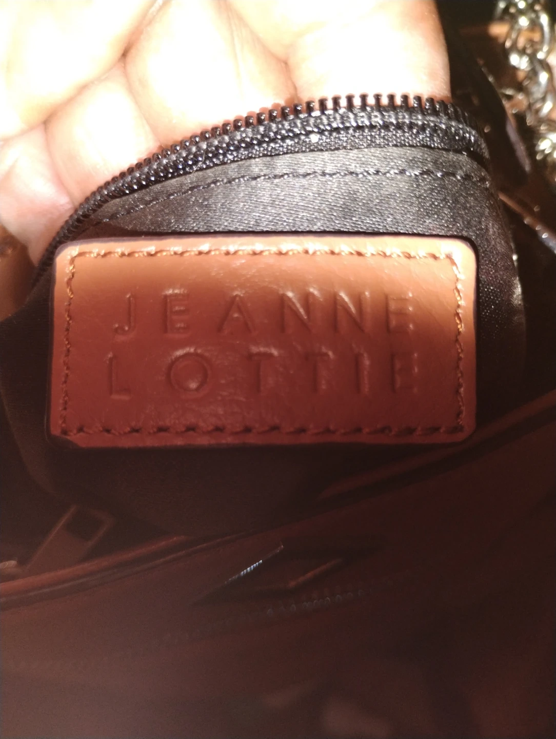 Here's a stylish Jeanne Lottie handbag in a lovely brown leather! It features a quilted design on the front and a convenient zippered pocket. The interior has a zipper as well. Originally bought for $298 CAD