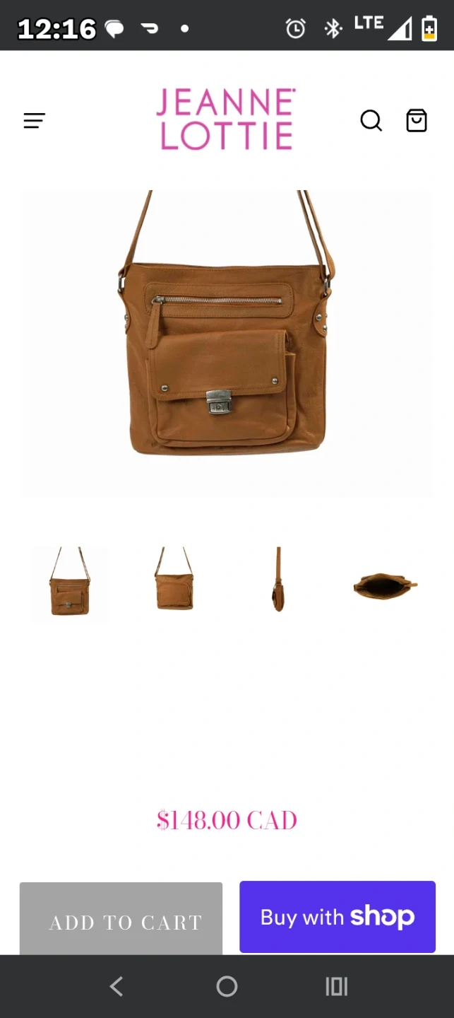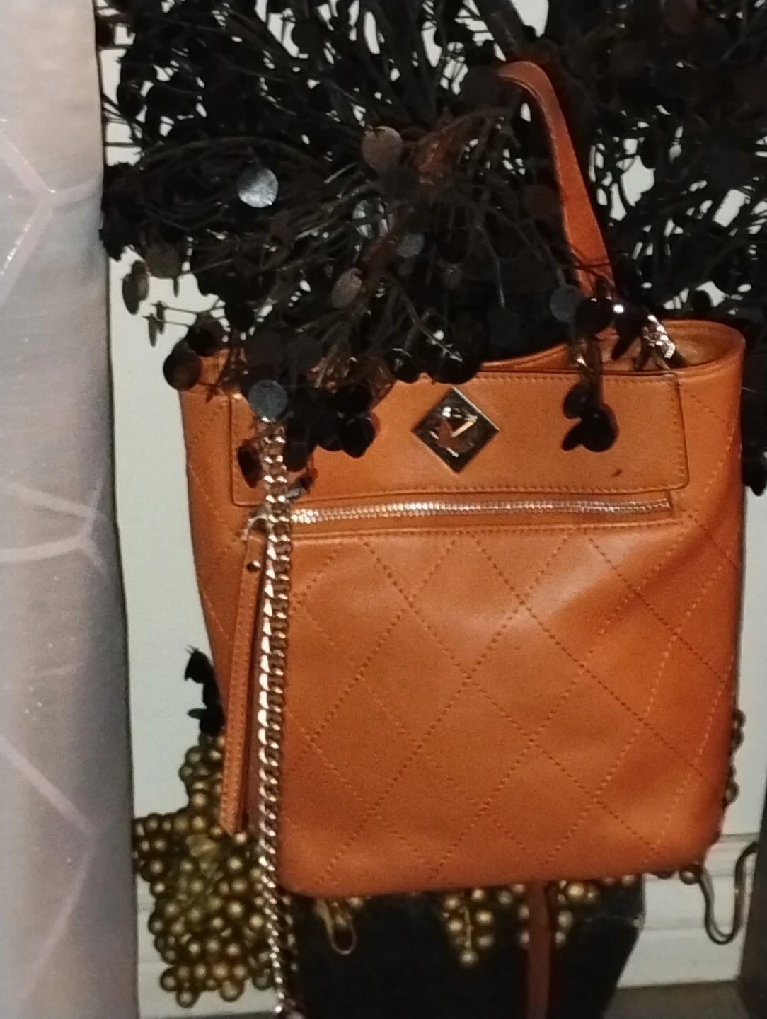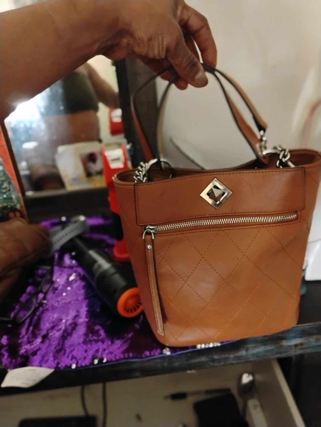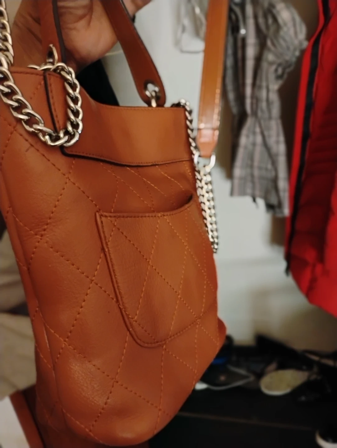 Here's a stylish Jeanne Lottie handbag in a lovely brown leather! It features a quilted design on the front and a convenient zippered pocket. The interior has a zipper as well. Originally bought for $298 CAD