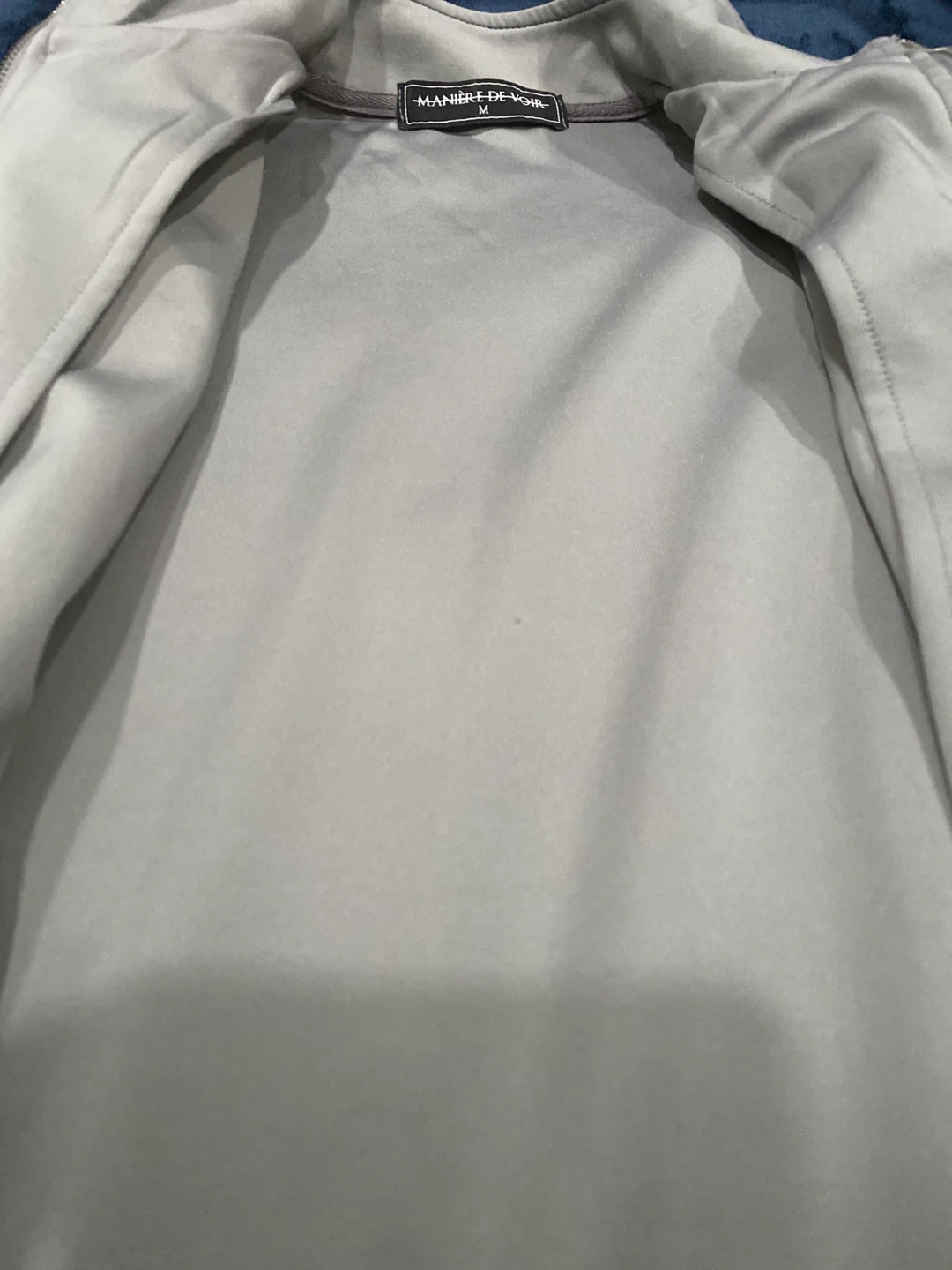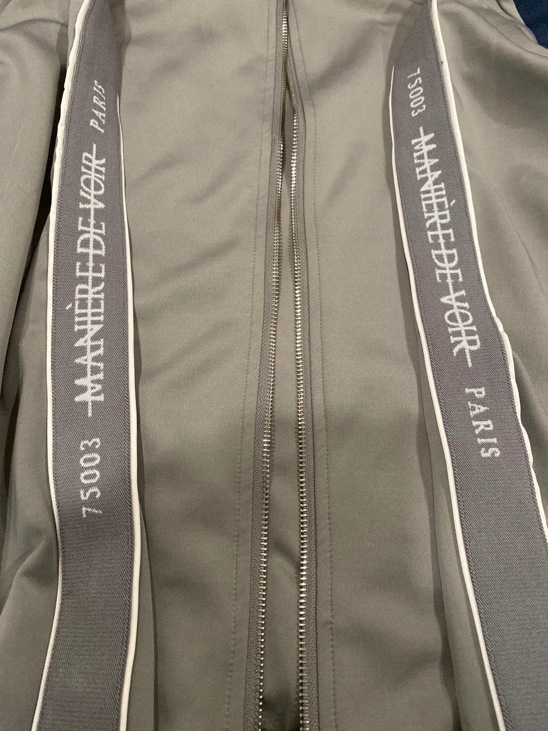 Selling a Maniere De Voir jacket in a nice grey colour. It's a size medium and in great condition. The jacket features a unique design with '75003 MANIERE DE VOIR PARIS' printed on the sides. Perfect for adding a stylish touch to your wardrobe!