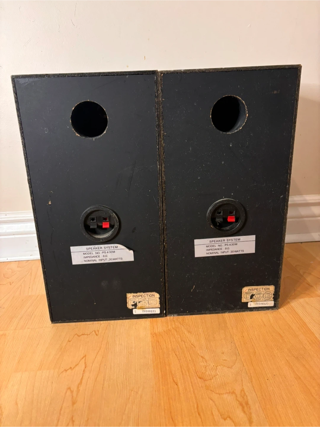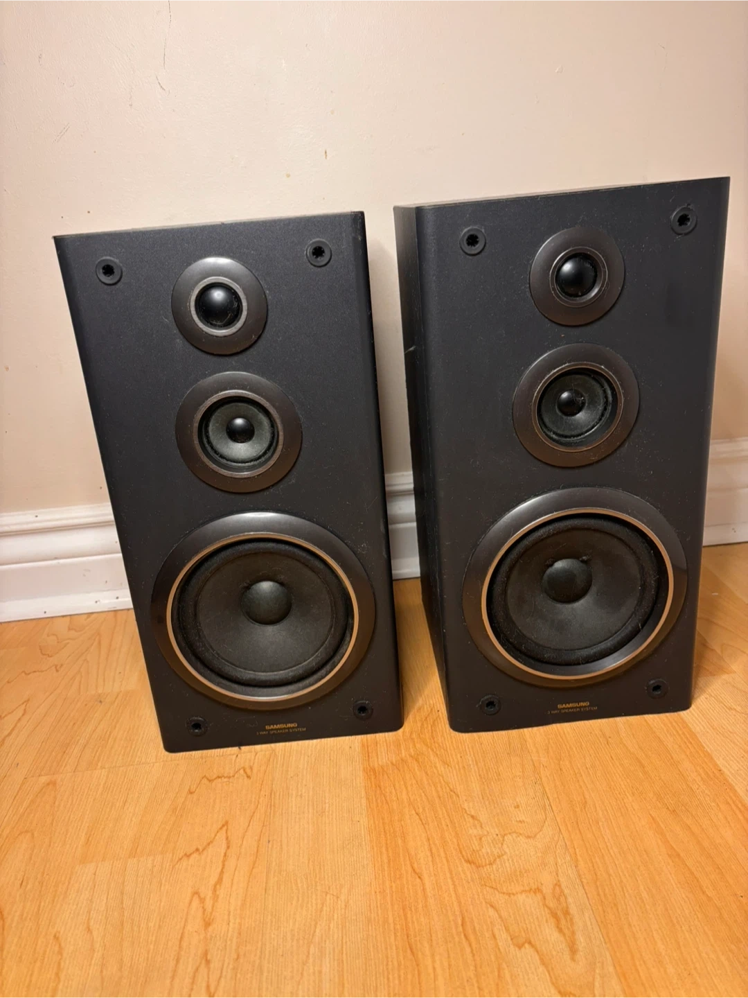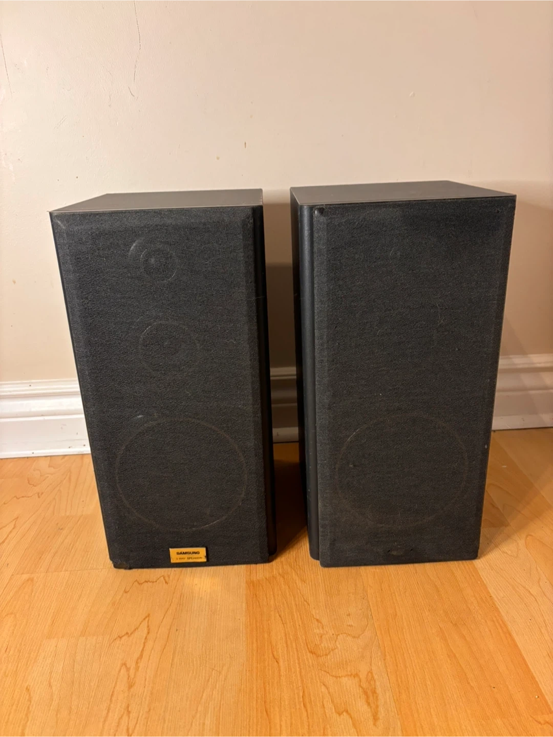 $90 for bundle or best offer - Selling a complete 3-speaker home audio setup including a pair of Samsung PS-430M 3-way speakers and a CIAIA centre channel speaker. These speakers work perfectly and sound beautiful. Cosmetic wear from normal use.