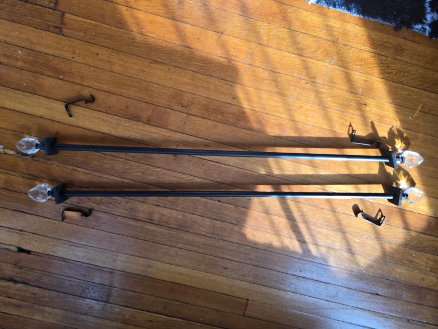 Two curtain rods with decorative crystal finials. They appear to be in good condition and include the mounting brackets.