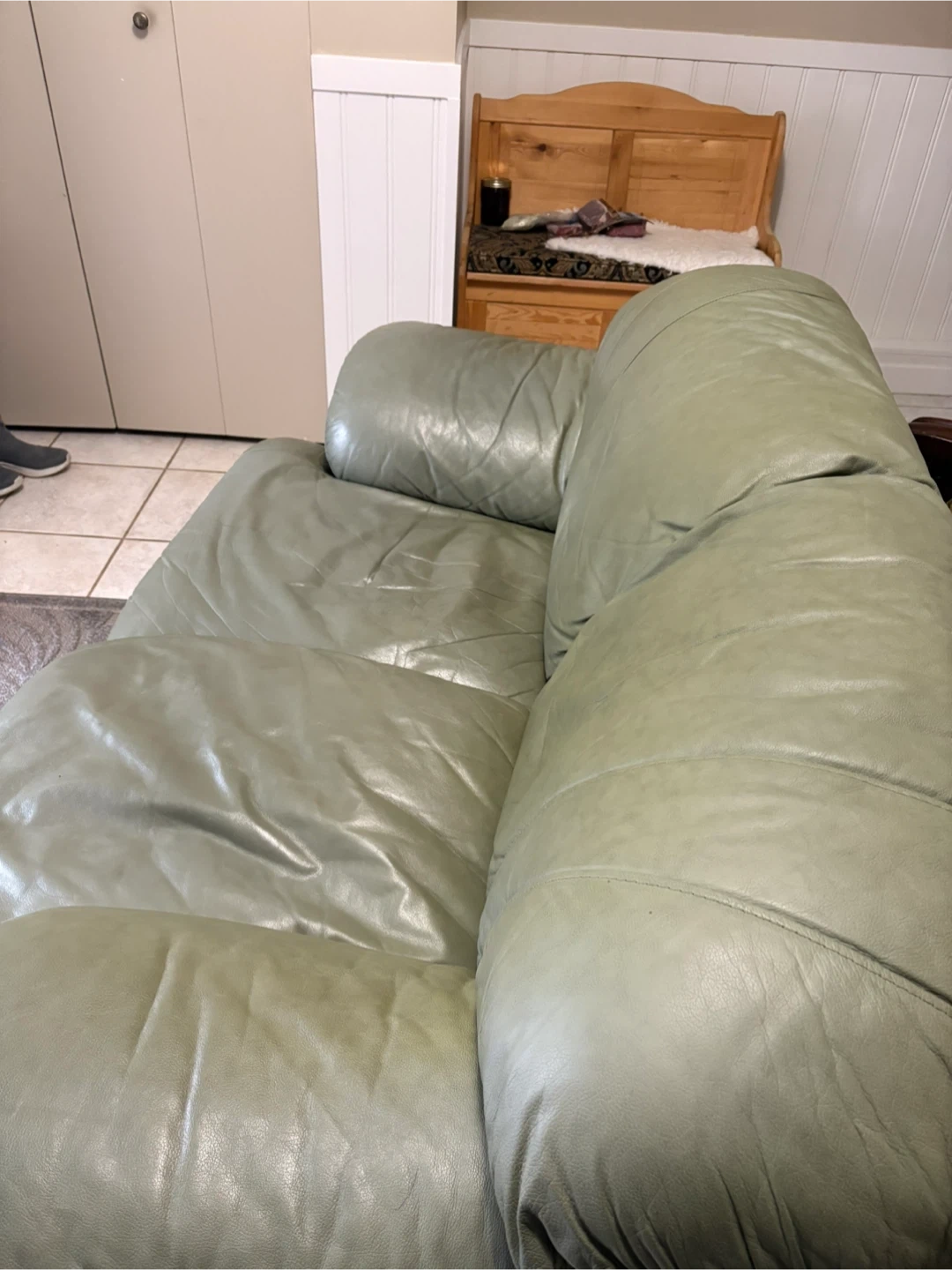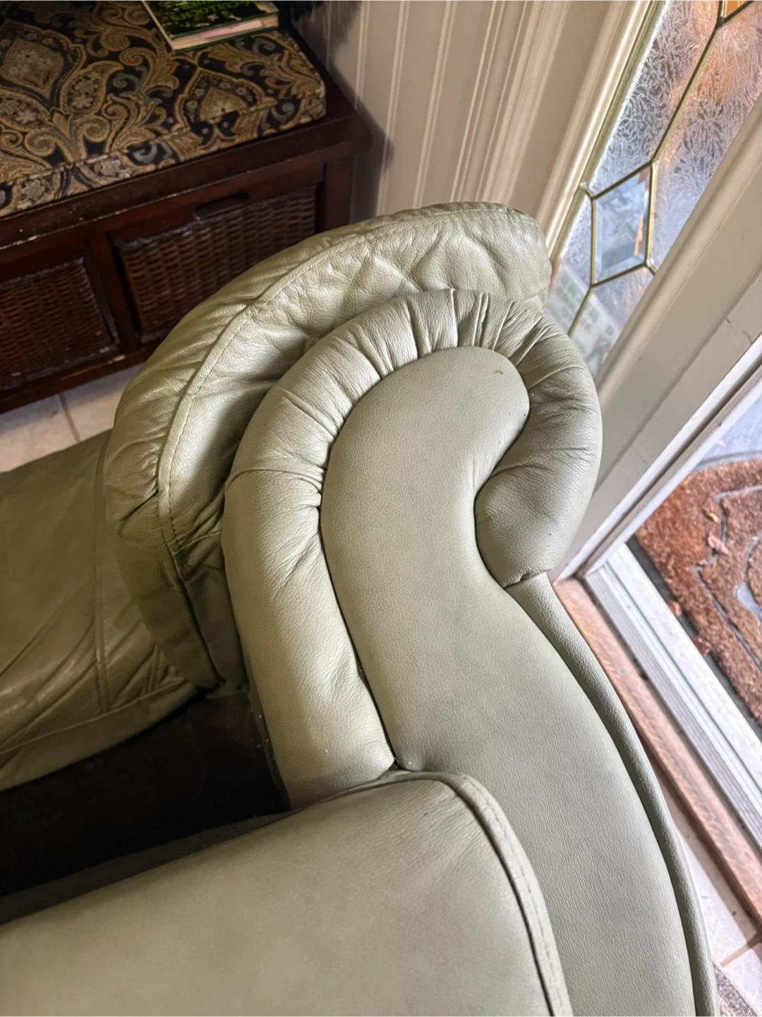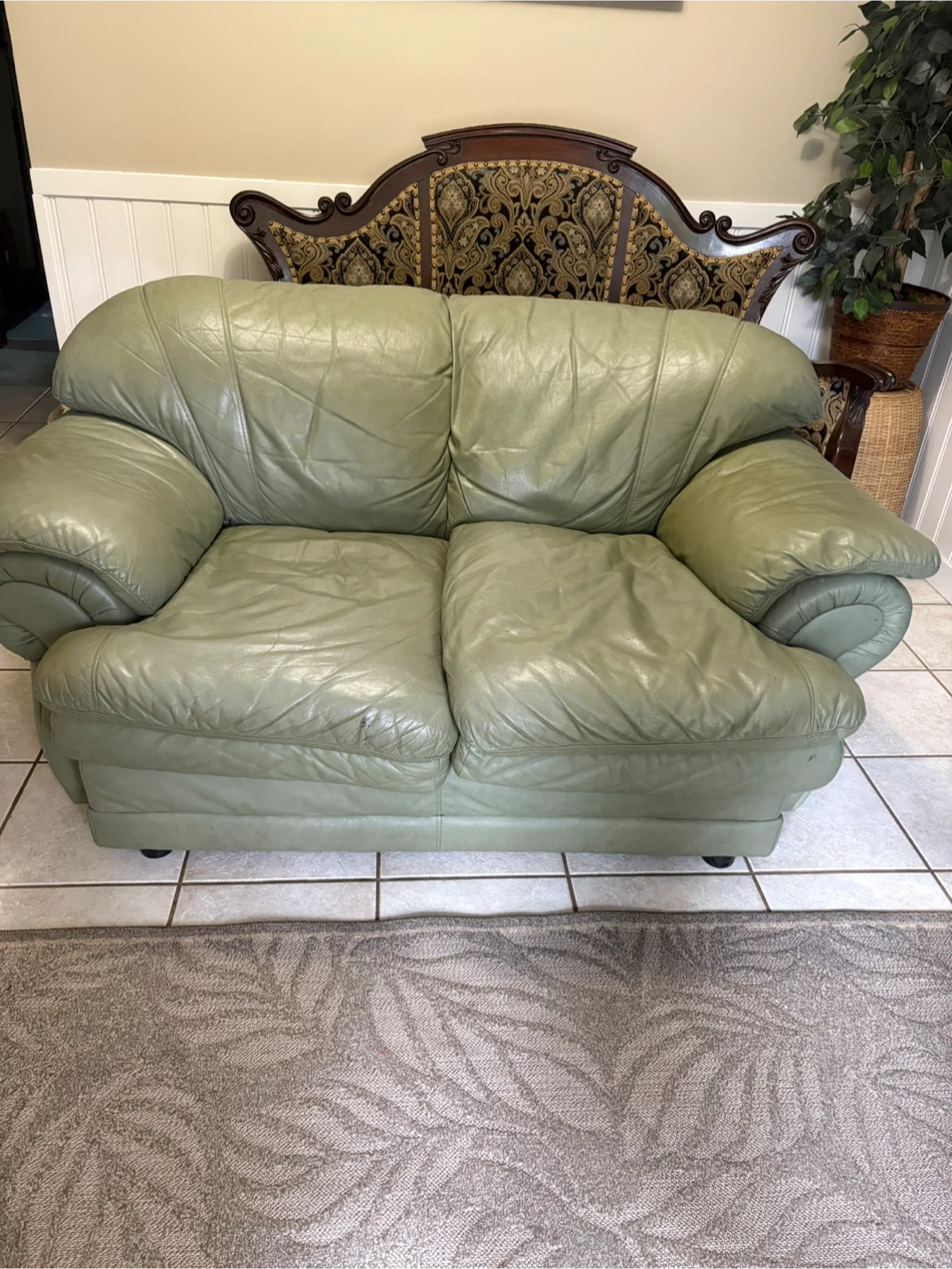 Selling a comfy light green leather sofa! It's in used condition, but still has lots of life left. Perfect for a living room or den. The leather is soft and the cushions are supportive