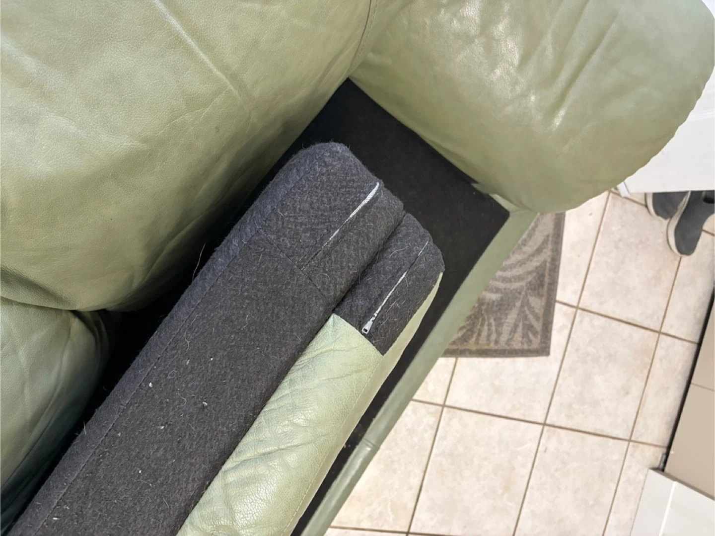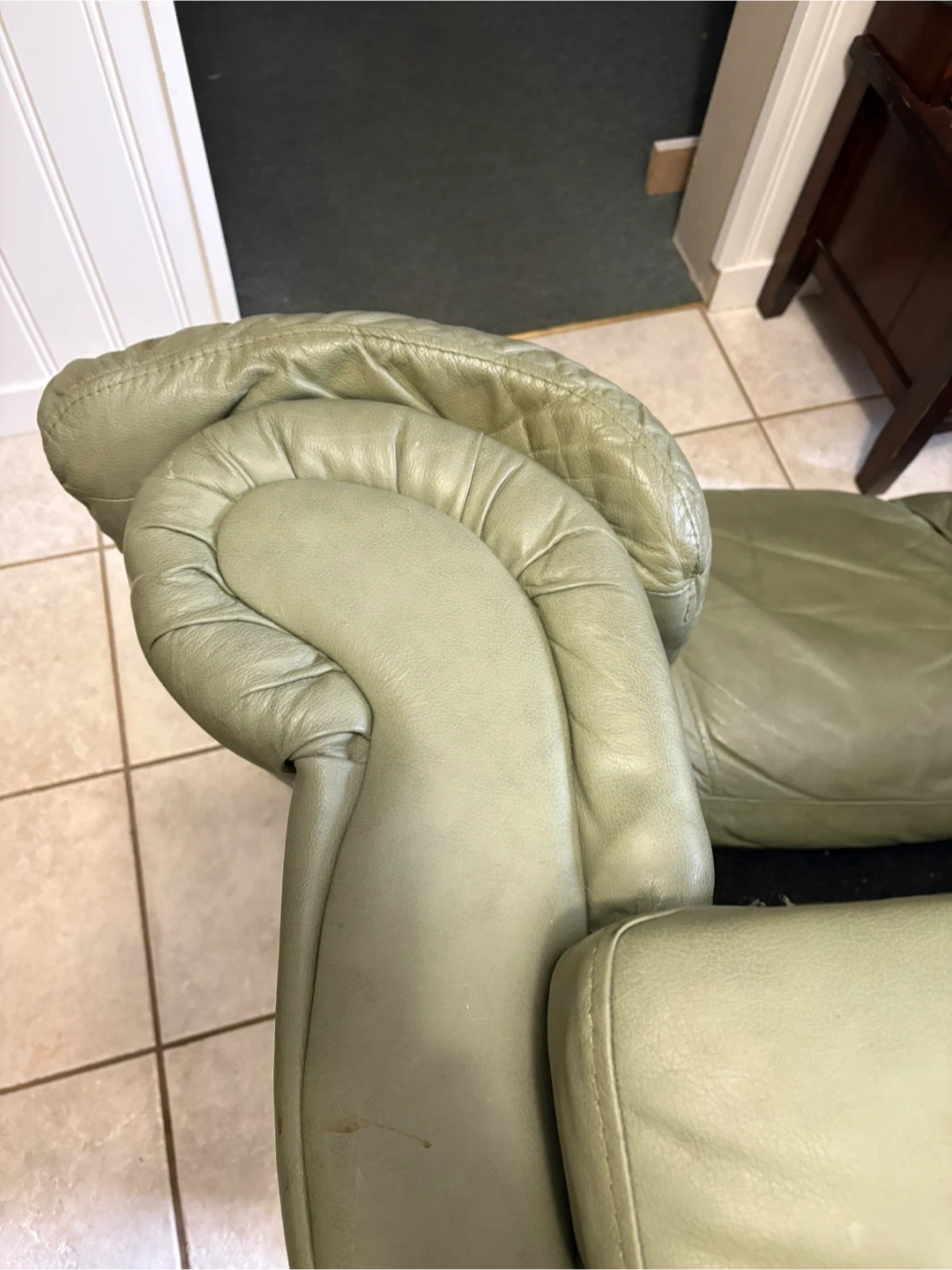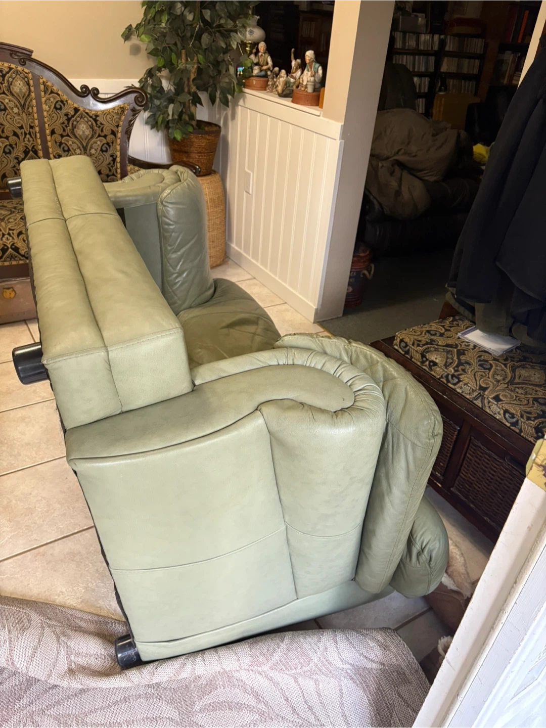 Selling a comfy light green leather sofa! It's in used condition, but still has lots of life left. Perfect for a living room or den. The leather is soft and the cushions are supportive