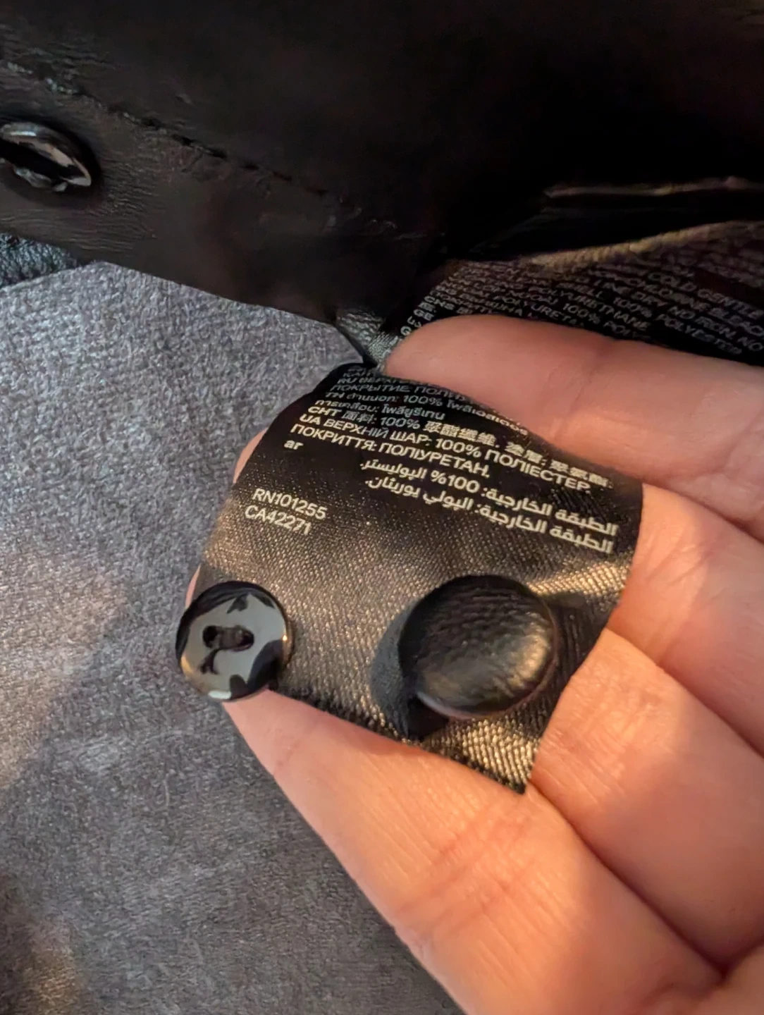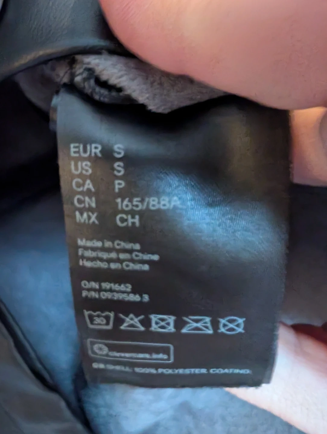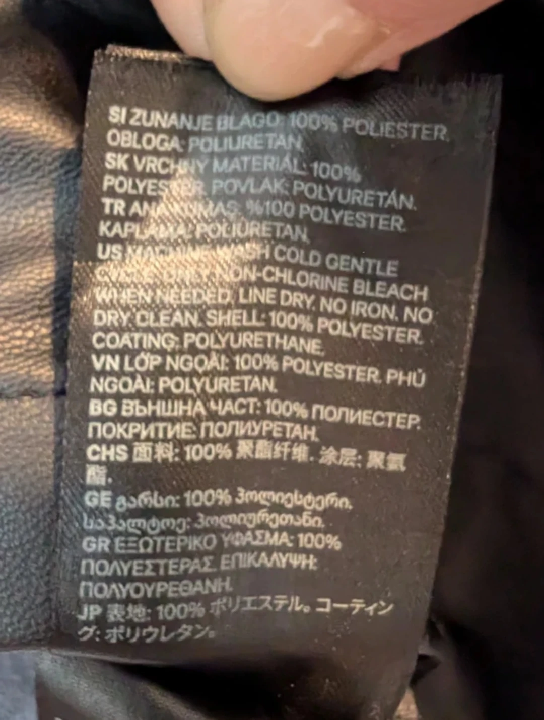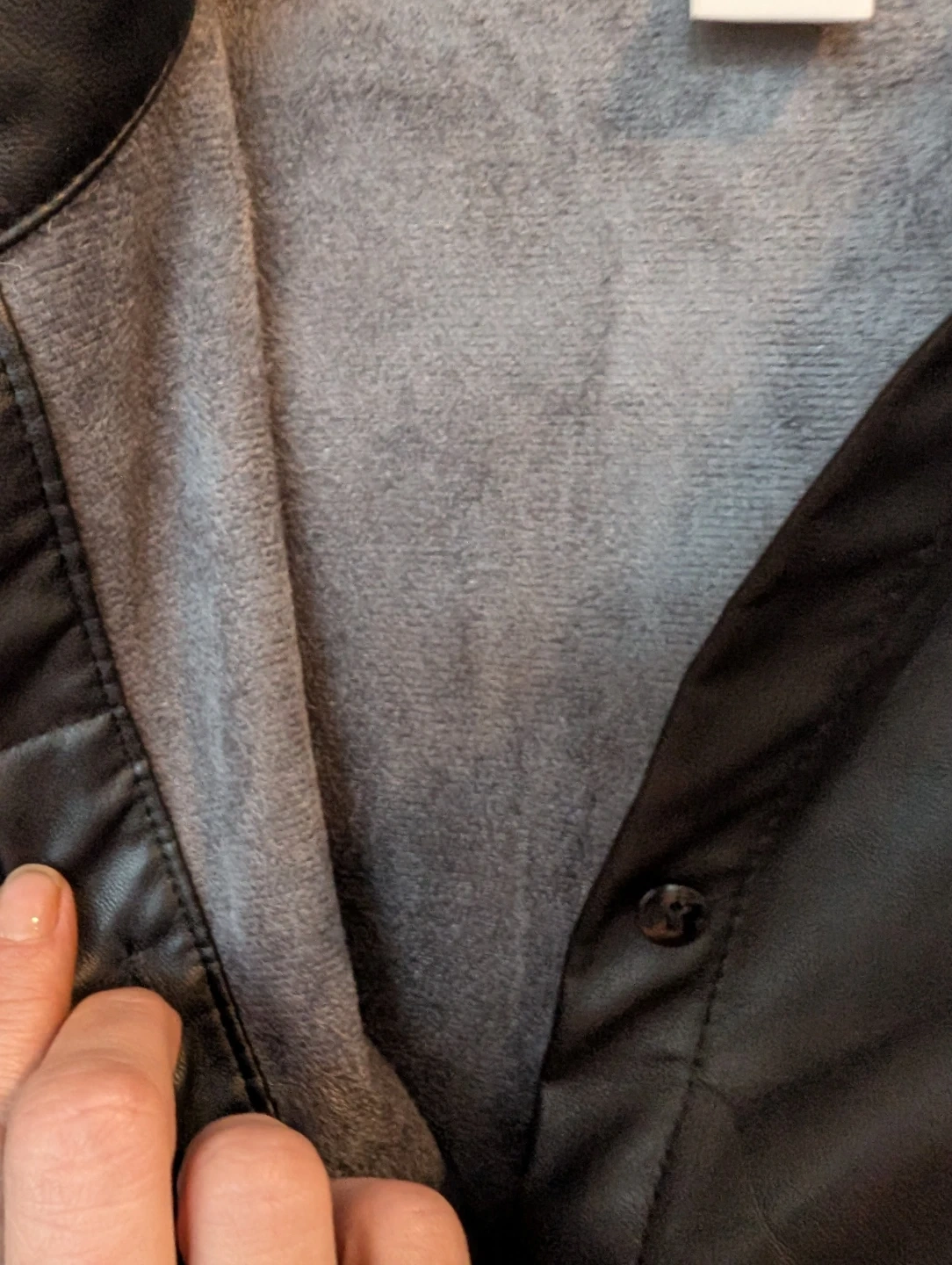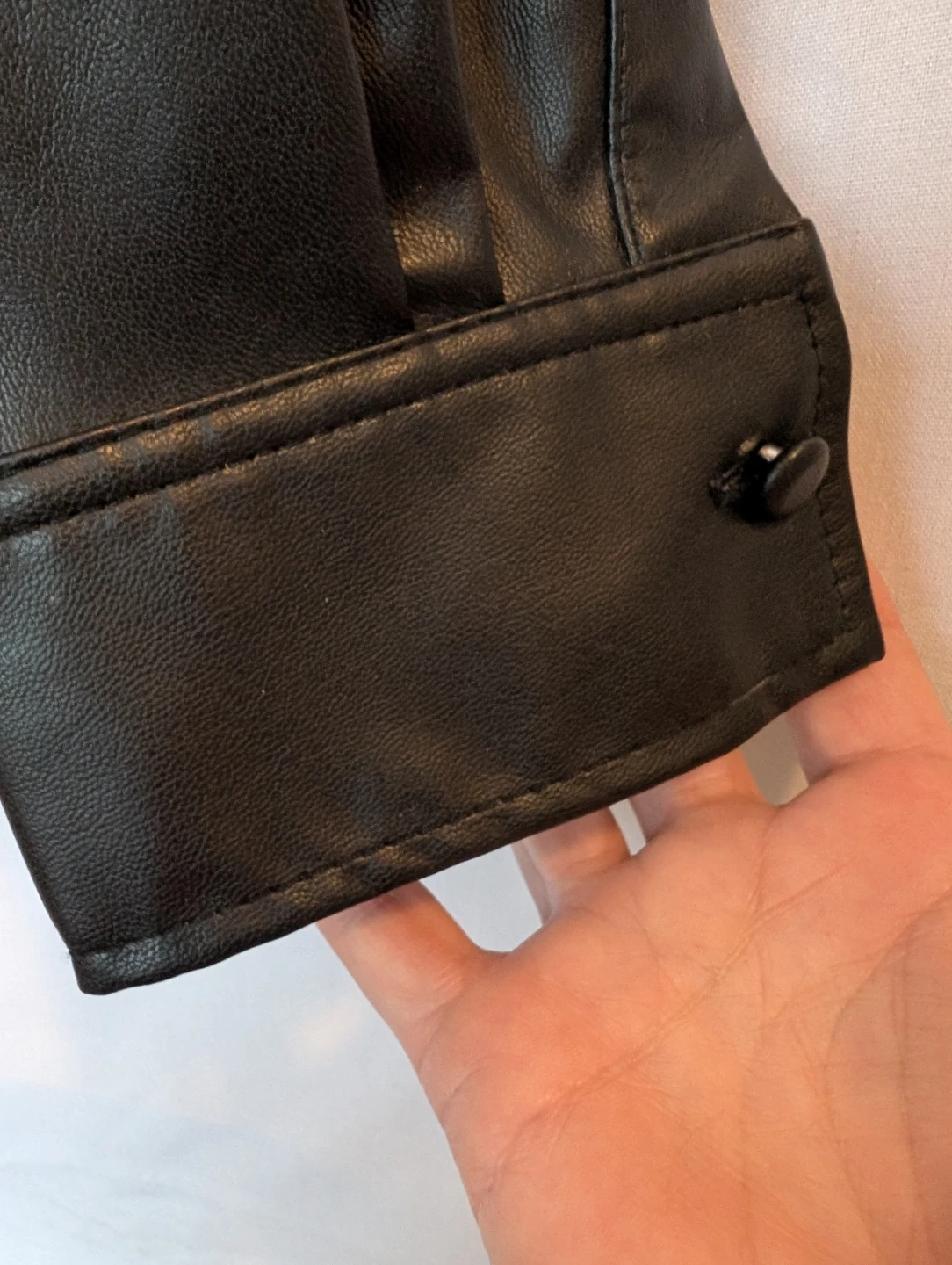 Selling a black faux leather shirt from H&M in size small. Relaxed fit. It's in perfect condition except a missing button on one cuff as shown in the pictures. Luckily, it has a replacement button attached to the tag.