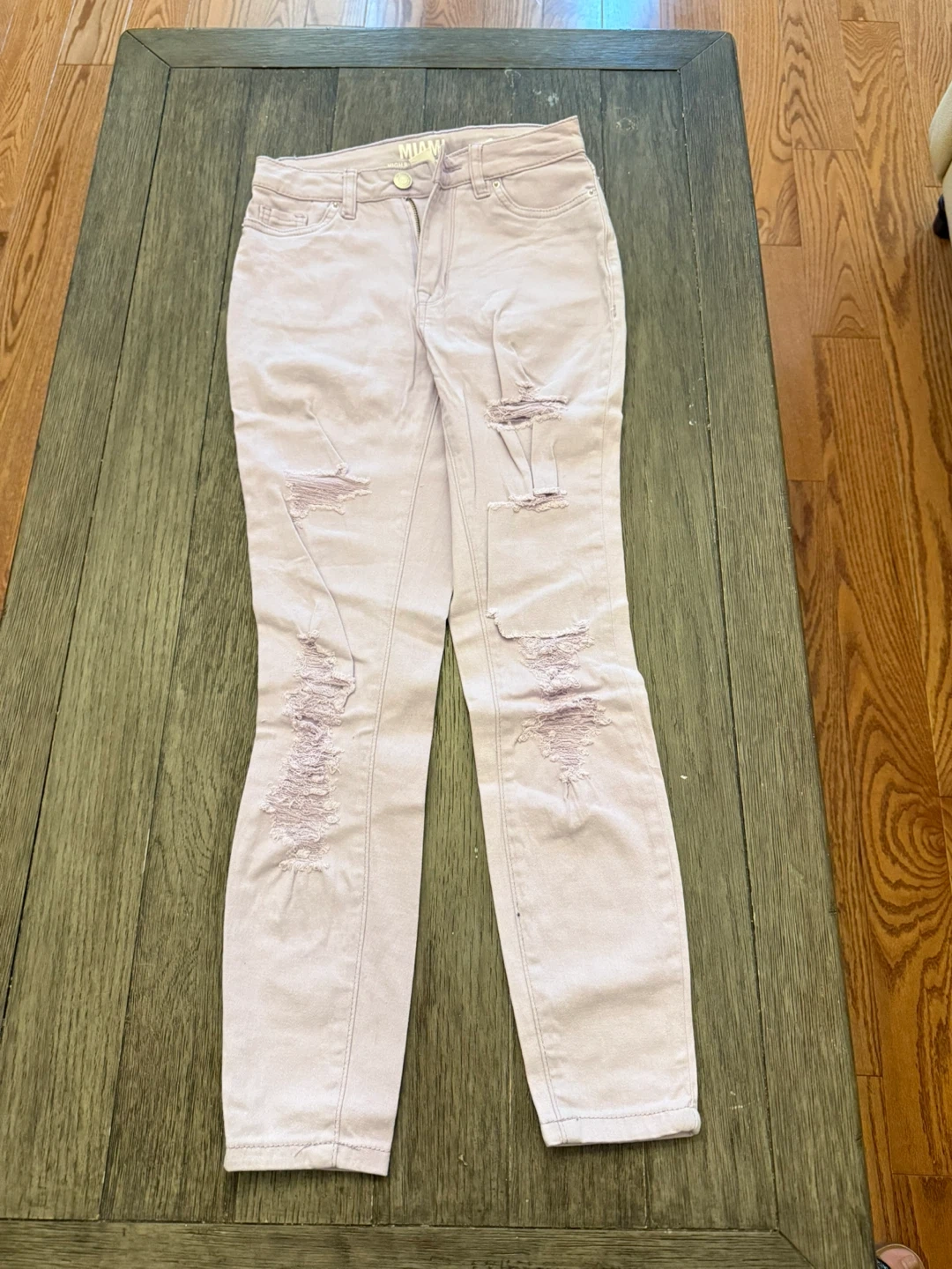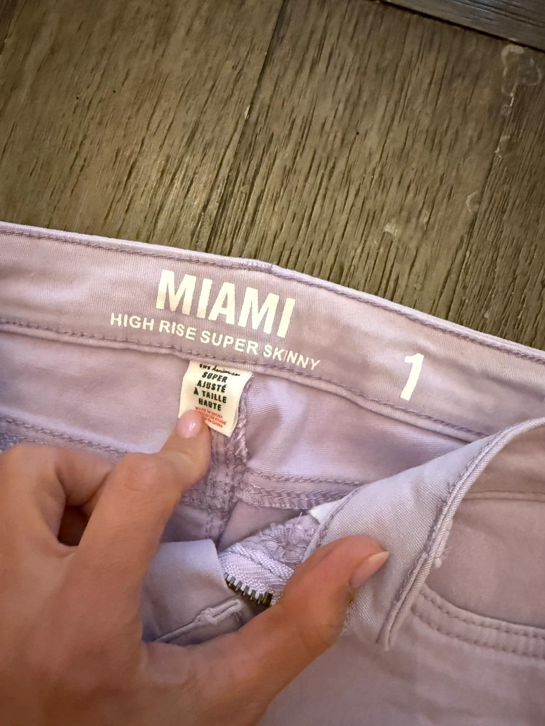 Selling a pair of Miami brand high rise super skinny jeans in a light purple colour. They are a size 1 and have a distressed, ripped look. Perfect for adding a bit of edge to your outfit!