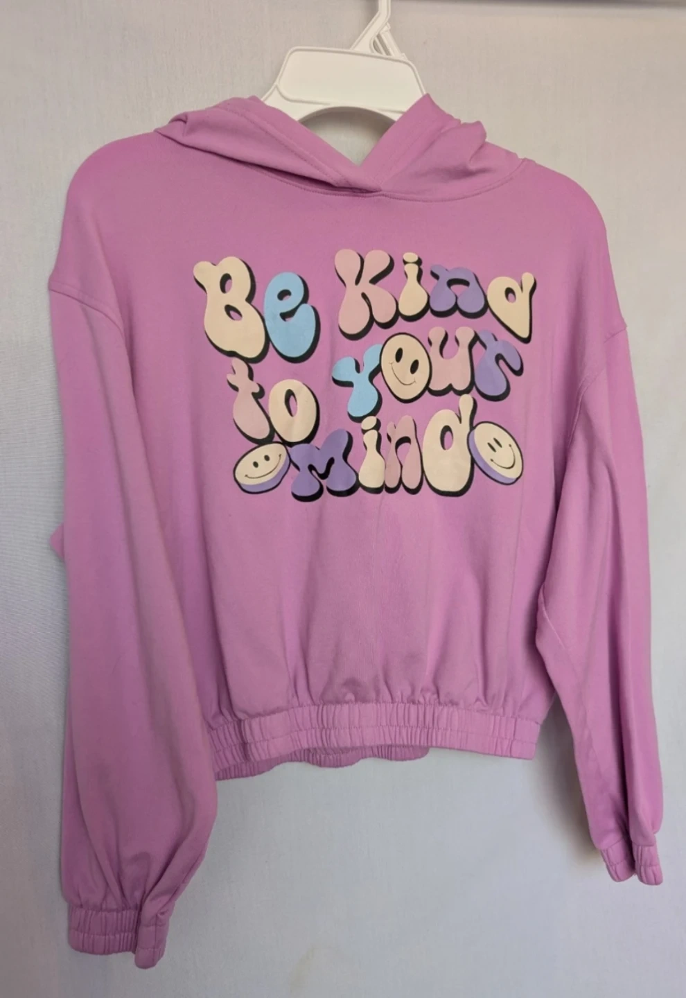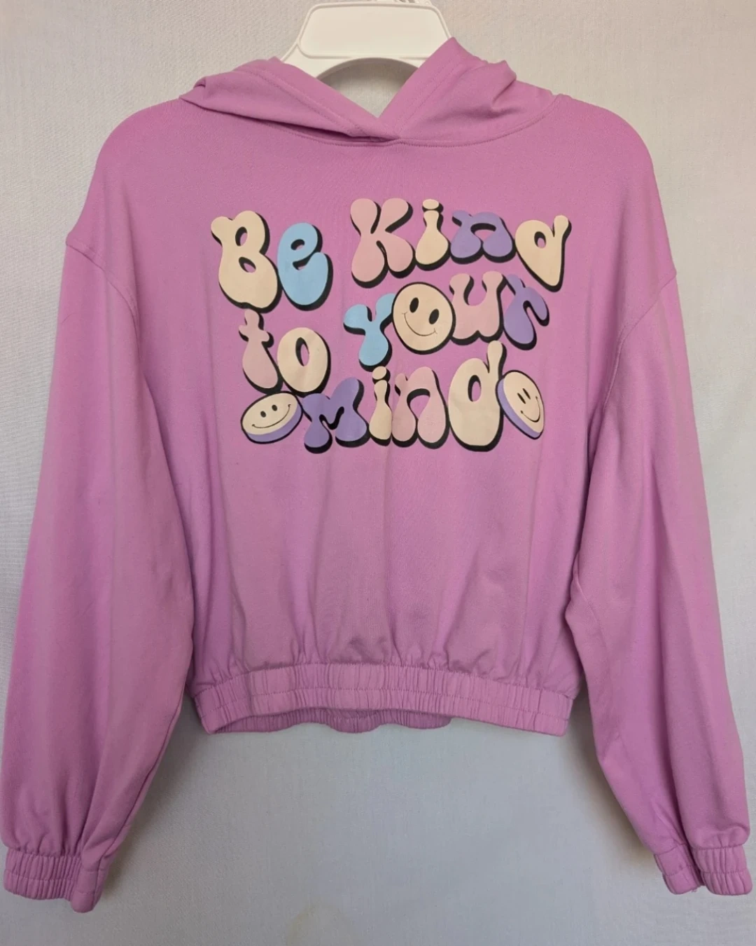 Urban Kids hoodie. Lovely lilac colour that says "Be Kind to Your Mind" with smiley faces. The size is M (10/12). Not heavy. Light, soft fabric.