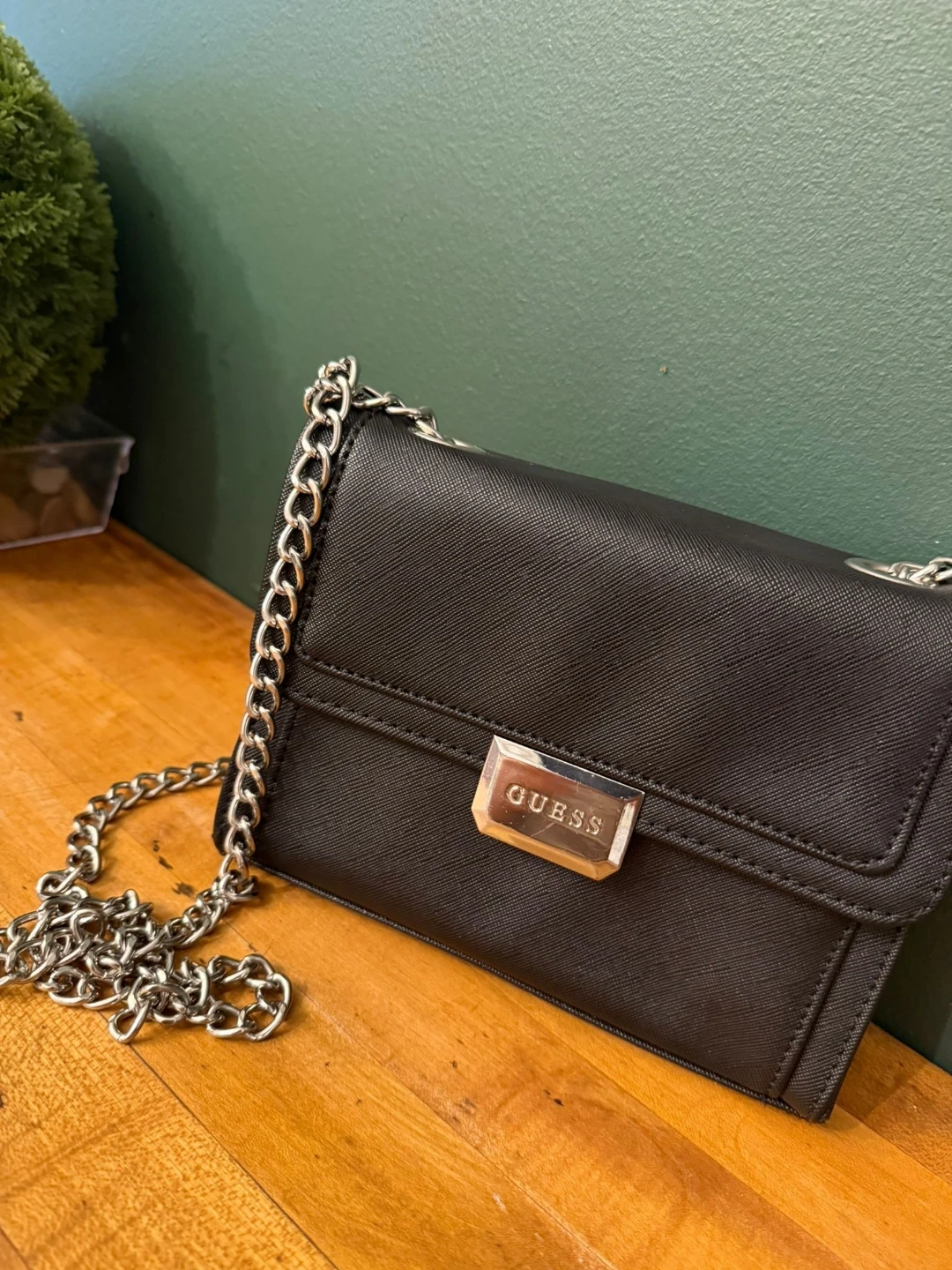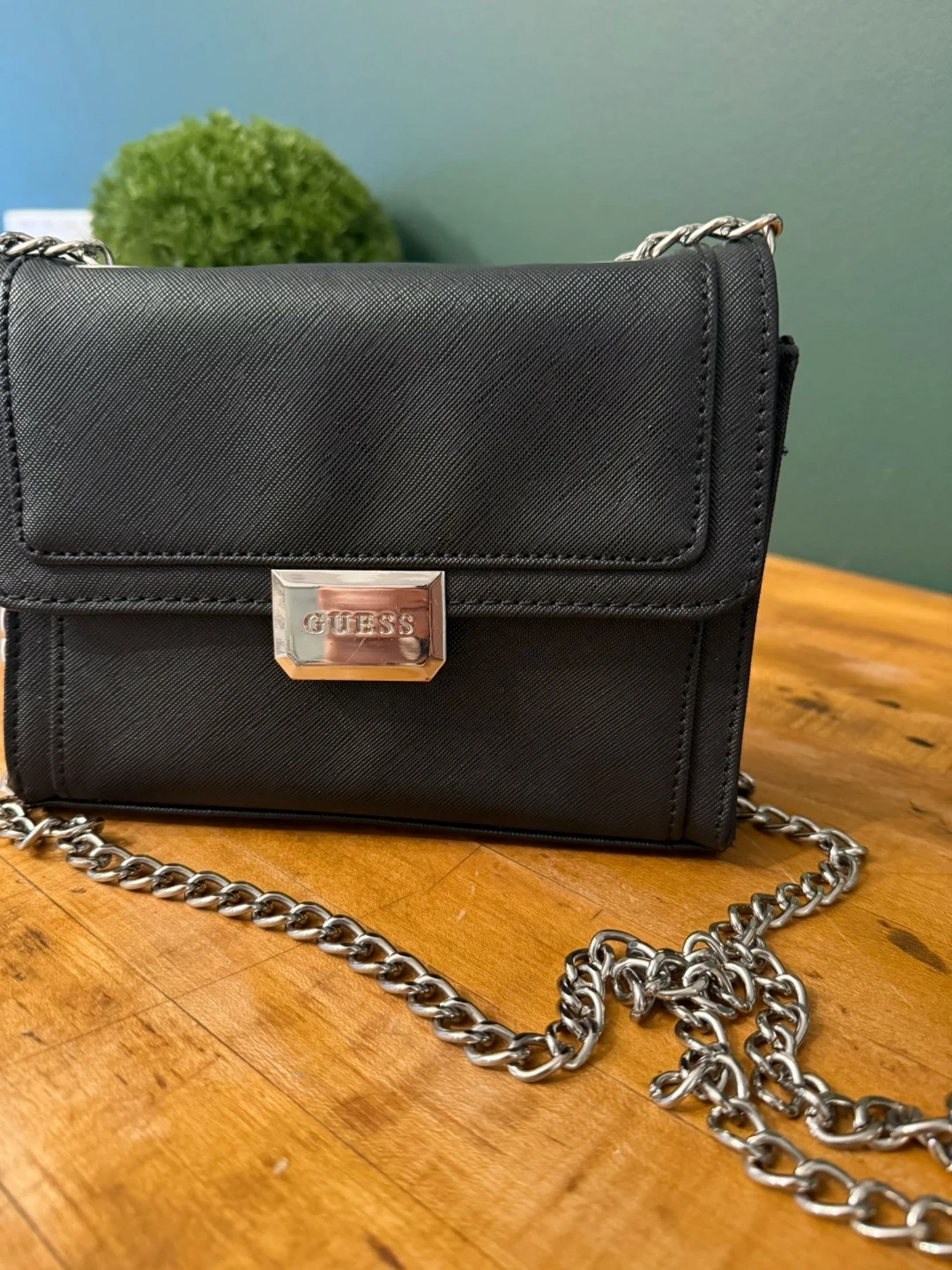 This is a stylish black Guess crossbody bag with a chain strap. It's in great condition and perfect for carrying your essentials!