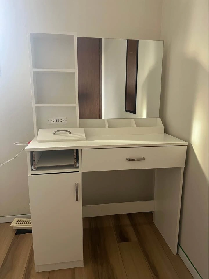 This makeup desk is equipped with 10 adjustable LED bulbs featuring three color modes, allowing you to customize the brightness for any makeup look. The large tabletop includes three open shelves, three compartments, two drawers, and one storage cabinet, providing ample space for makeup, jewelry, and other accessories.