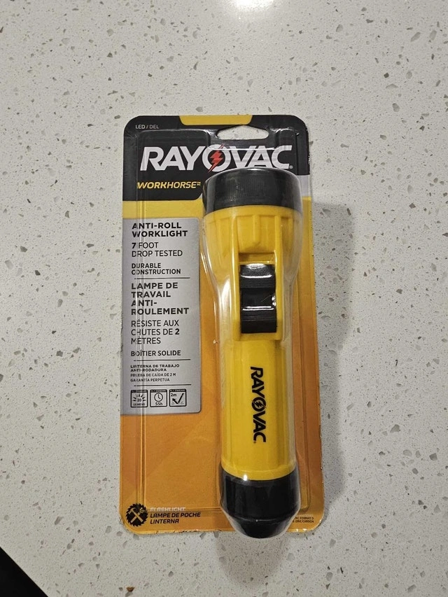 I'm selling a brand new Rayovac Workhorse flashlight, still in its original packaging. This durable LED worklight is drop-tested and designed with an anti-roll feature, making it perfect for any job. Its bright and long-lasting beam ensures visibility in any situation.