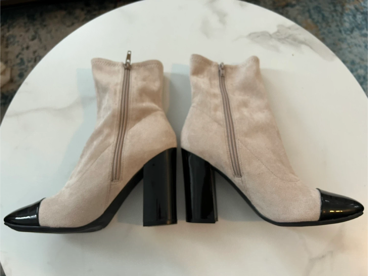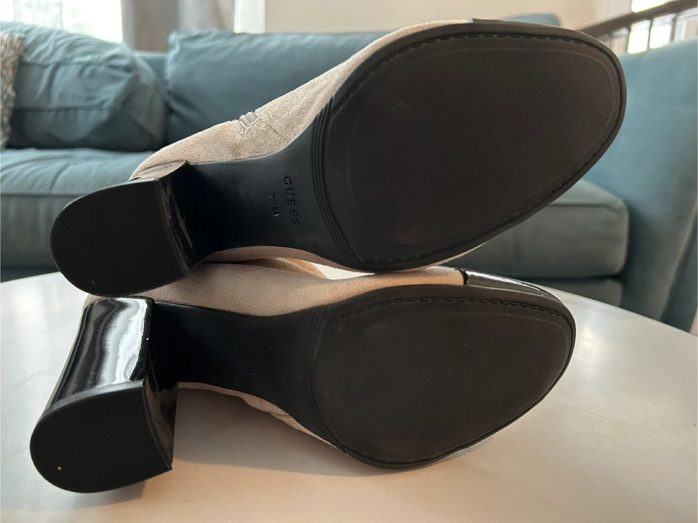 These are a pair of Guess boots in size 7.5. They have a beige upper and a black heel and toe cap detail. They feature a zip closure.