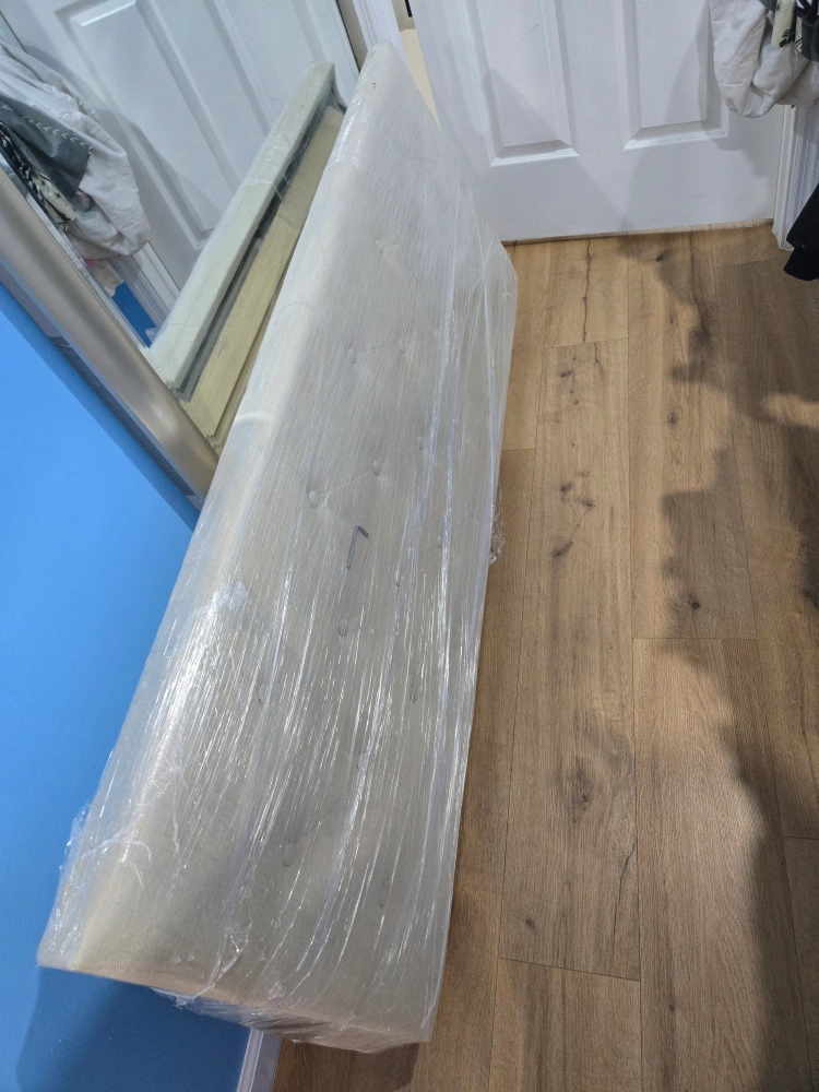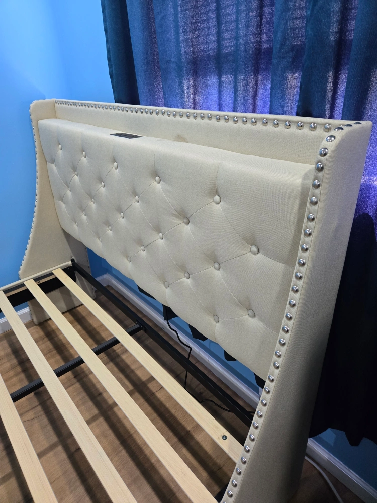 Selling a platform bed frame with an upholstered headboard. It features a light beige fabric with button tufting and silver nailhead trim. There are also built-in outlets and USB ports on the headboard. The bed frame is in good condition and ready for a new home