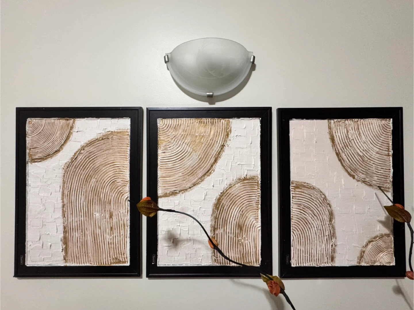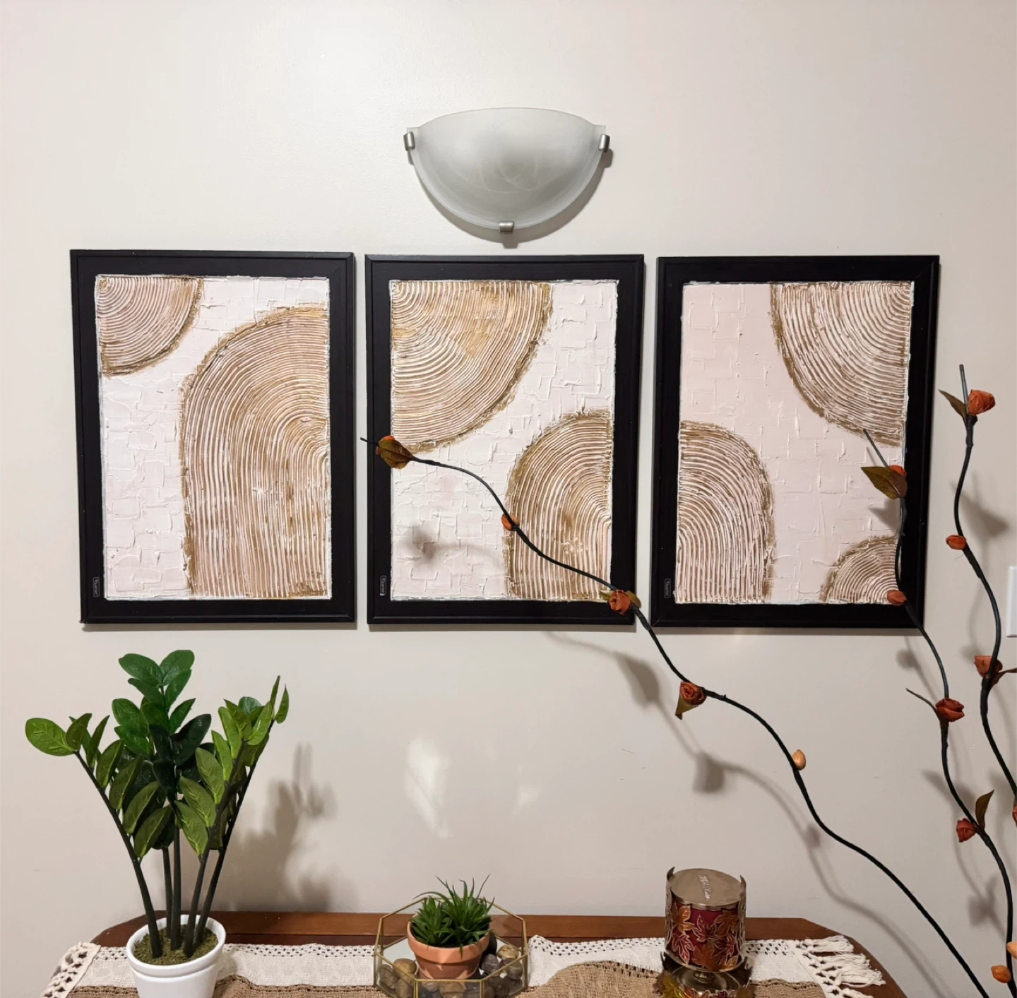 Beautiful handcrafted textured wall art set featuring soft curved patterns and a timeless neutral palette. Each panel is individually textured by hand, creating depth and movement while keeping a calm, modern aesthetic.