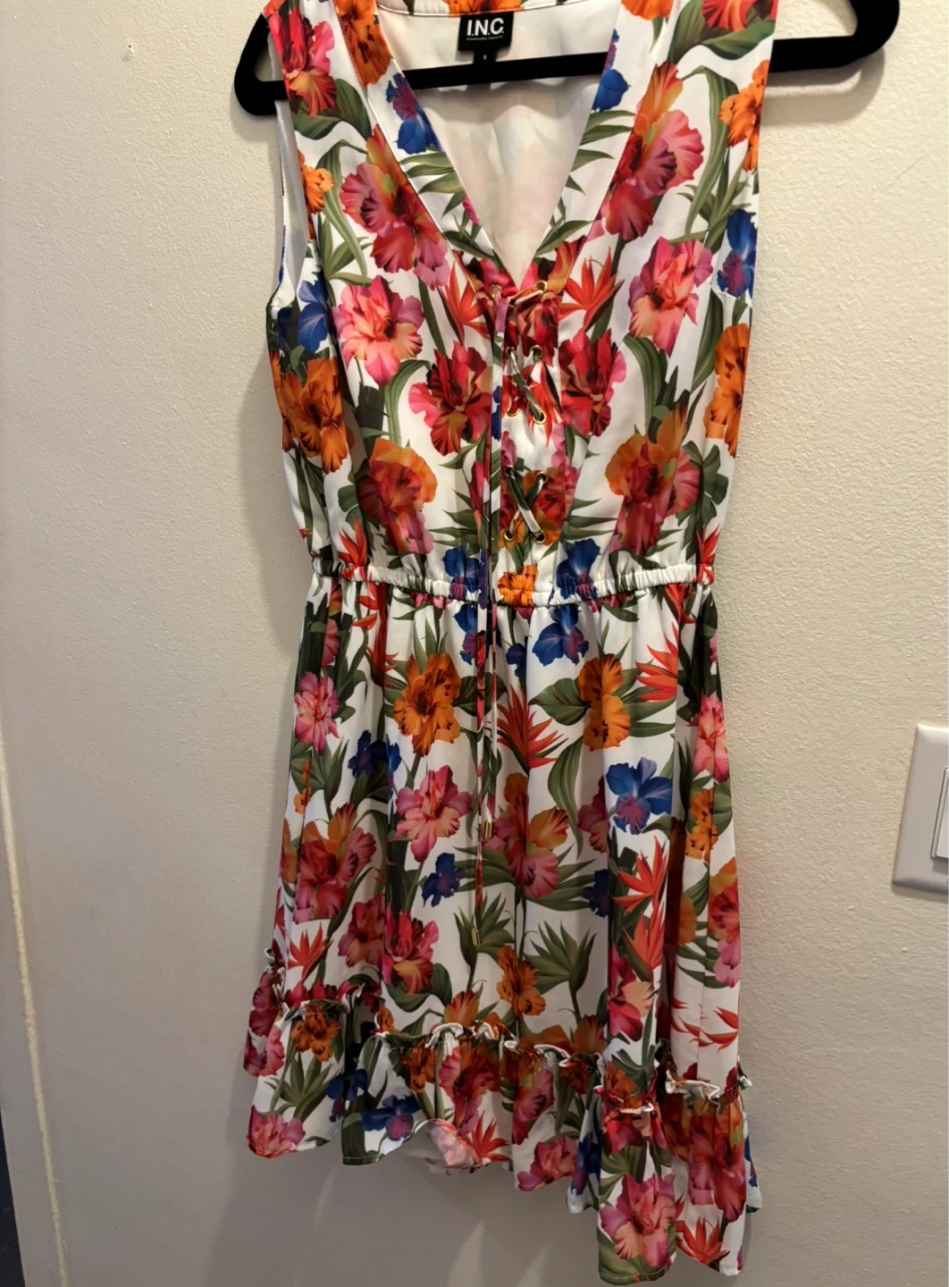 Selling a cute INC dress with a bright floral print! It's a size small and features a flattering v-neckline with a drawstring detail. The dress has a comfortable elastic waist and a ruffled hem. Perfect for spring or summer!