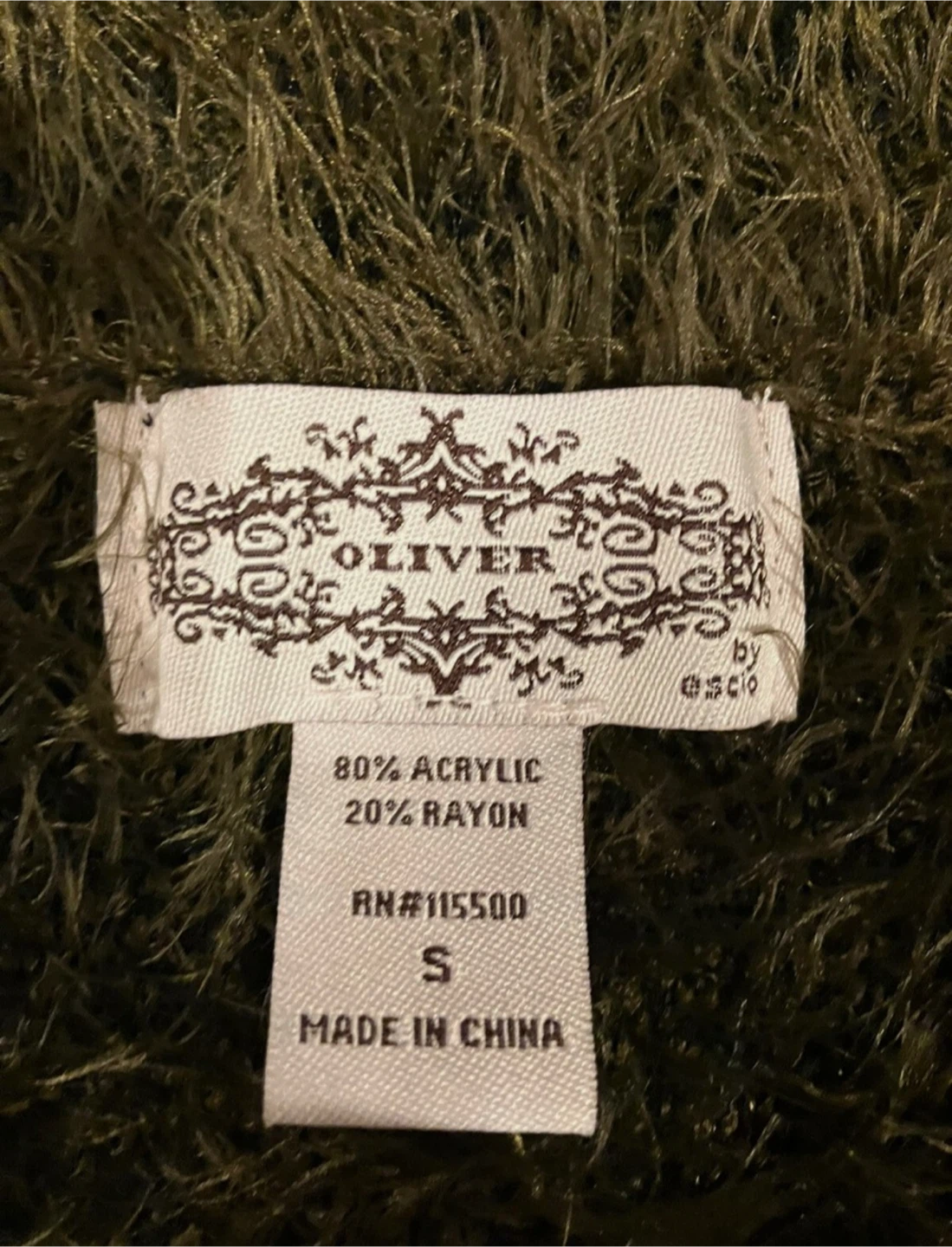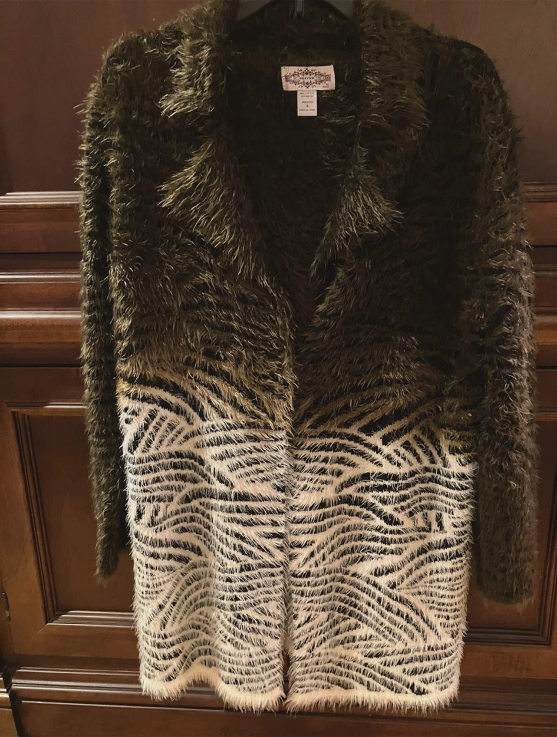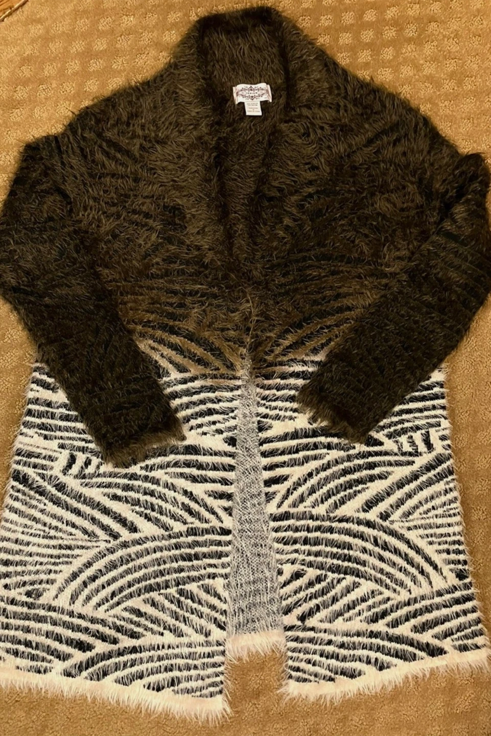 Selling an Oliver by cLo cardigan in size small. It's made of 80% acrylic and 20% rayon. The cardigan features a unique design with a mix of textures and patterns