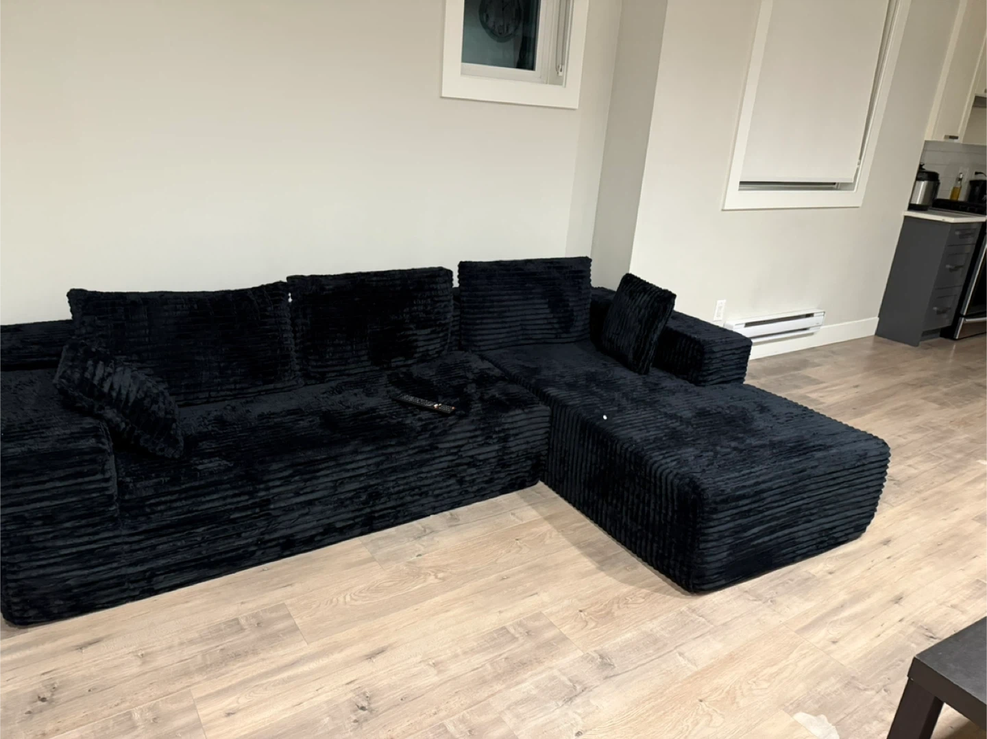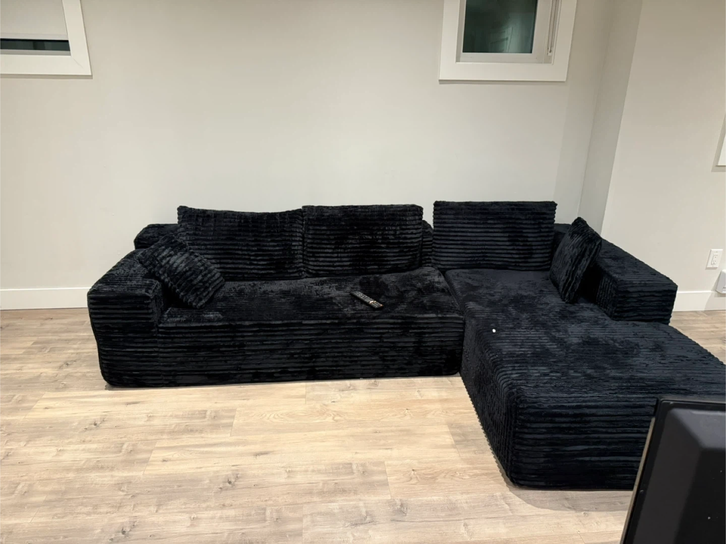 Selling a comfy corduroy sectional sofa in black colour and never been used ! It's in great shape and ready for a new living room. Perfect for relaxing and lounging after a long day