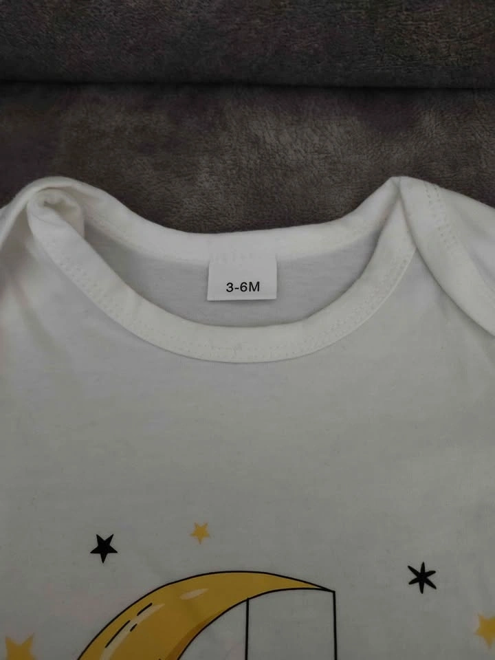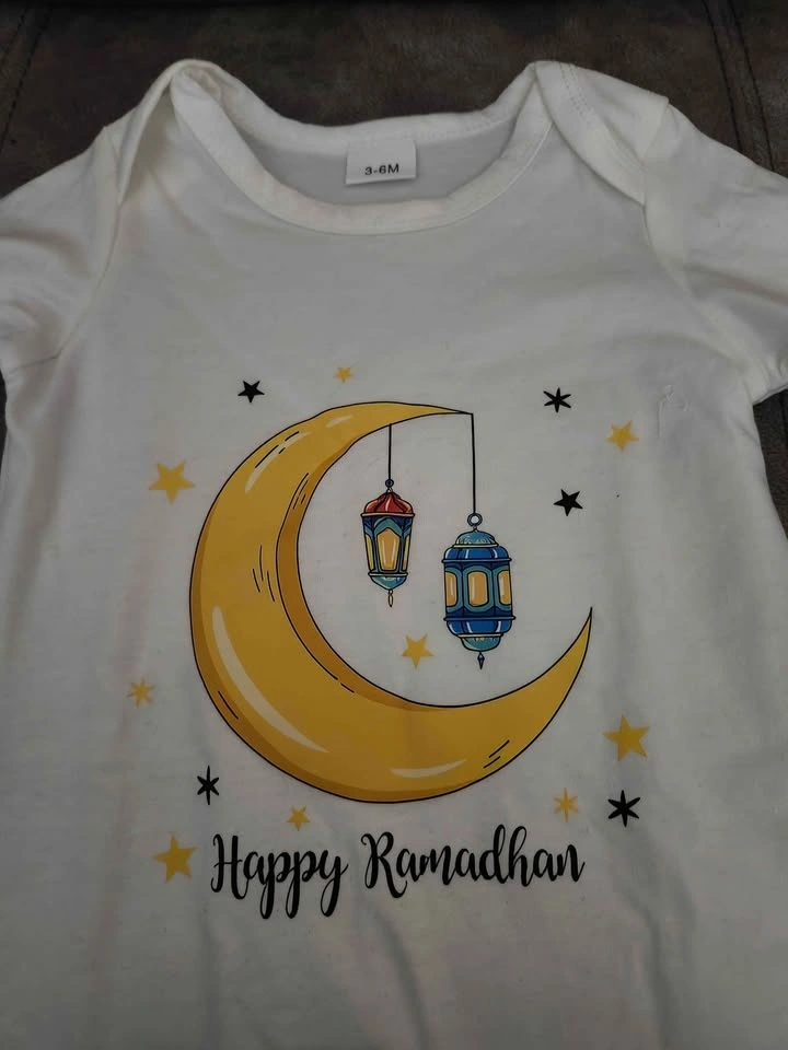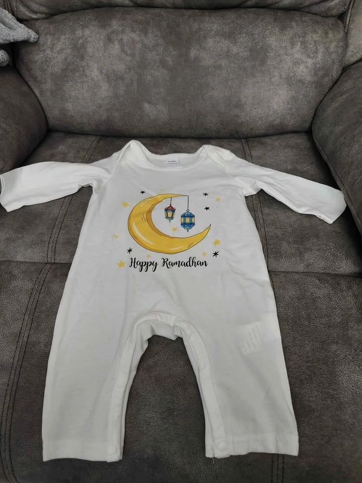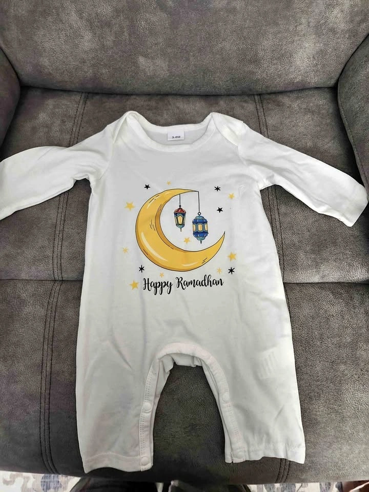 Celebrate Ramadhan in style! This brand-new white baby romper (3–6M) features long sleeves and a convenient snap closure. Adorned with a charming golden crescent moon, two hanging lanterns, and sparkling stars, with “Happy Ramadhan” written in elegant black script, it’s perfect for little ones or as a thoughtful gift. Made from a soft, comfy cotton blend.