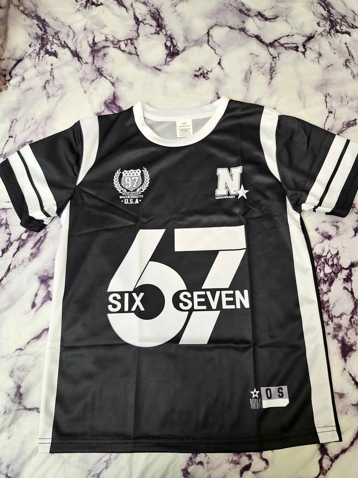 Trendy oversized unisex T-shirt inspired by soccer jerseys. Features a bold #67 number & letter print — 6 7 is currently in trend and makes a great gift for teens!
