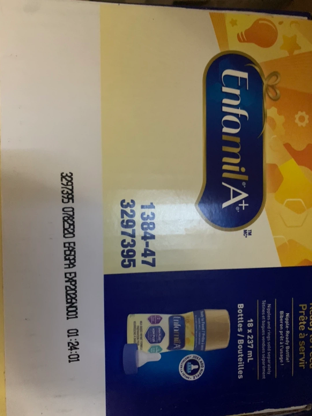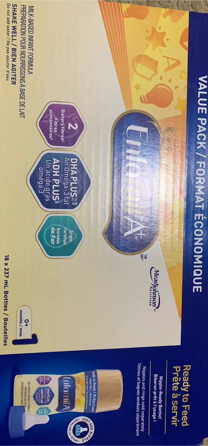 Selling a pack of Enfamil A+ Ready to Feed infant formula. This value pack contains 18 bottles, each 237 mL. It's suitable for babies aged 0+ months. The expiration date is November 1, 2026