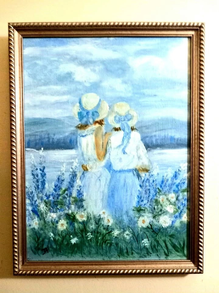 Famous two sisters original antique oil painting, framed, signed, 17.5x13.5 inches. Only $30 firm. We also have 85 pieces of original vintage and antique oil paintings in our family collection of 45 years, in our at-home art sale at unbelievably low prices, $20 and up.