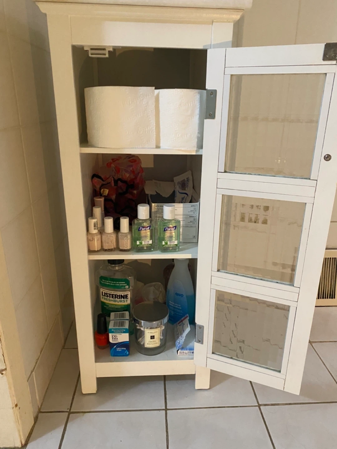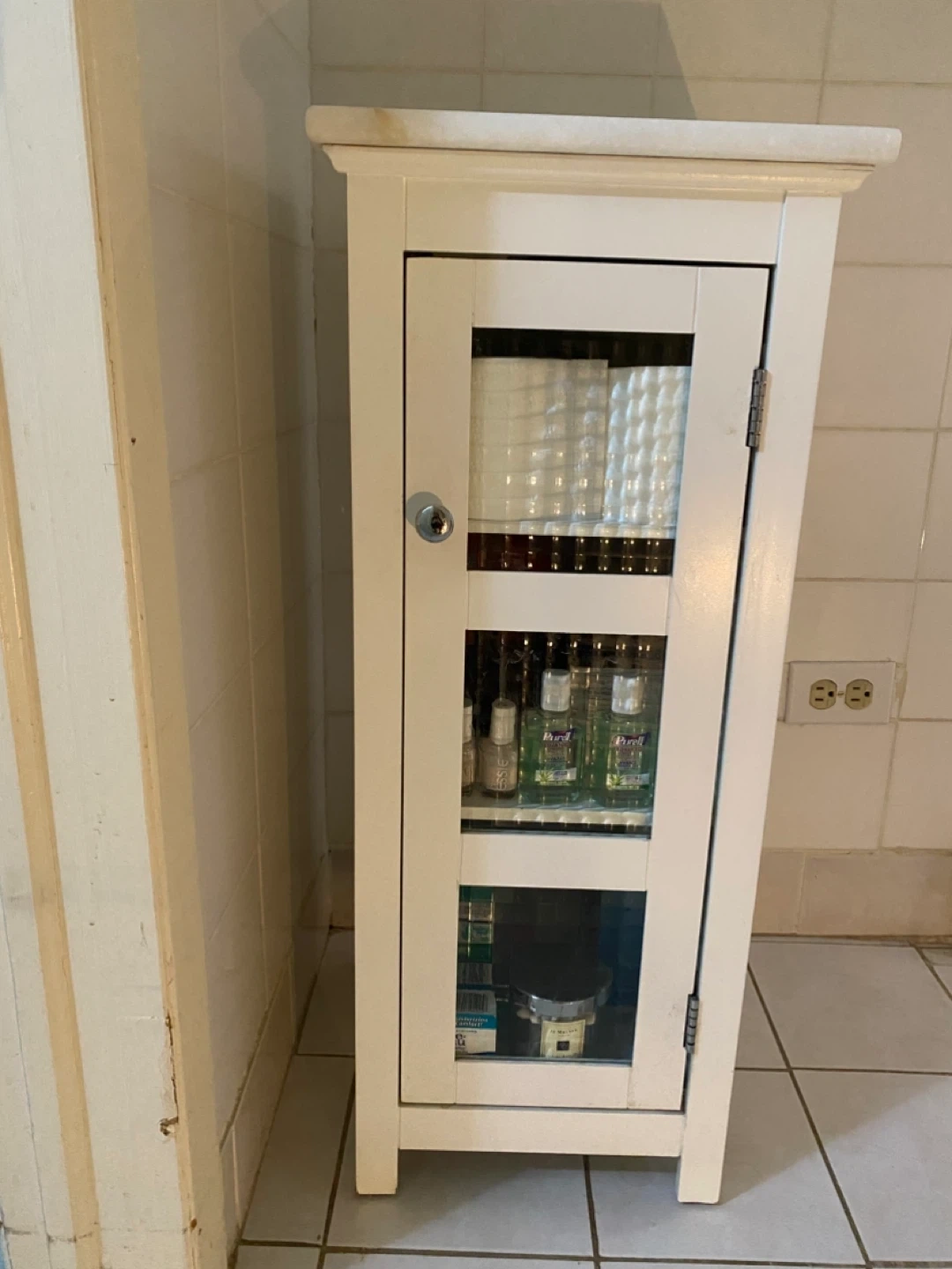 Selling a bathroom cabinet in good condition! It's white with a glass door, perfect for storing your essentials. Great for keeping things organized and tidy in your bathroom