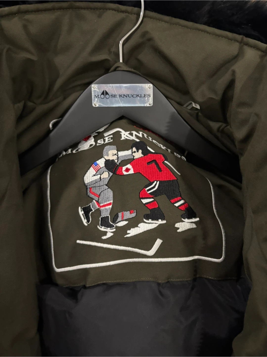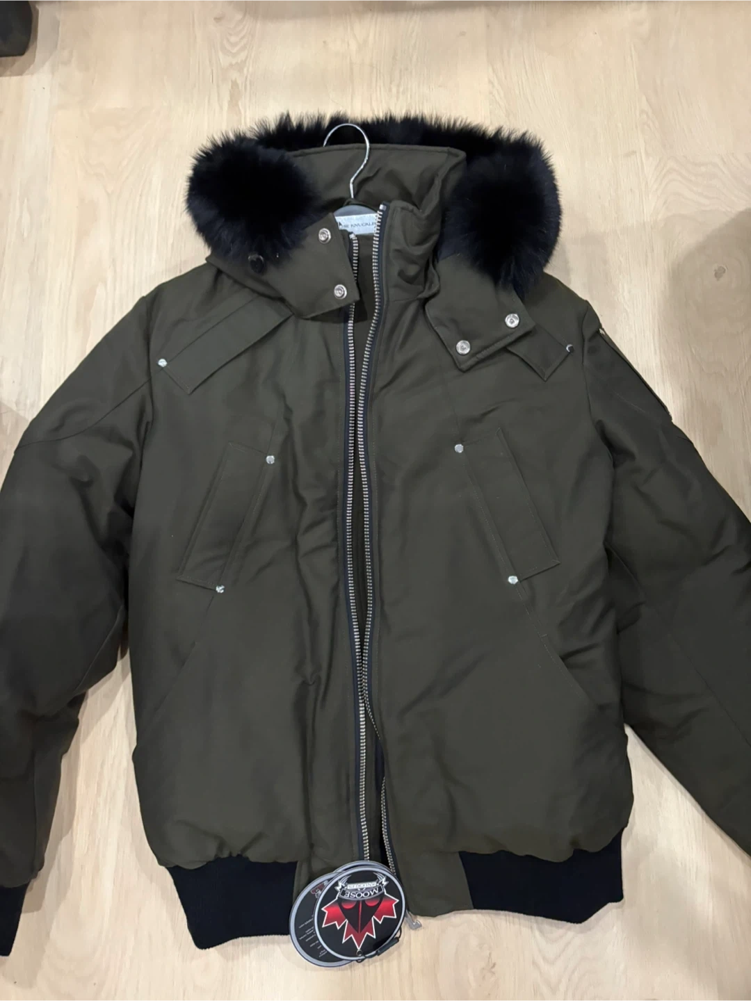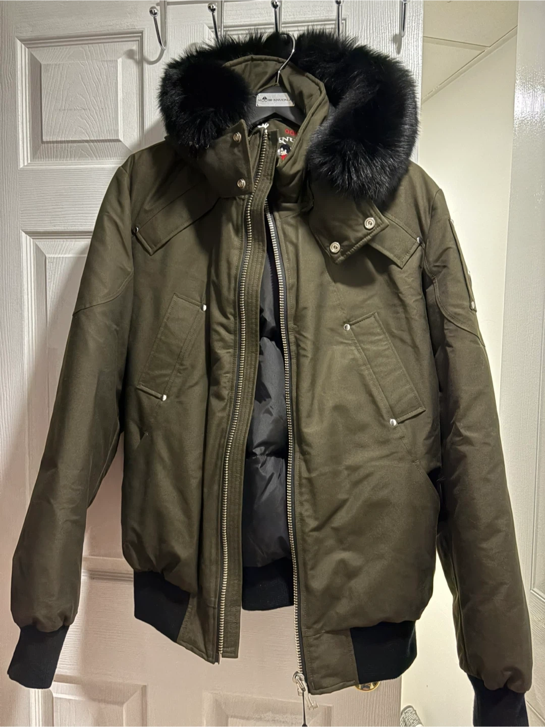 Selling a Moose Knuckles bomber jacket in olive green. It's in great condition and ready for a new owner! The jacket features a fur-trimmed hood and the iconic Moose Knuckles logo on the sleeve. Perfect for staying warm and stylish during the colder months