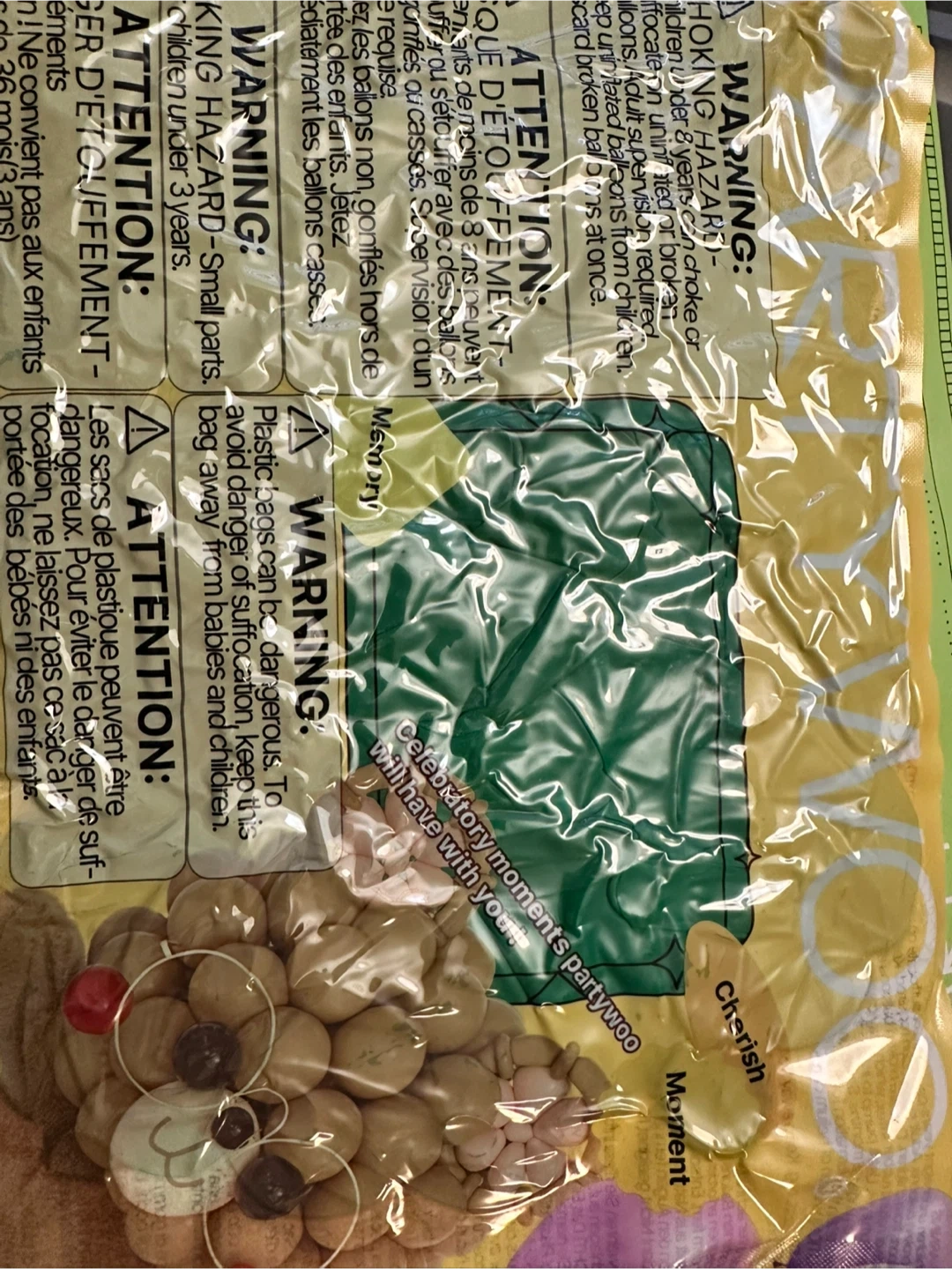 I'm selling a Partywoo balloon set, perfect for celebratory moments! The package includes different size balloons to make your party extra special. Please be aware of the warning labels regarding choking hazards for young children.