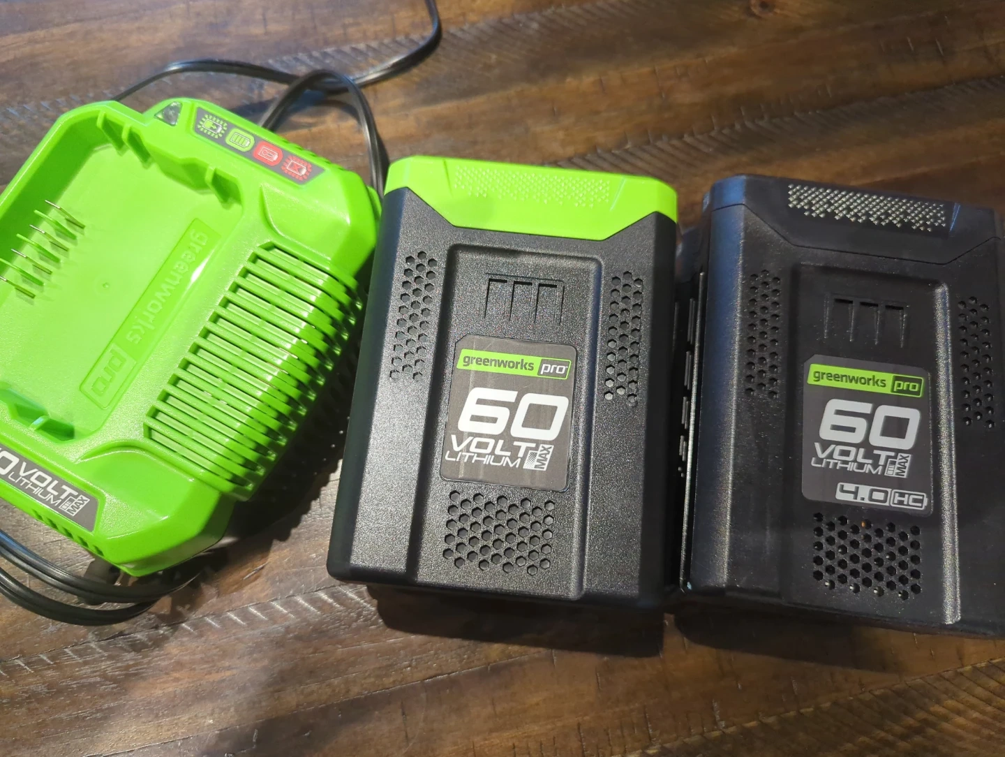 All ate brand new - never used! Selling 2x Greenworks Pro 60V batteries + their charger. Works for all Greenworks tools. Price includes all 3 items.