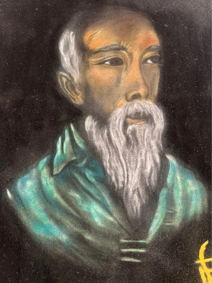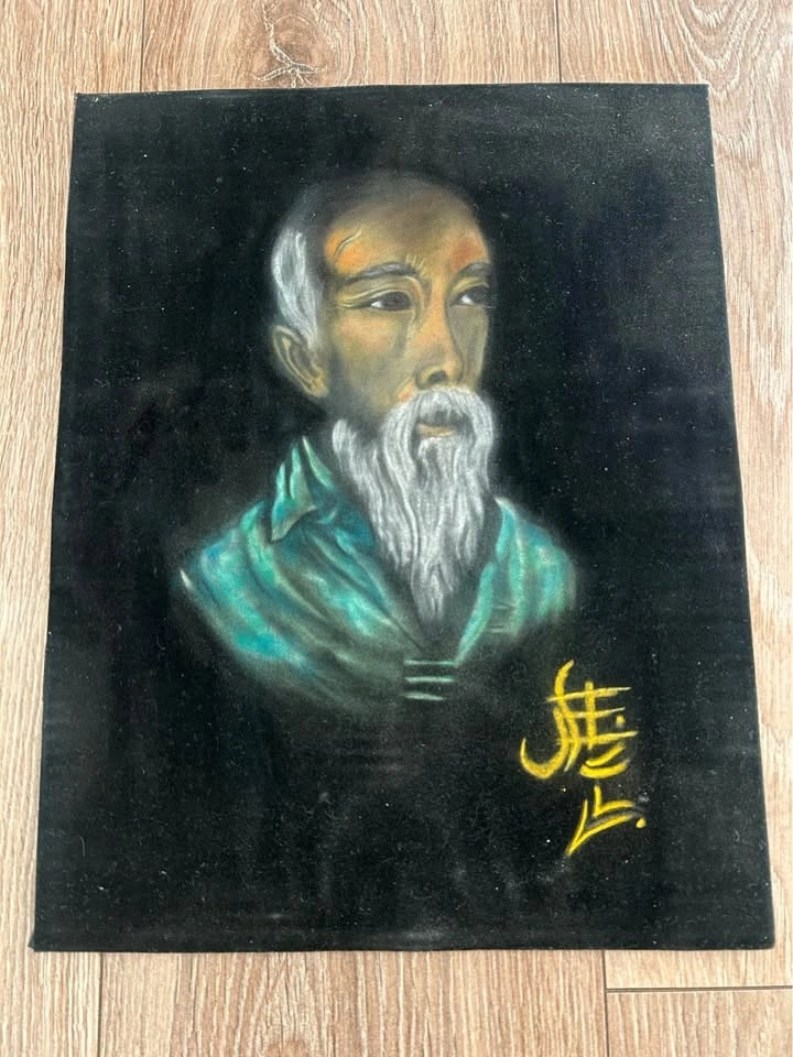 Original mid-century art portrait depicting an elderly East Asian scholar or sage, hand-executed on black velvet. The work features a contemplative expression, elongated white beard, and flowing robe, rendered in soft pastel-like pigments typical of velvet painting techniques popular in North America during the post-war period.