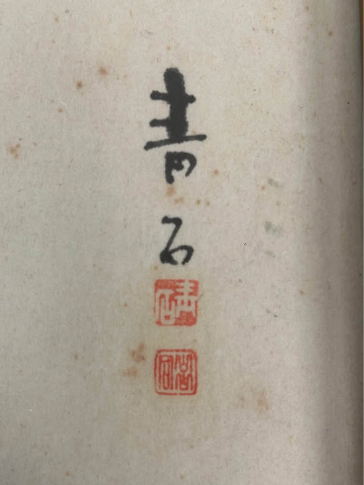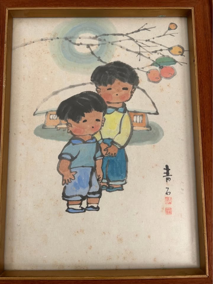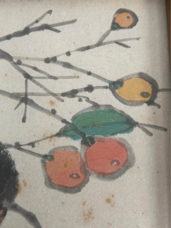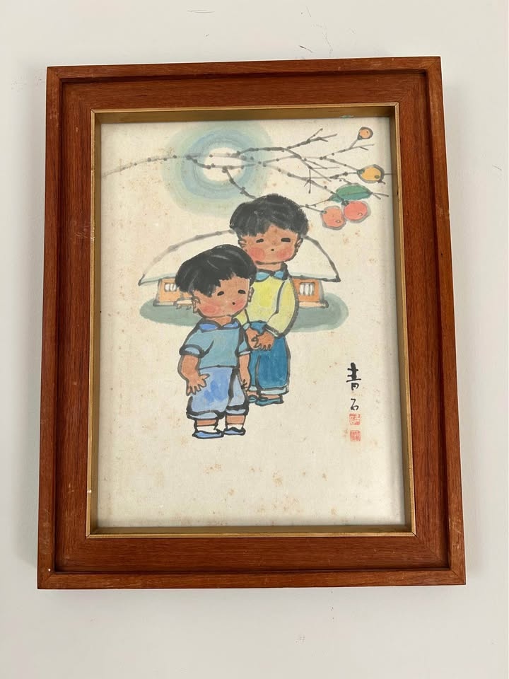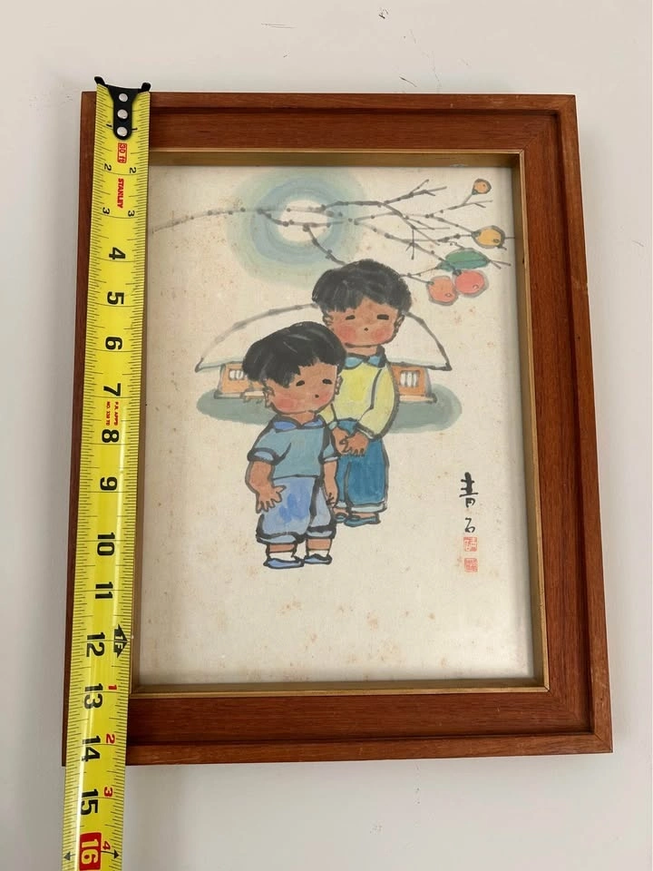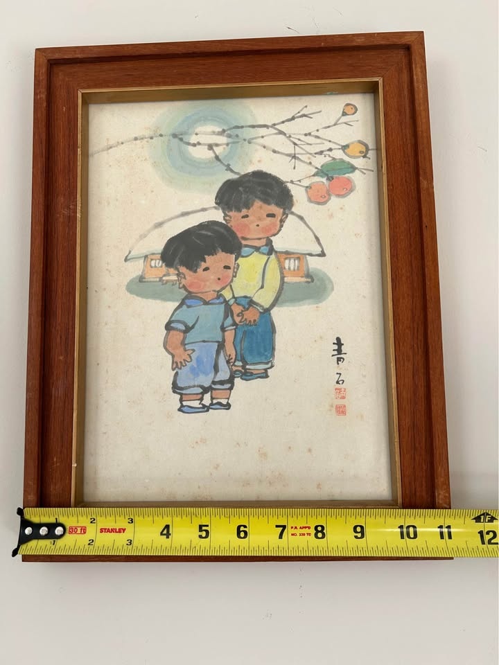 Presented in a vintage wooden frame with original glass and mat. The piece displays natural age-related toning to the paper, consistent with vintage works, and adds warmth and authenticity to its overall appearance. A lovely collectible example suitable for folk art collectors, Asian-inspired interiors, or vintage décor enthusiasts.